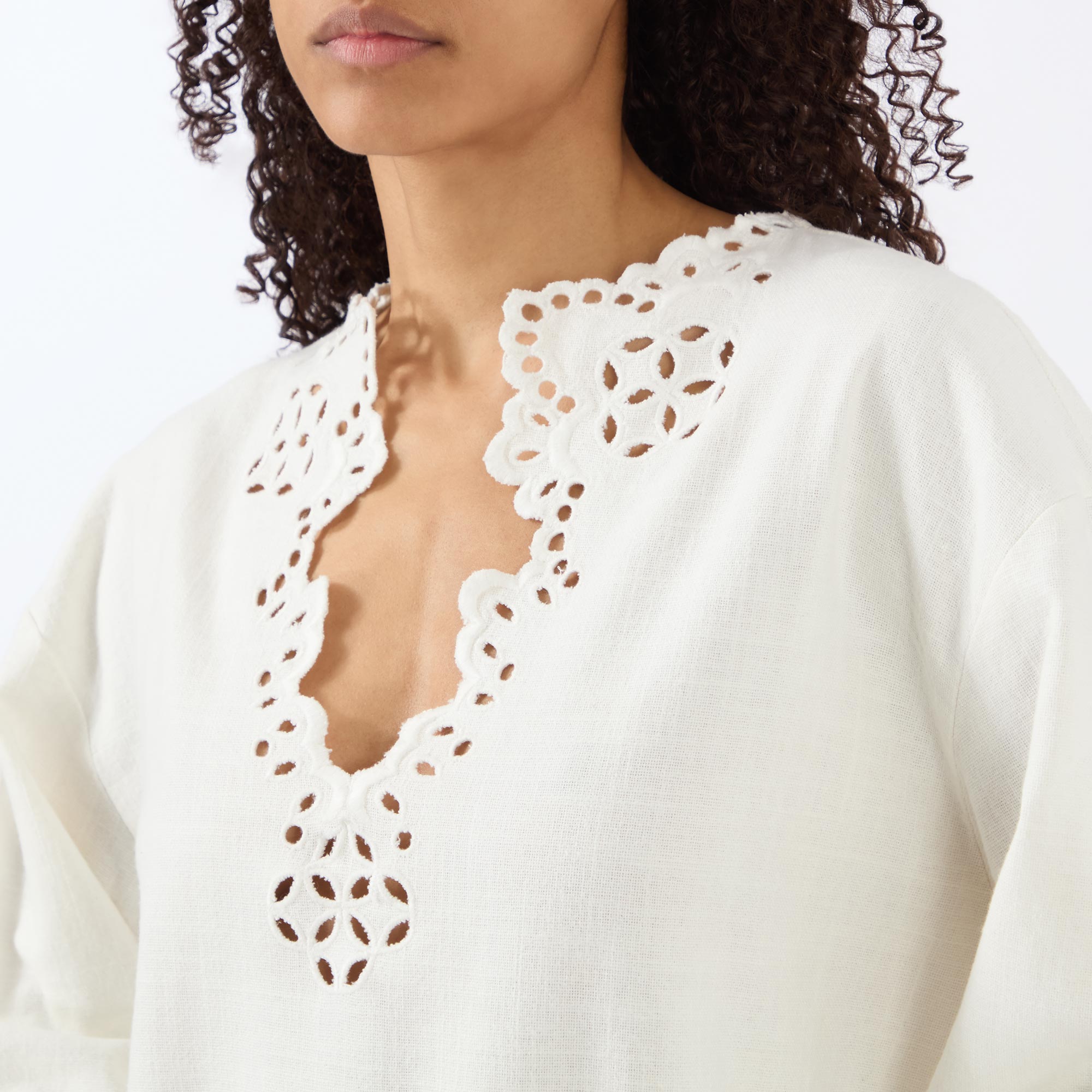 • Plunging V-neckline, dropped shoulders, long sleeves, scalloped trim detailing, cut-out embroidered design, textured finish, mini length