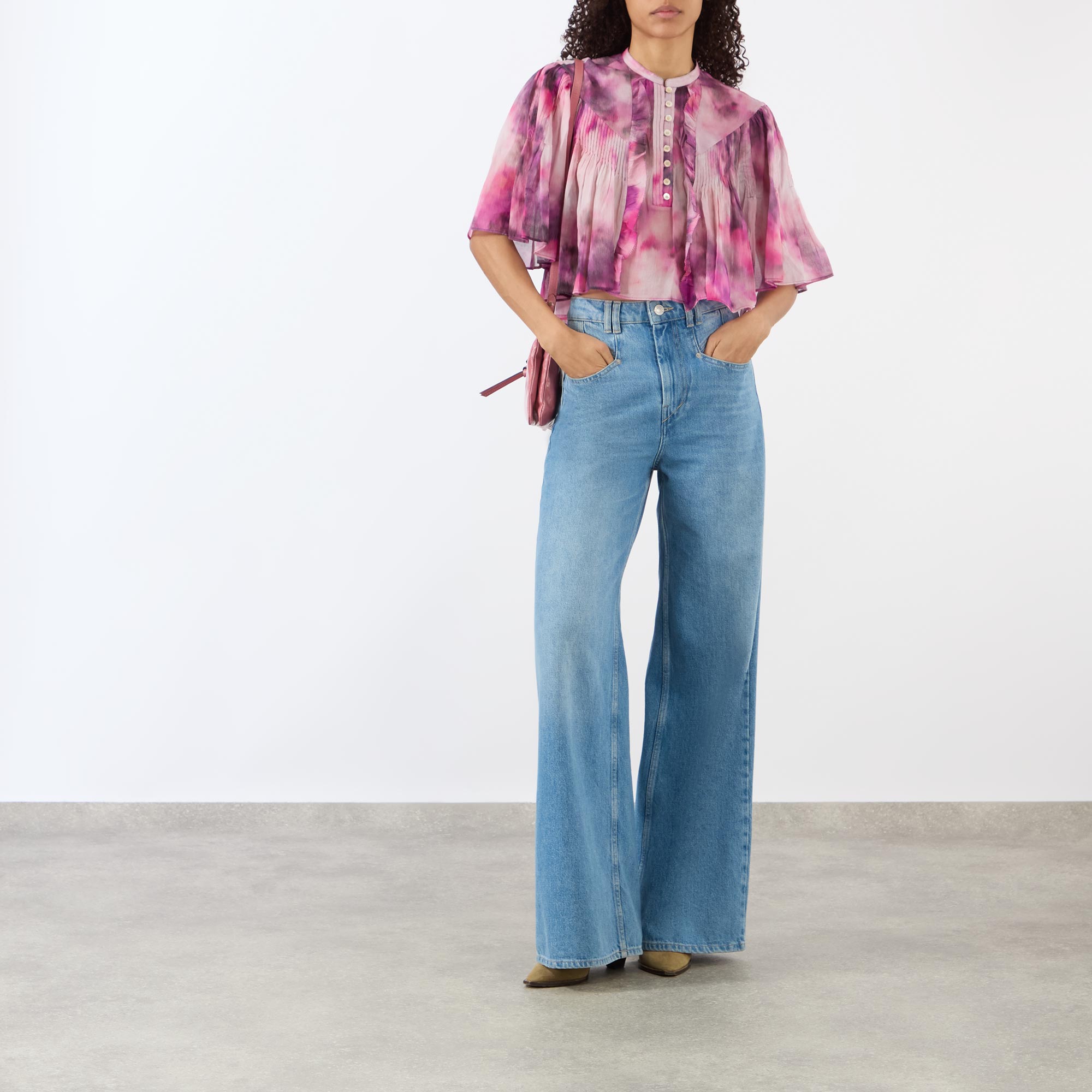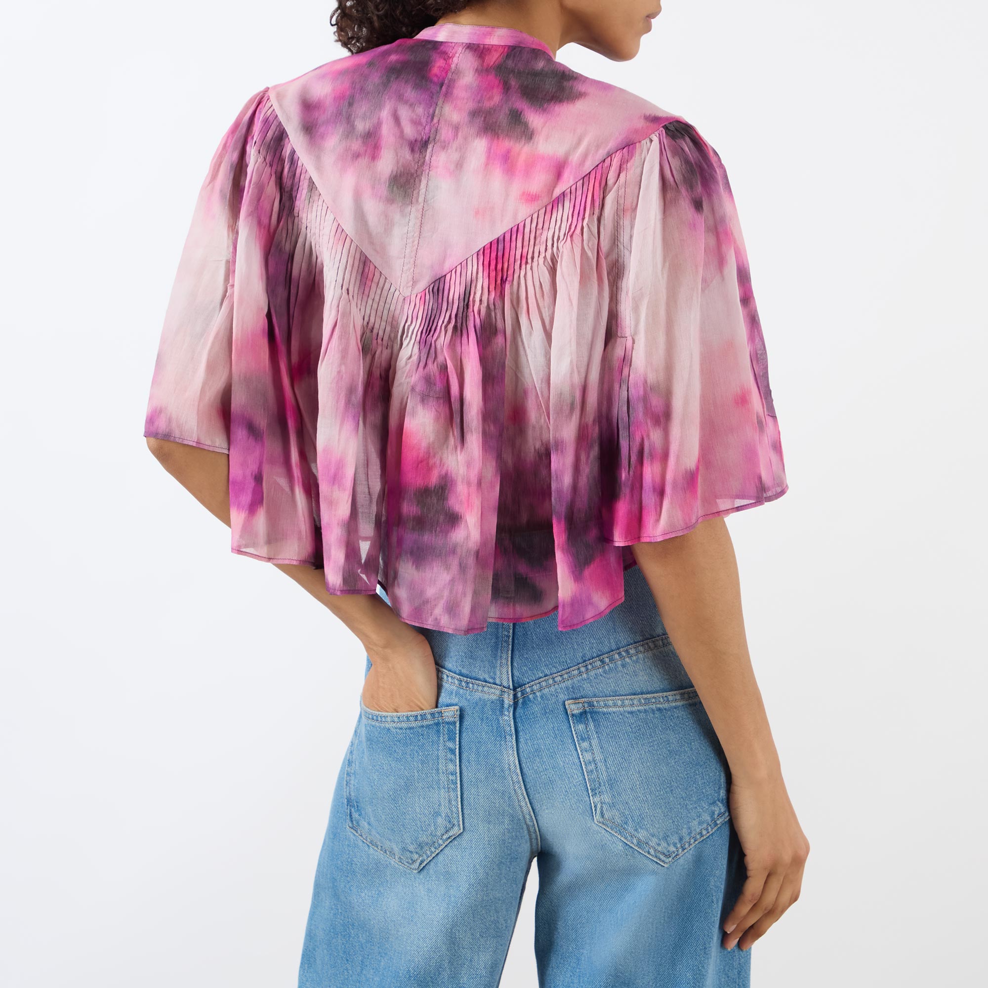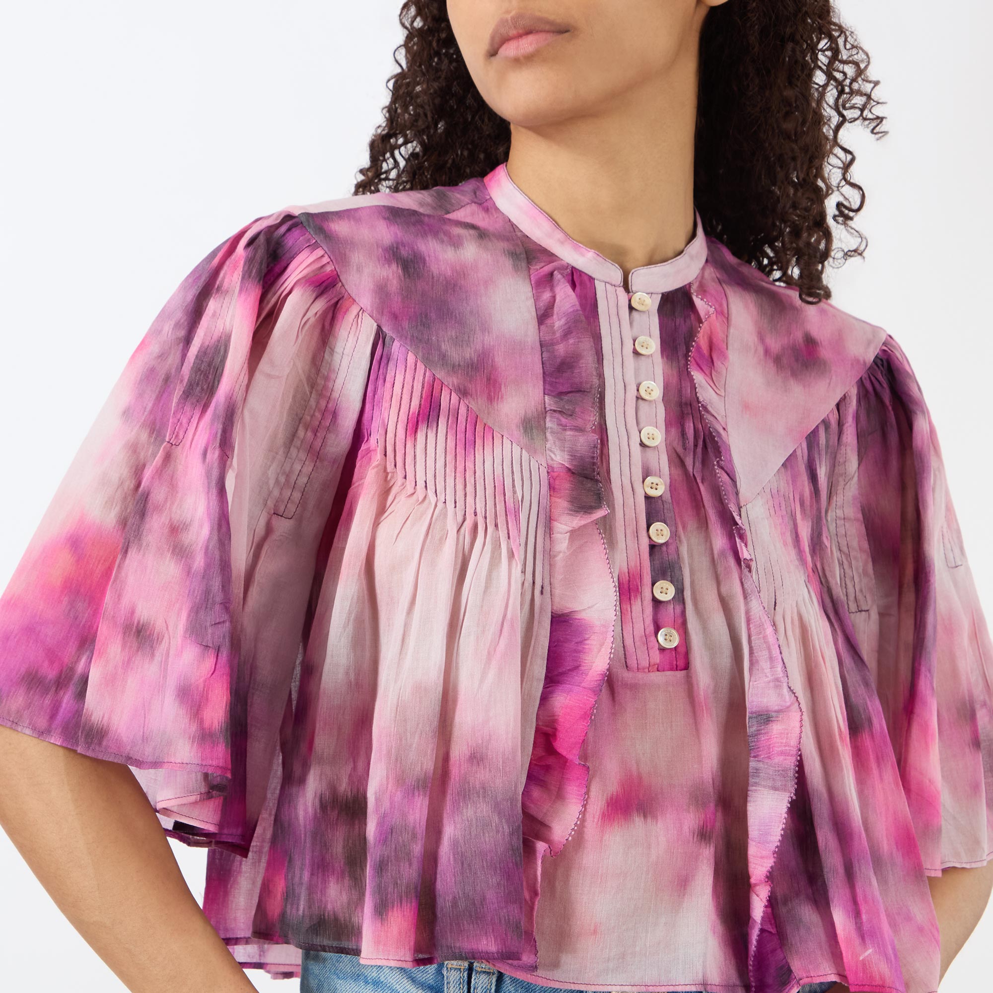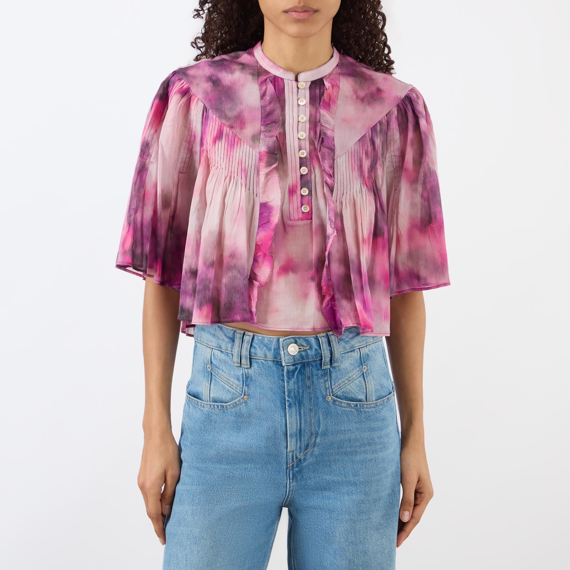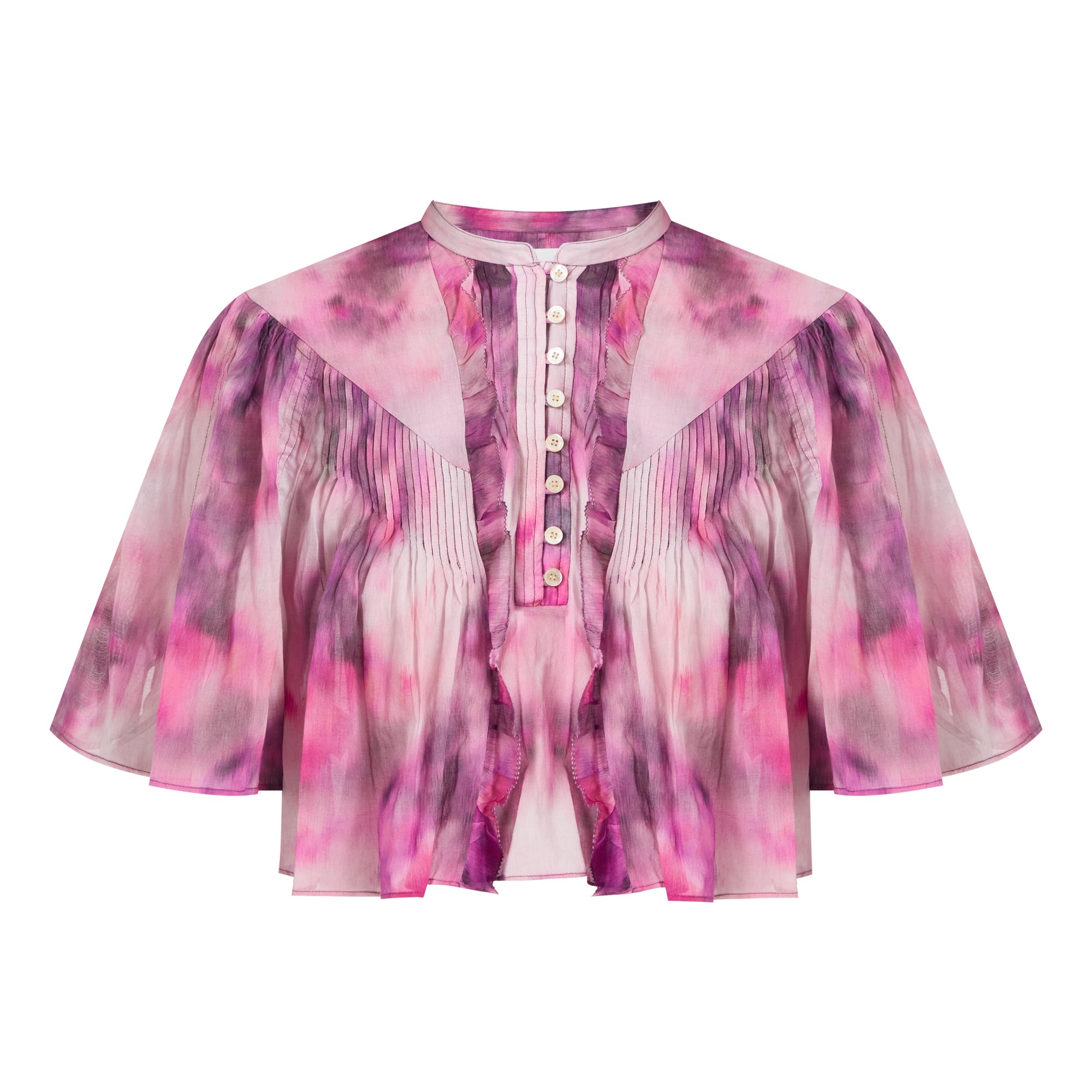 - Stand collar, short billow sleeves, half placket fastening, flared hem, cropped length, pleating and ruffle detailing throughout, soft printed pattern, semi-sheer finish