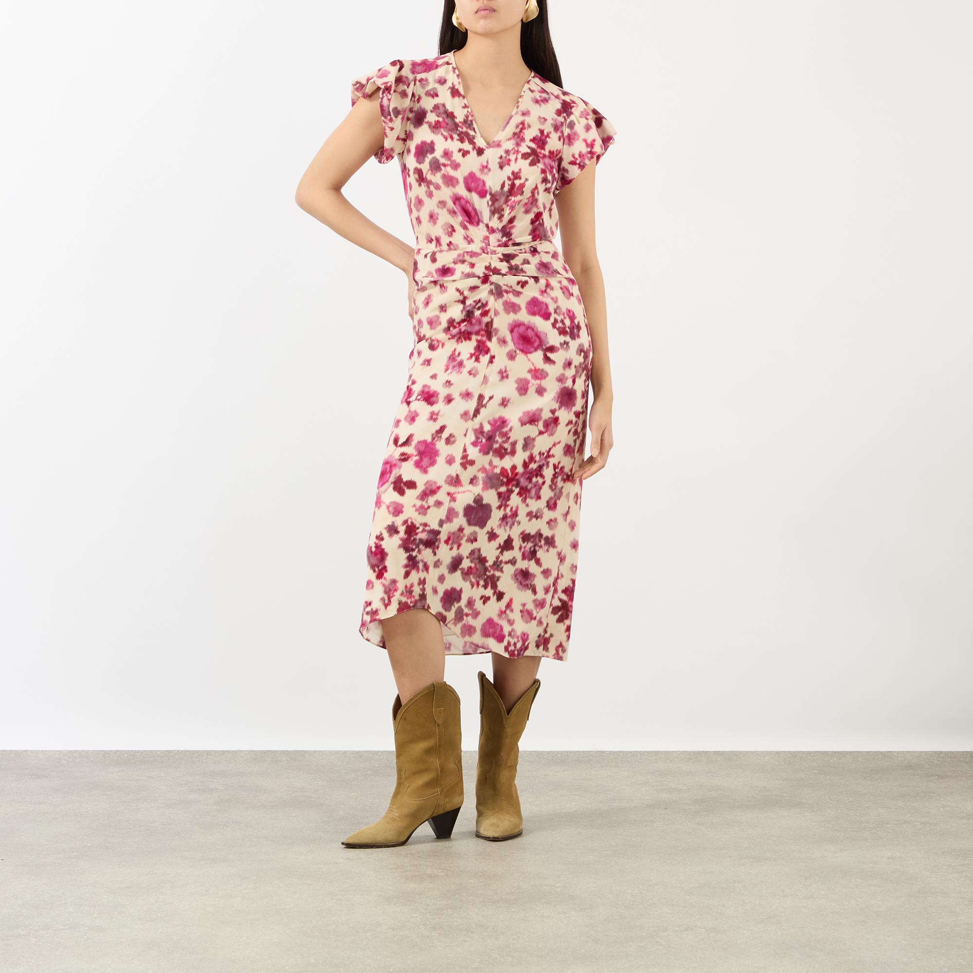 This season, Isabel Marant’s signature florals take on new form- scattered like tiny polka dots across draped silhouettes and blurred for a softly smudged effect. The Terenae dress fits the bill; cut from a luxurious blend of silk, short puff sleeves, and V-neckline set the stage for a blurred floral motif, while gentle gathering at the waist releases into an elegant, asymmetric midi hemline.