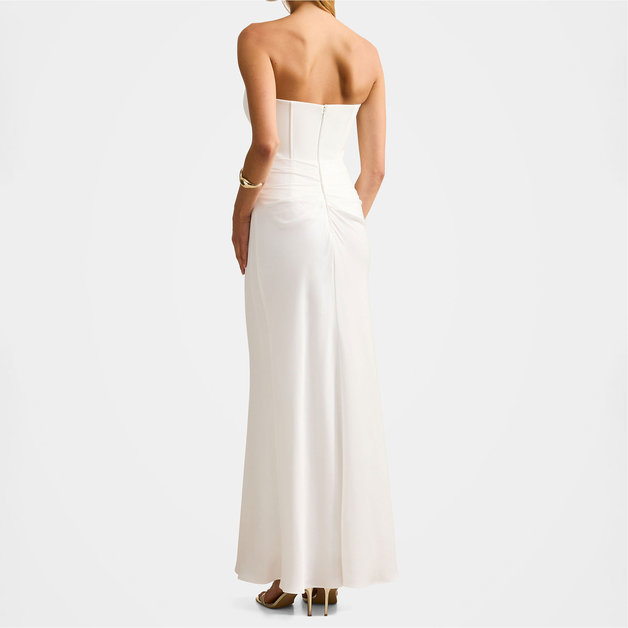 - Flattering fitted silhouette, corset style front, strapless, soft ruching at the waist for a defined look, subtle flowing hem, concealed zip fastening at the rear