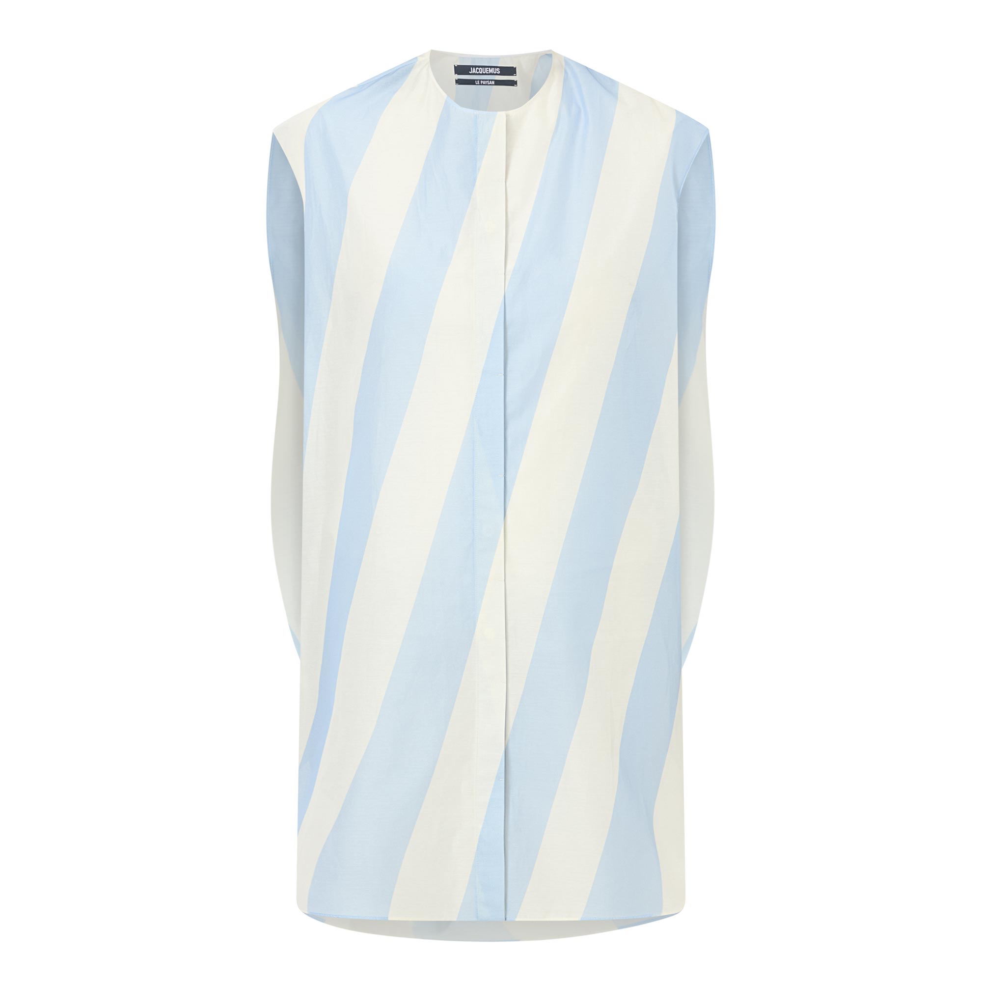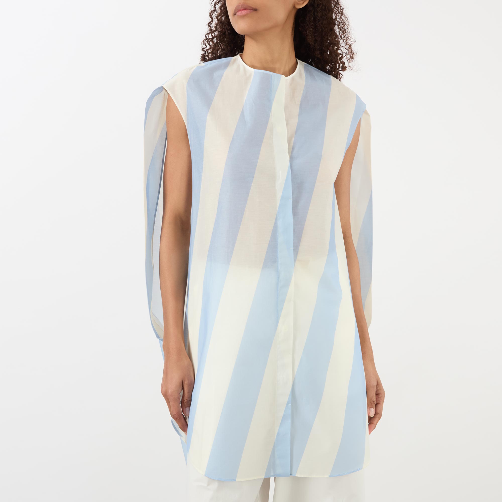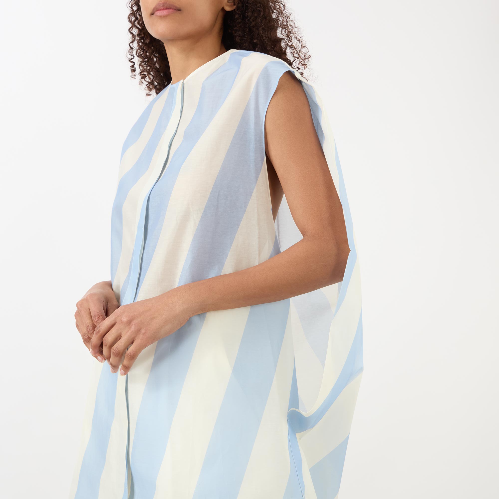 - Round neckline, concealed button fastening placket, sleeveless, oversized arm holes, mini length, rounded back yoke, slanted stripe pattern