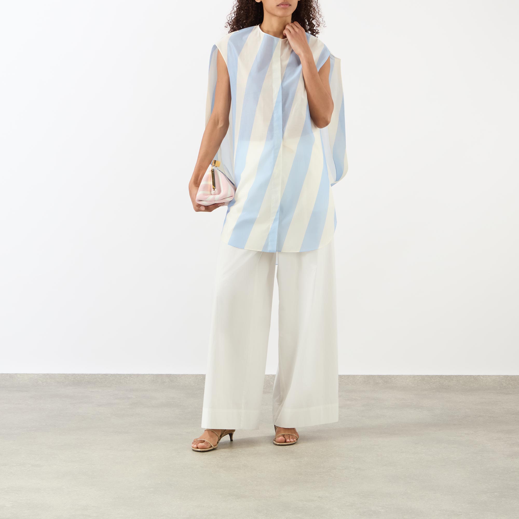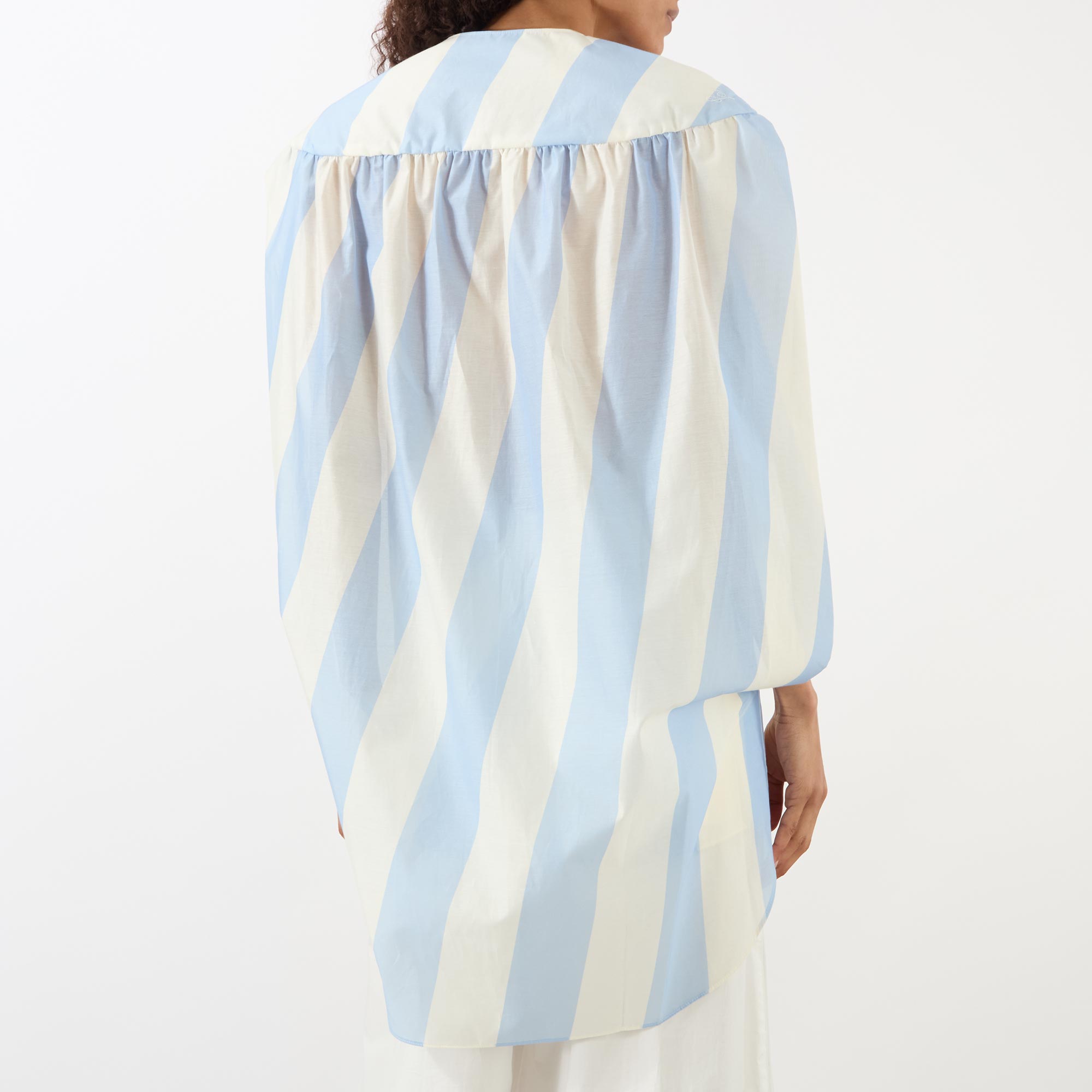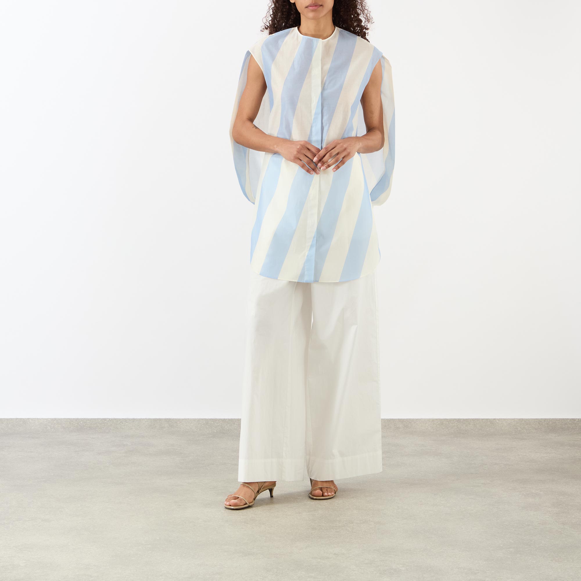 - Round neckline, concealed button fastening placket, sleeveless, oversized arm holes, mini length, rounded back yoke, slanted stripe pattern