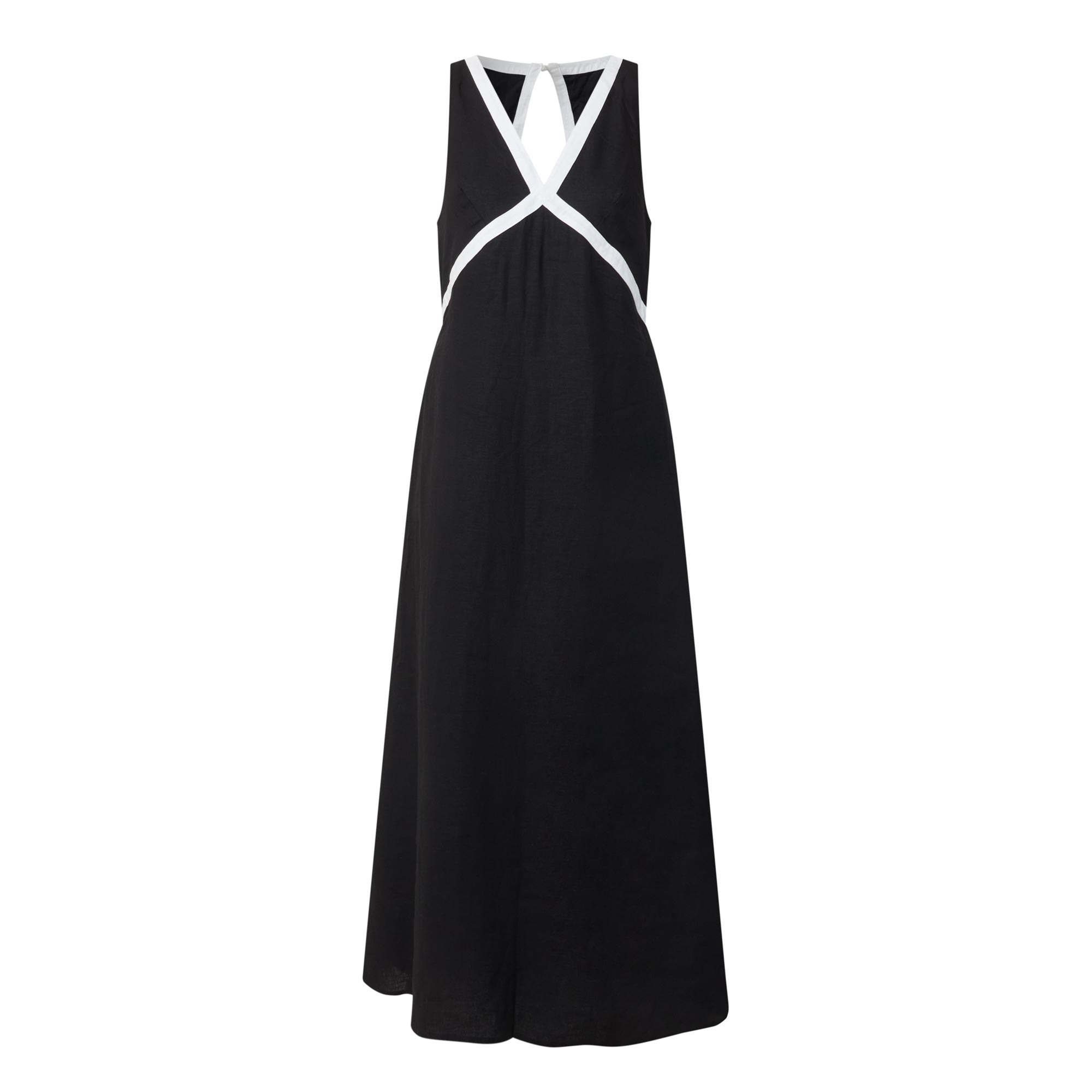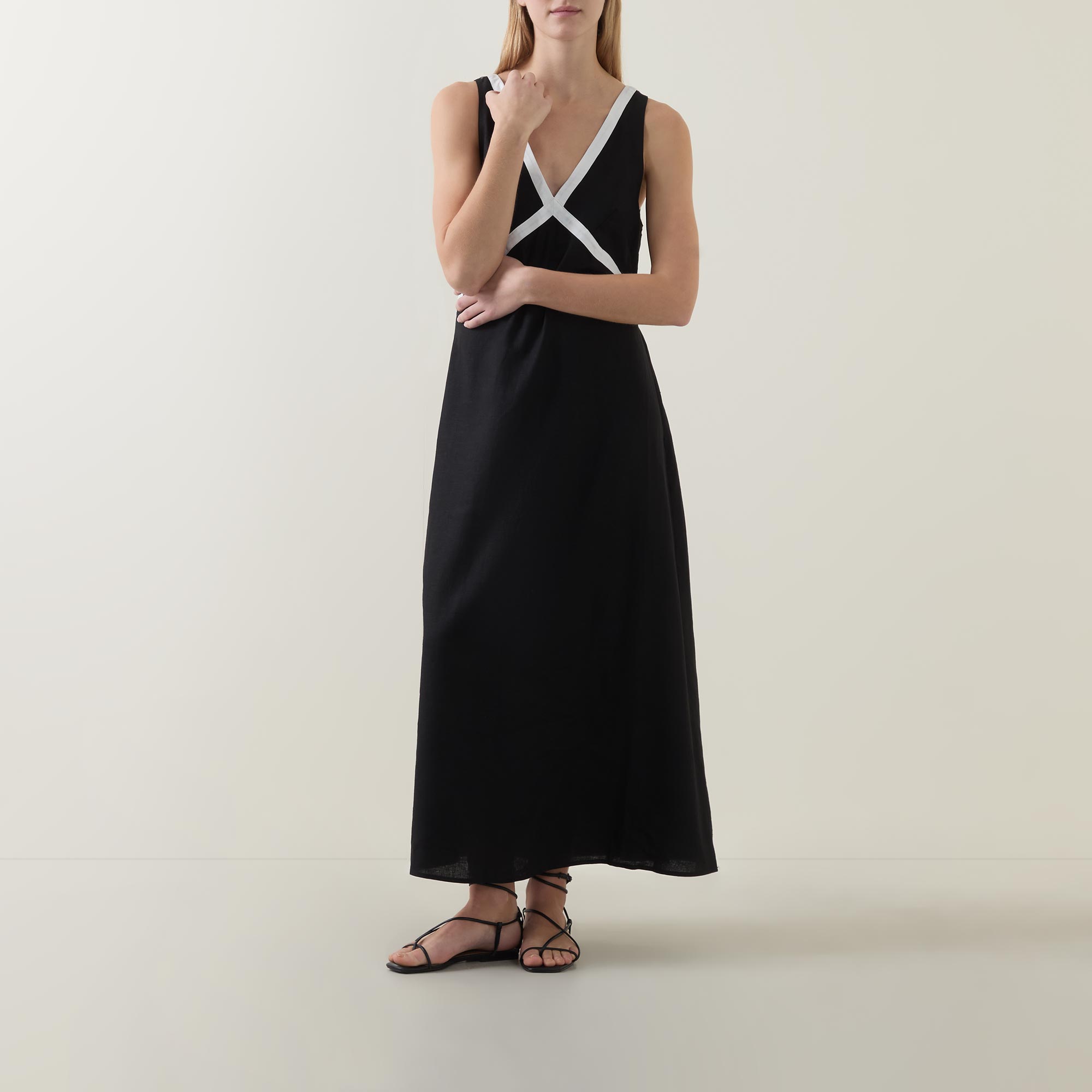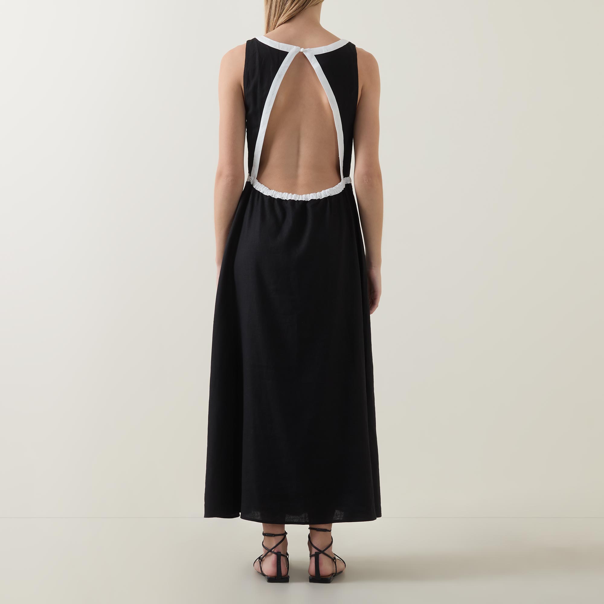 - V-neckline, sleeveless, maxi length, open-back, button and loop fastening, contrast detailing