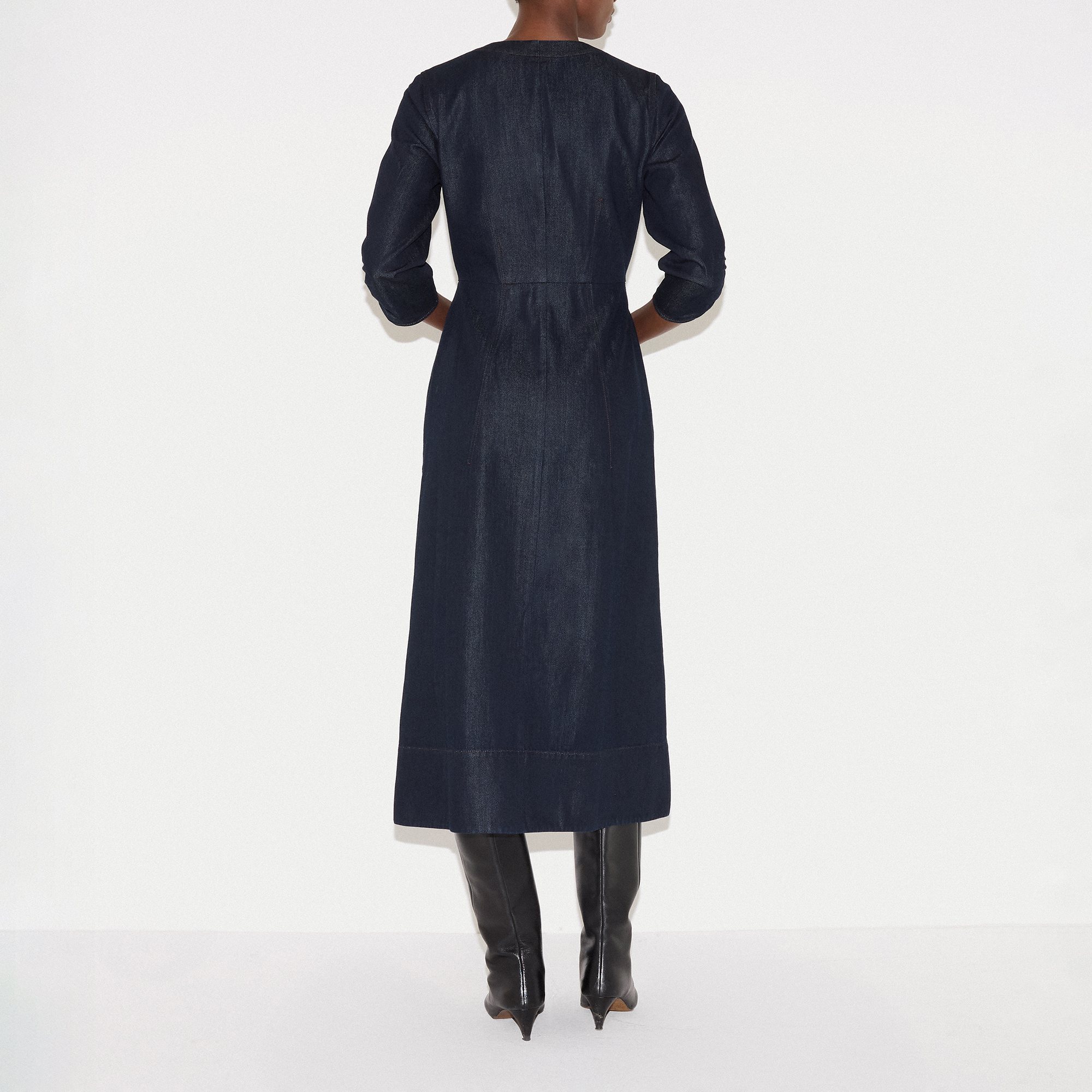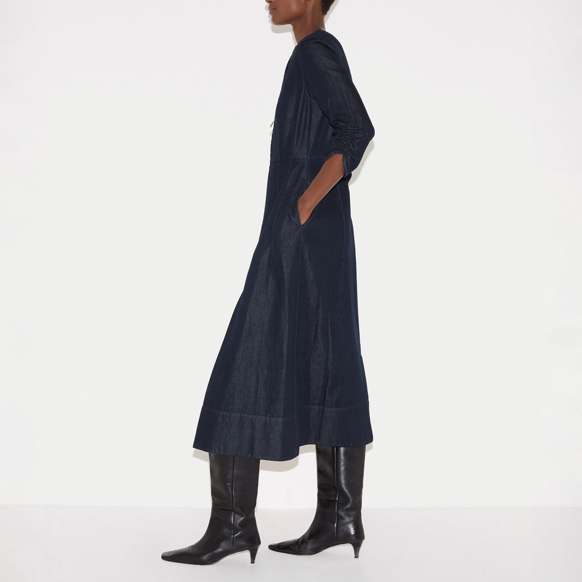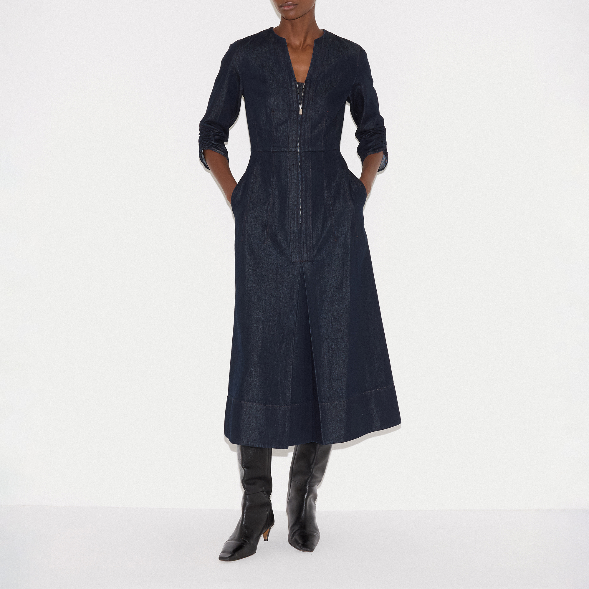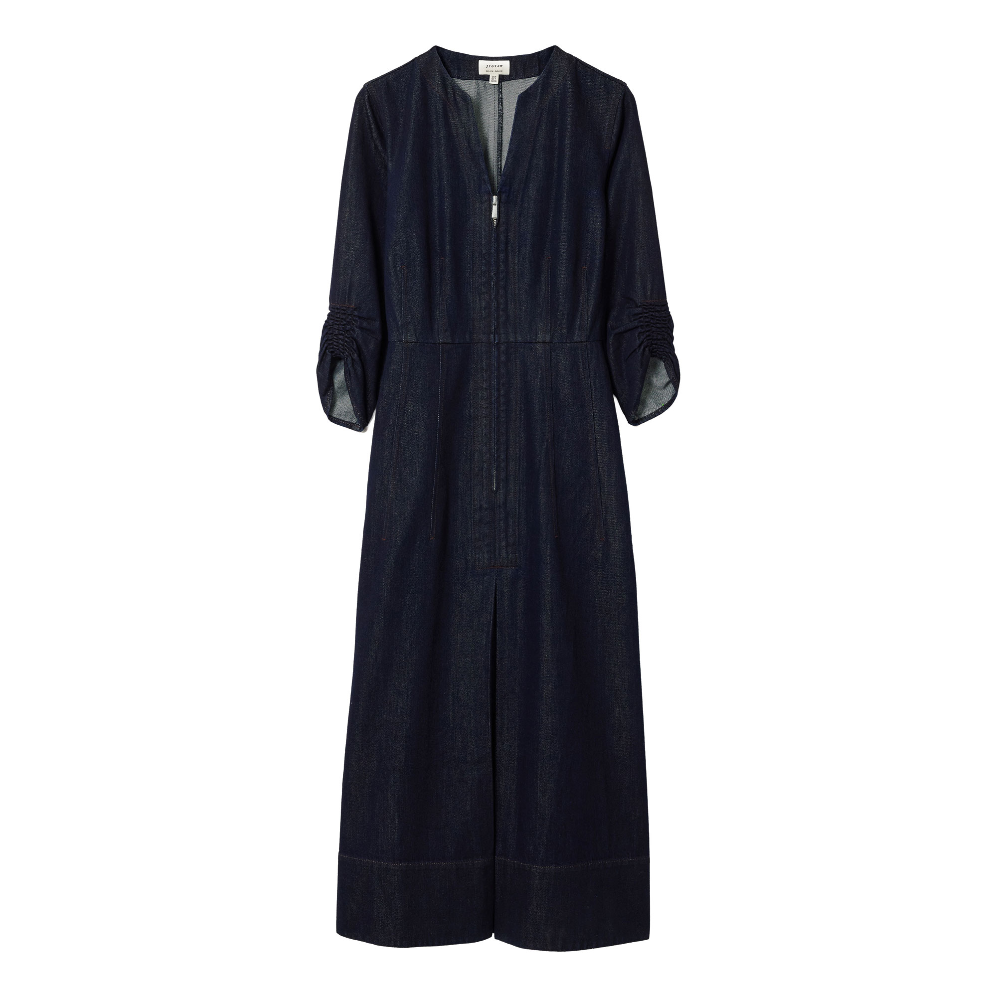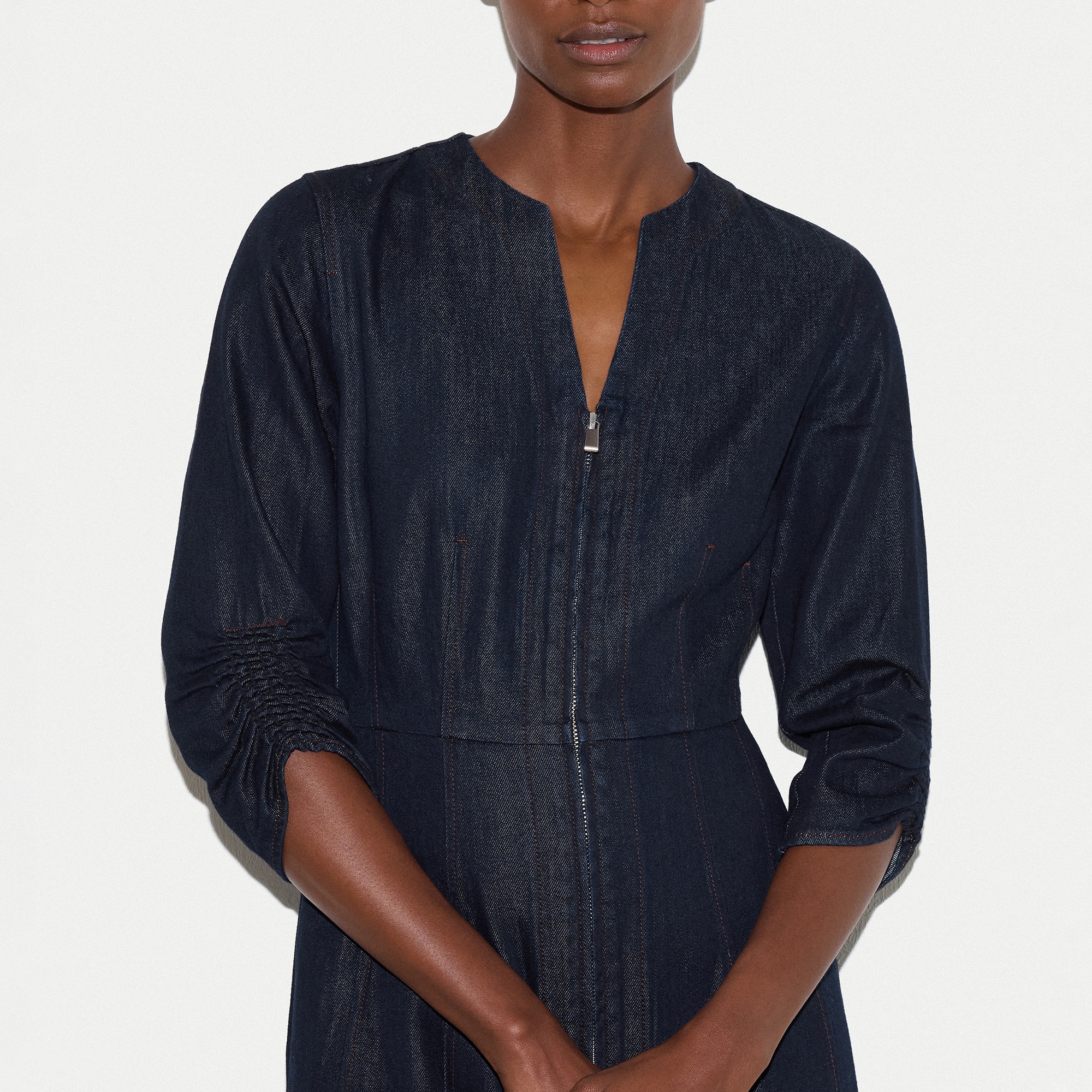• Chambray fabric, zip front, midi length, gathered cuffs, sleeves, V-neckline