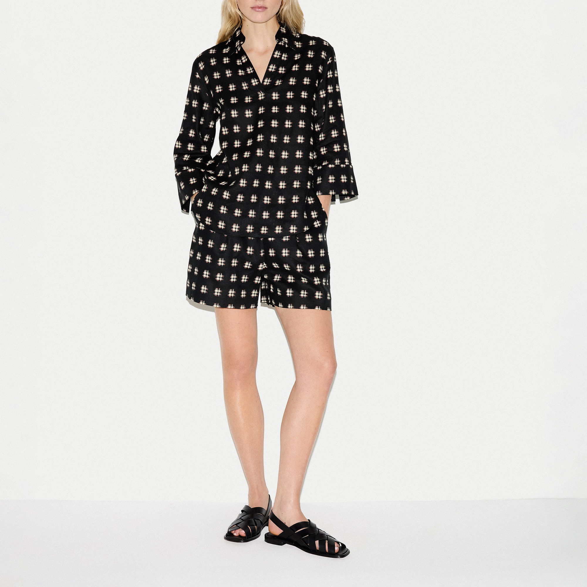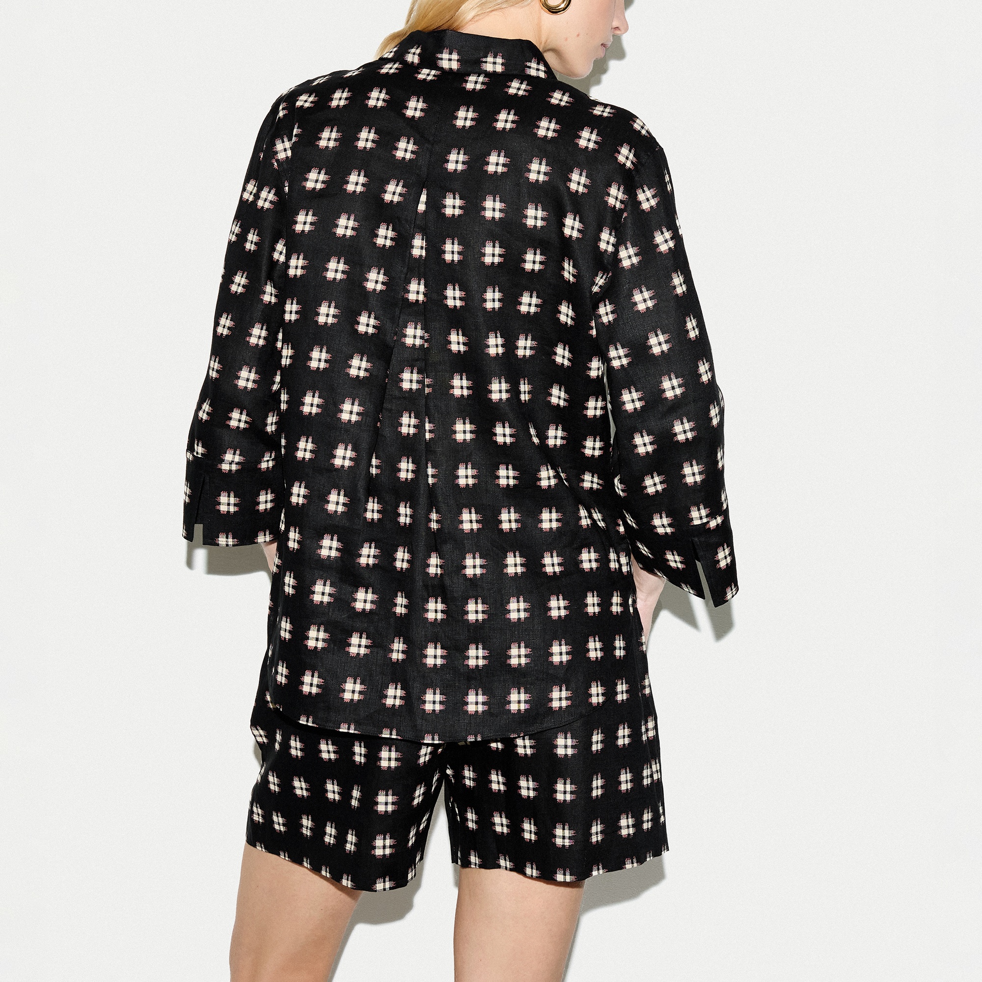 - Linen construction, Japanese check pattern, relaxed silhouette, side slits