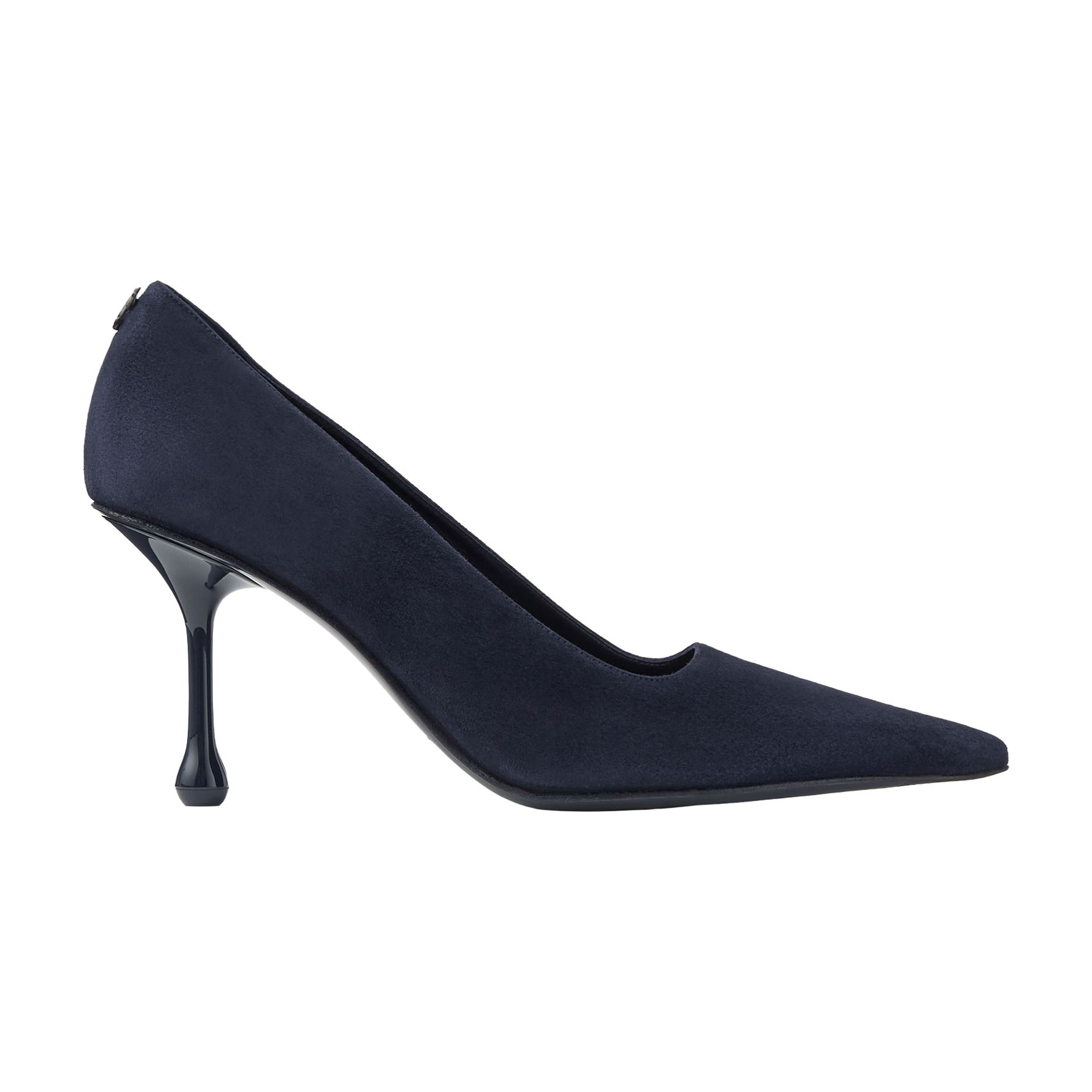 - Suede, drop heel, pointed toe, square vamp, leather lining, leather and rubber sole
