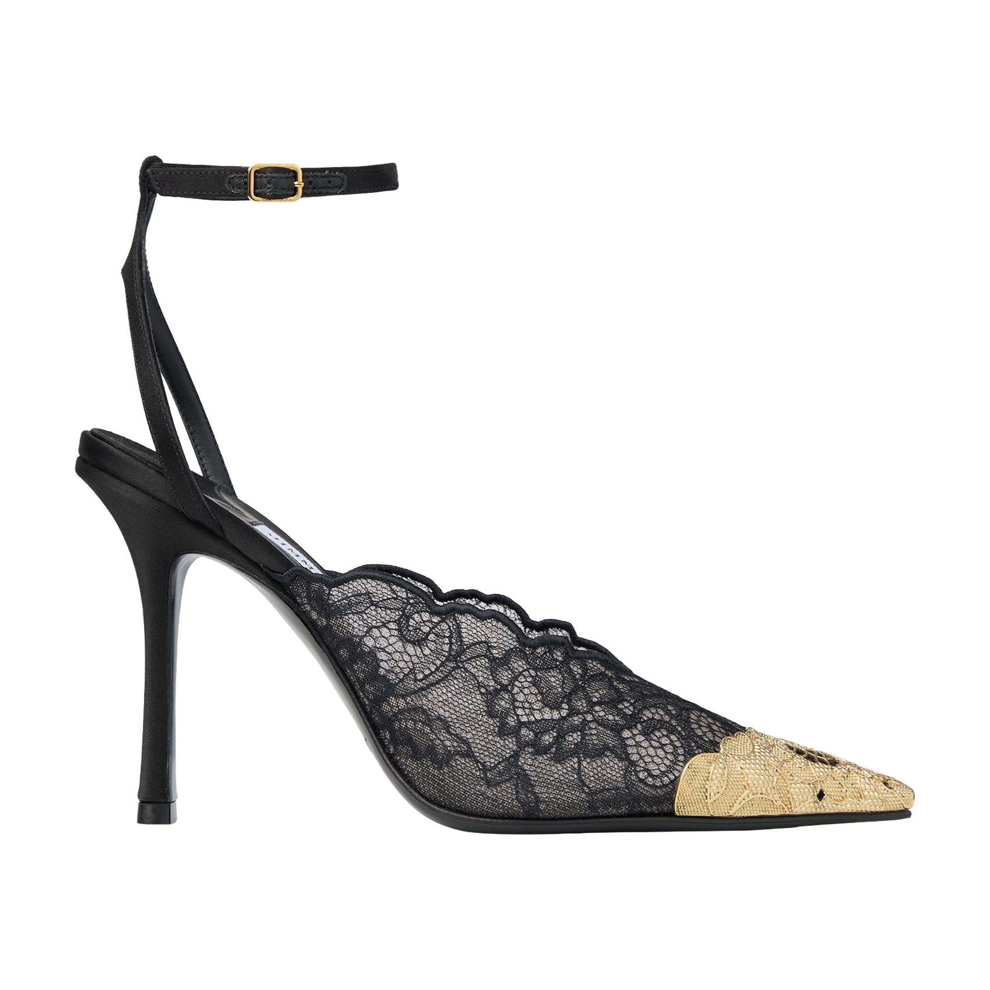 • Lace detailing, gold-tone metal toe cap, stiletto heel, adjustable ankle strap, pointed toe