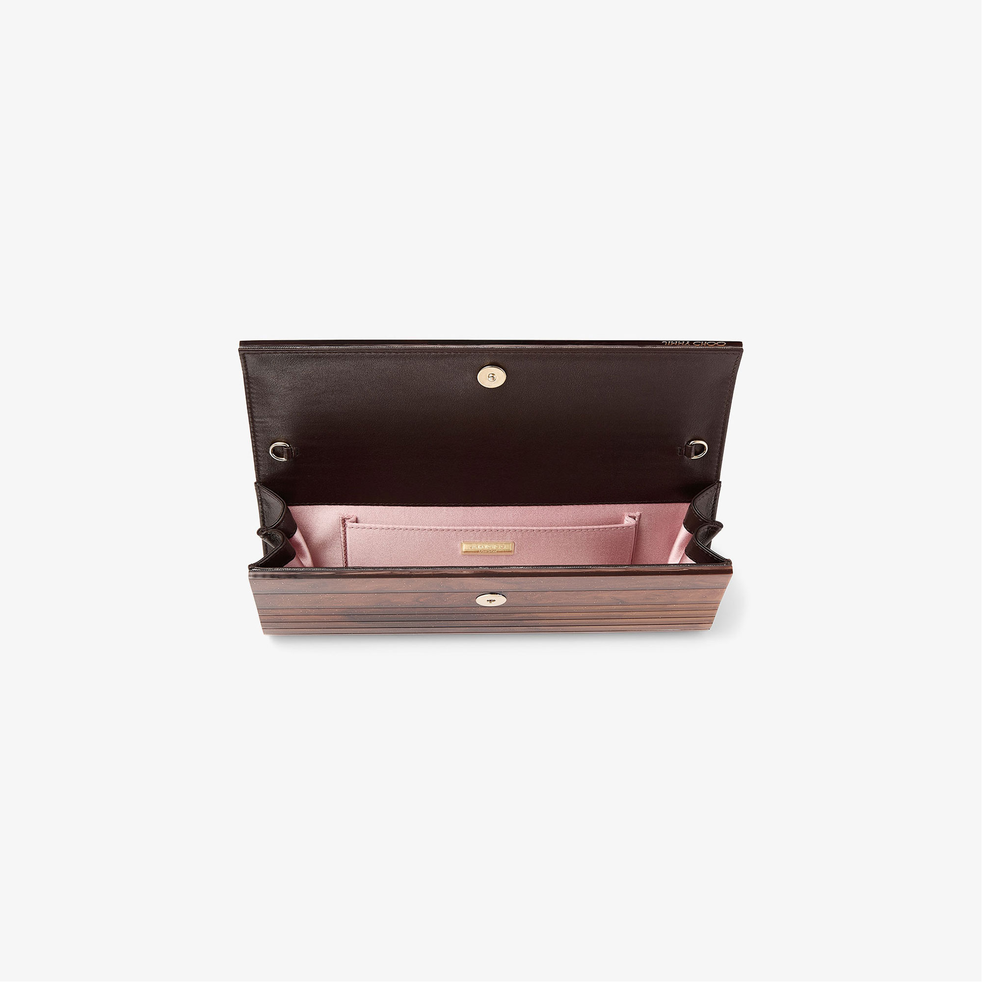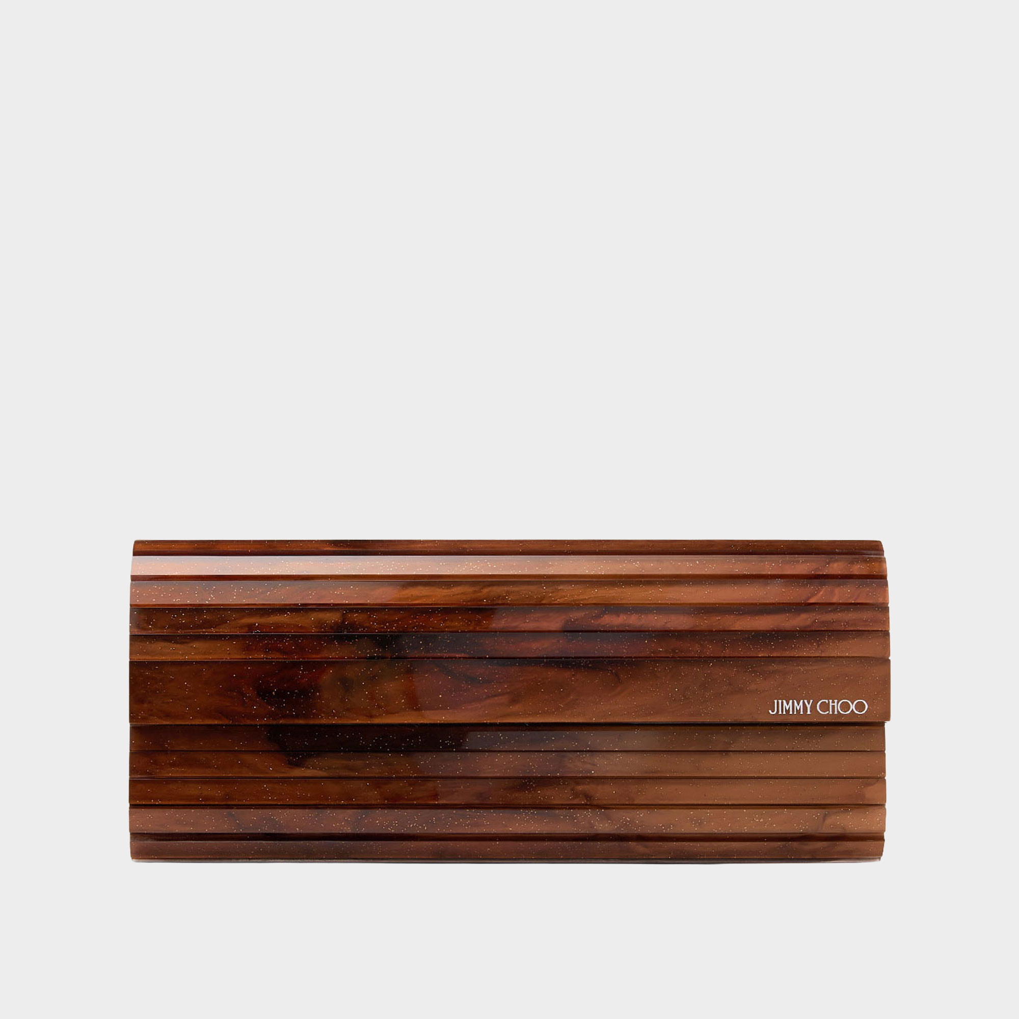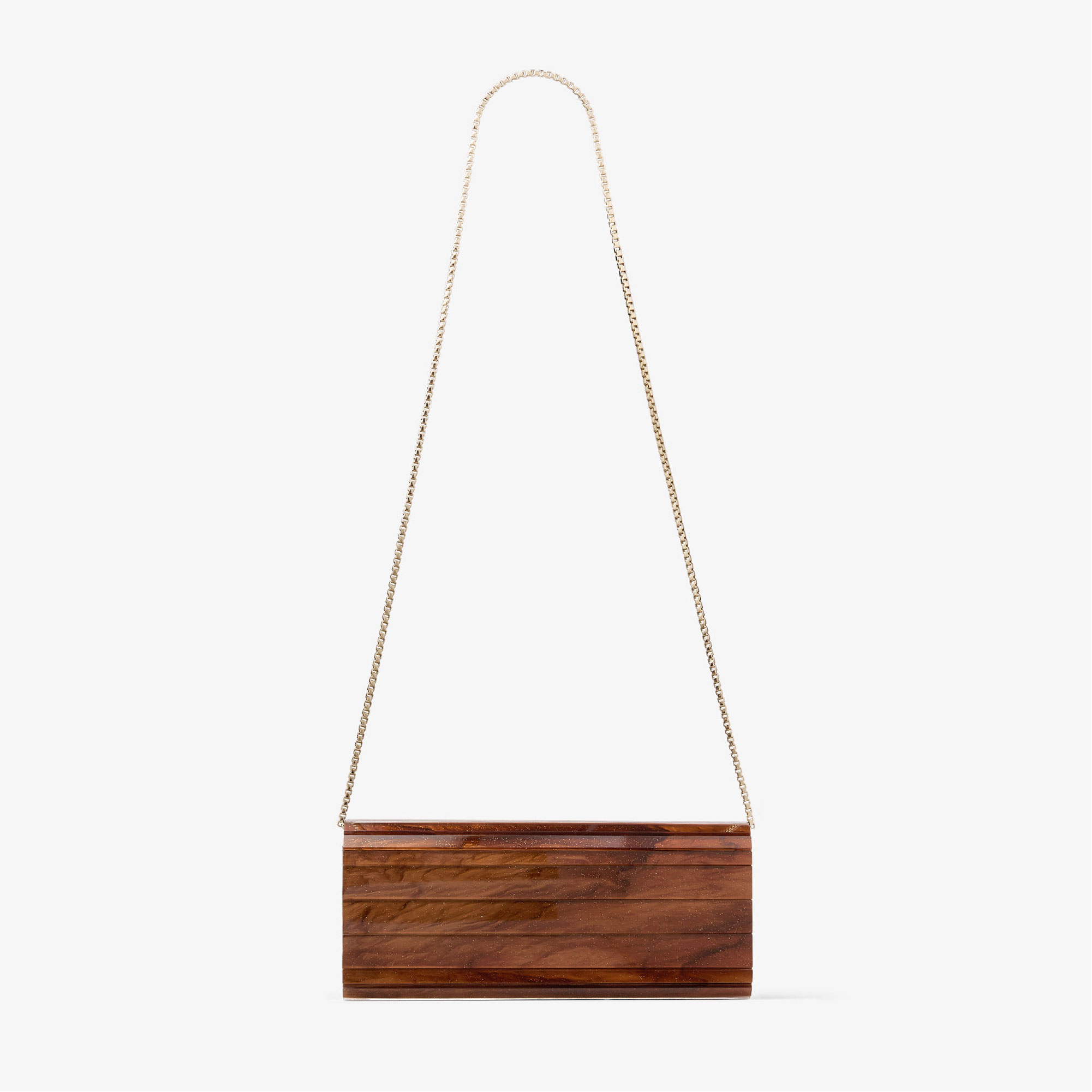 • Marble effect acrylic, lng detachable chain strap, leather side gussets, magnetic snap closure, internal side slit pocket, engraved Jimmy Choo leather plaque