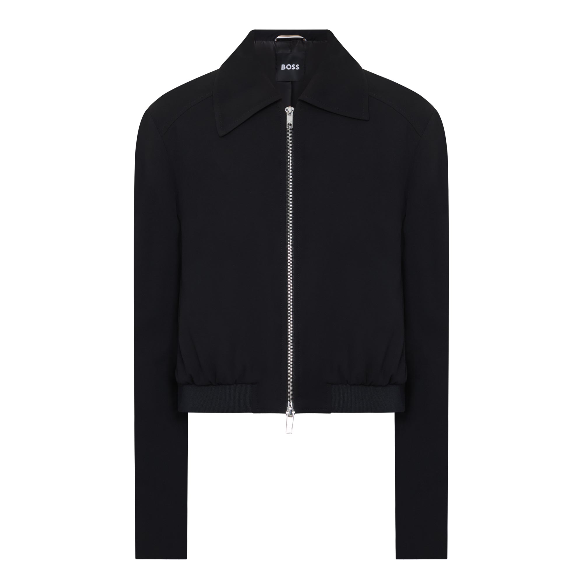 - Point collar, long sleeves, full zip-through fastening, rear logo plaque, two side in-seam pockets, elasticated hem, smooth fabric
