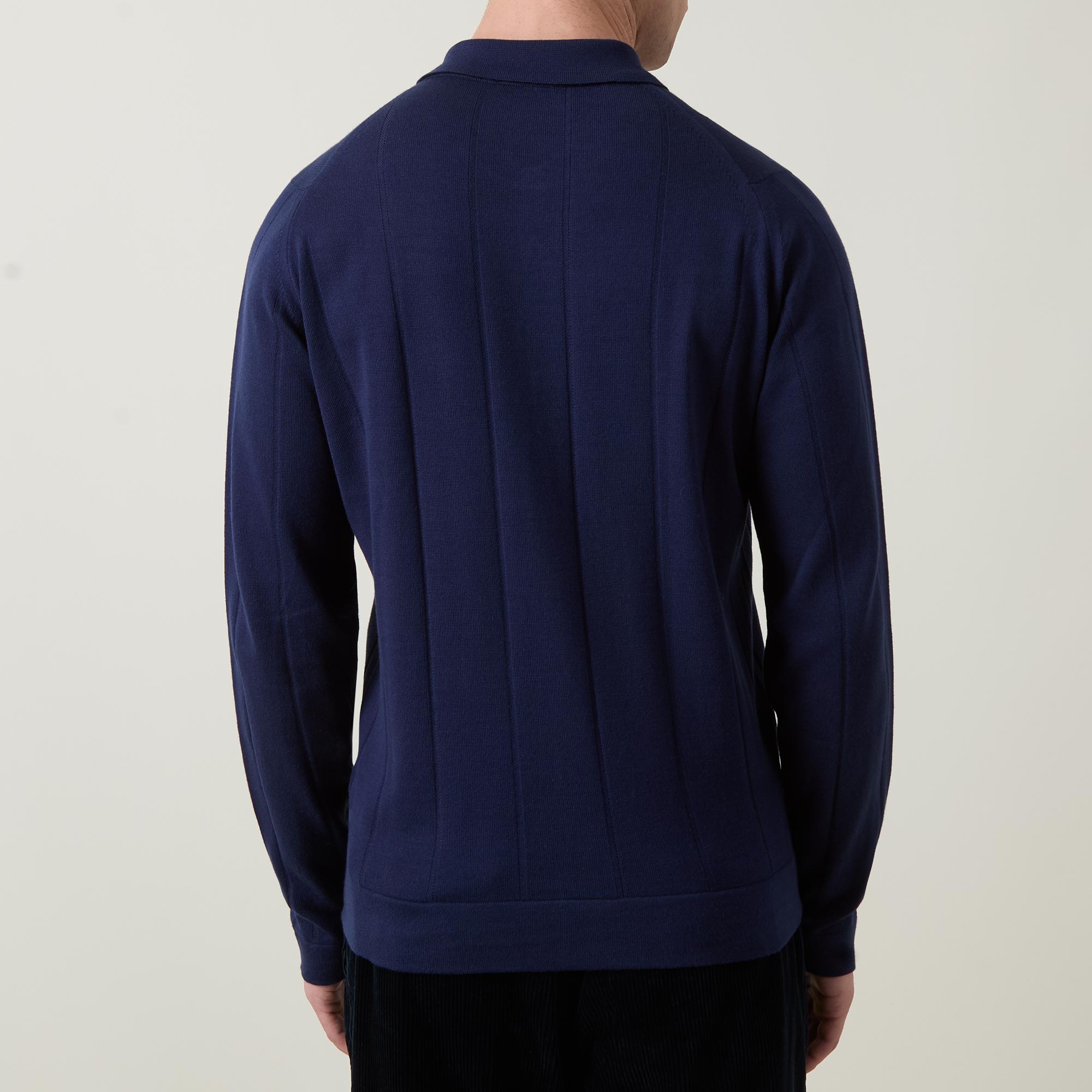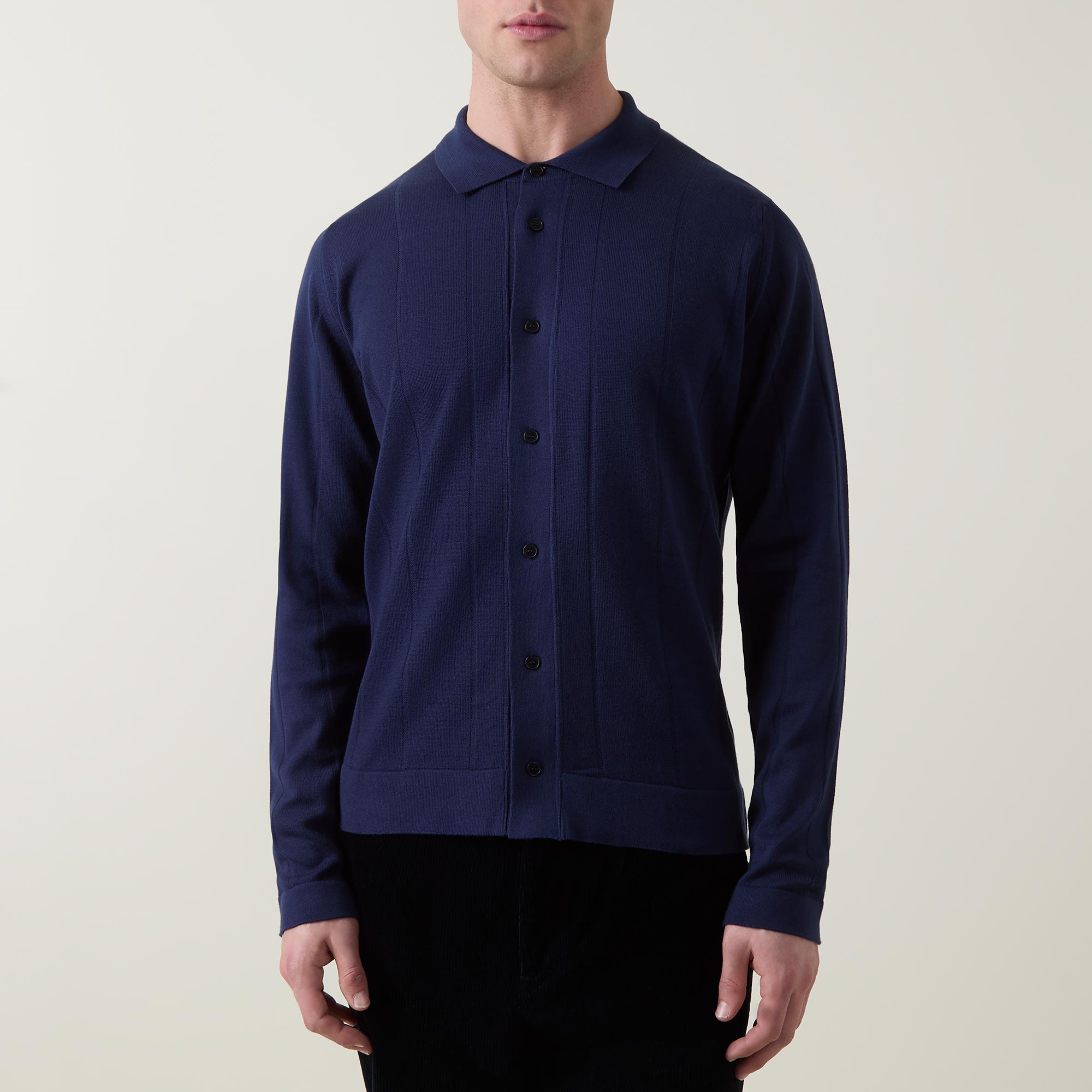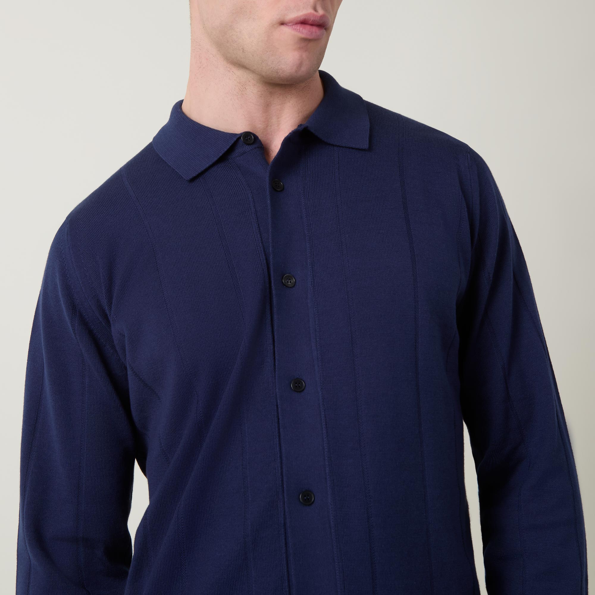 - Polo collar, long sleeves, front button fastening, straight hem, ribbed trims, subtle striped jacquard design, knit construction, soft finish