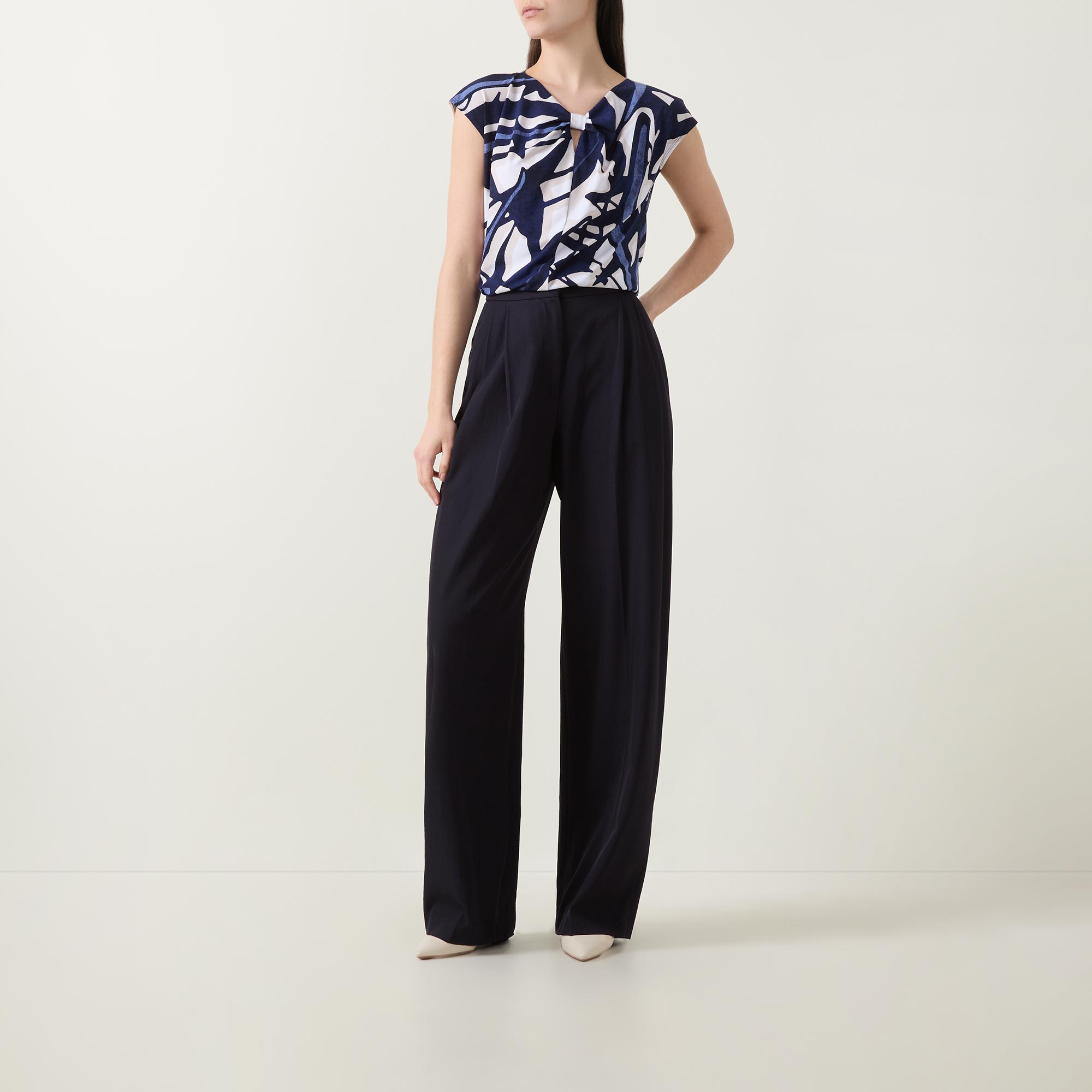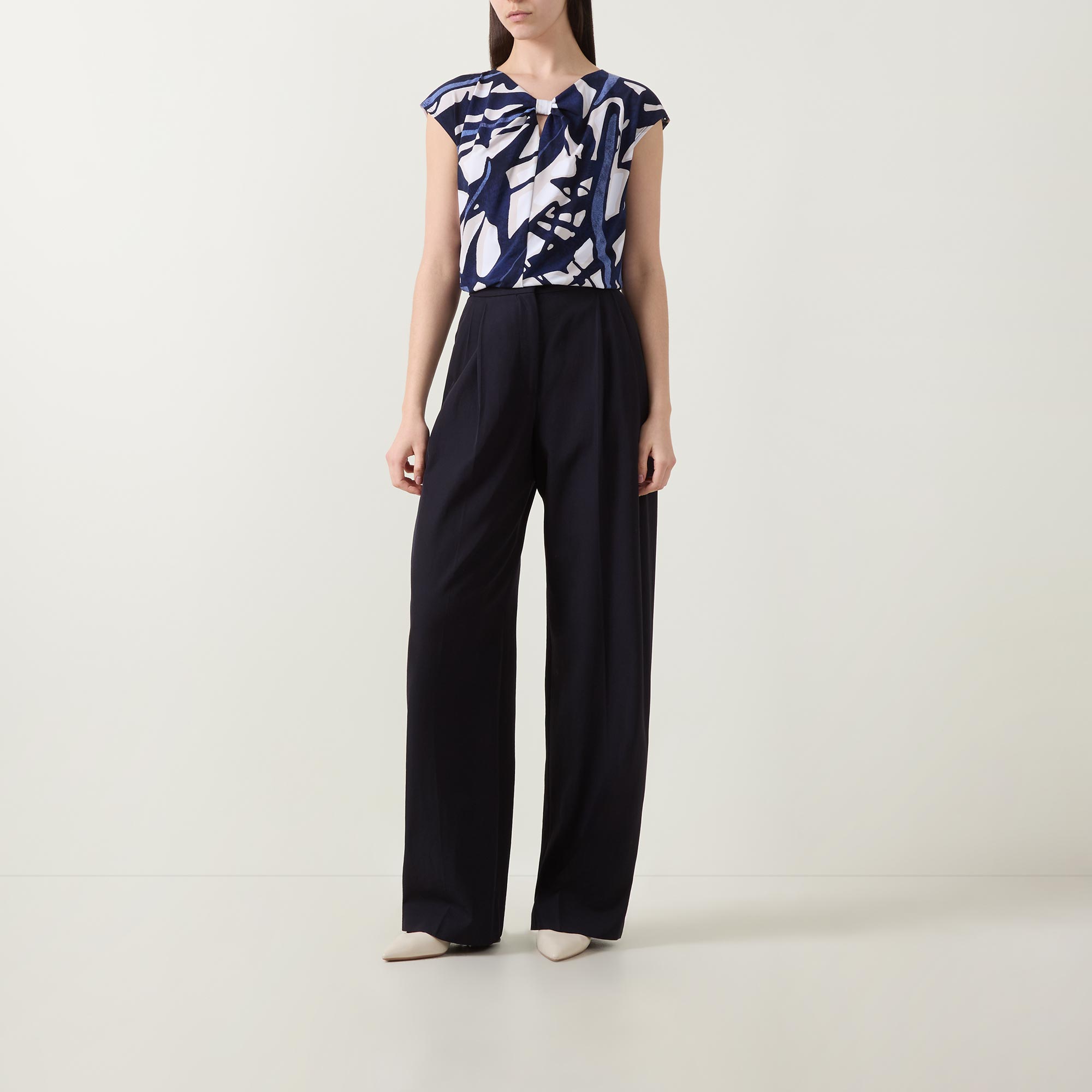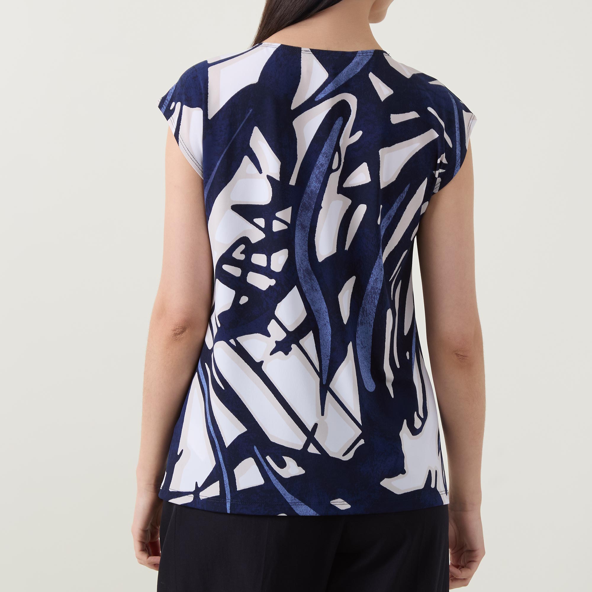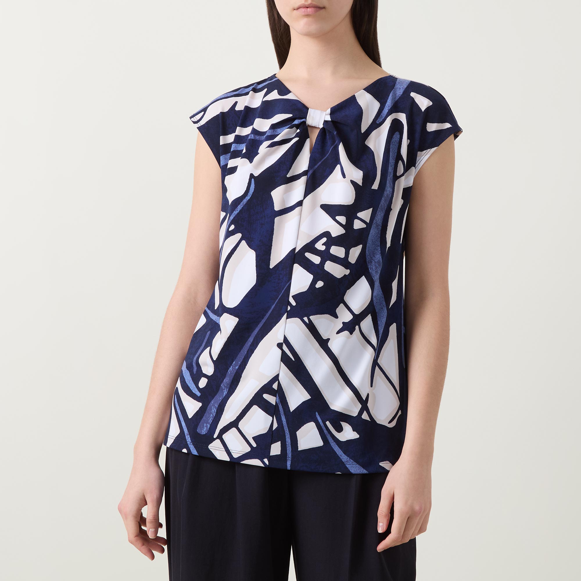- Round neckline with knot and keyhole detail, short sleeves, straight hemline, smooth fluid fabric, abstract pattern