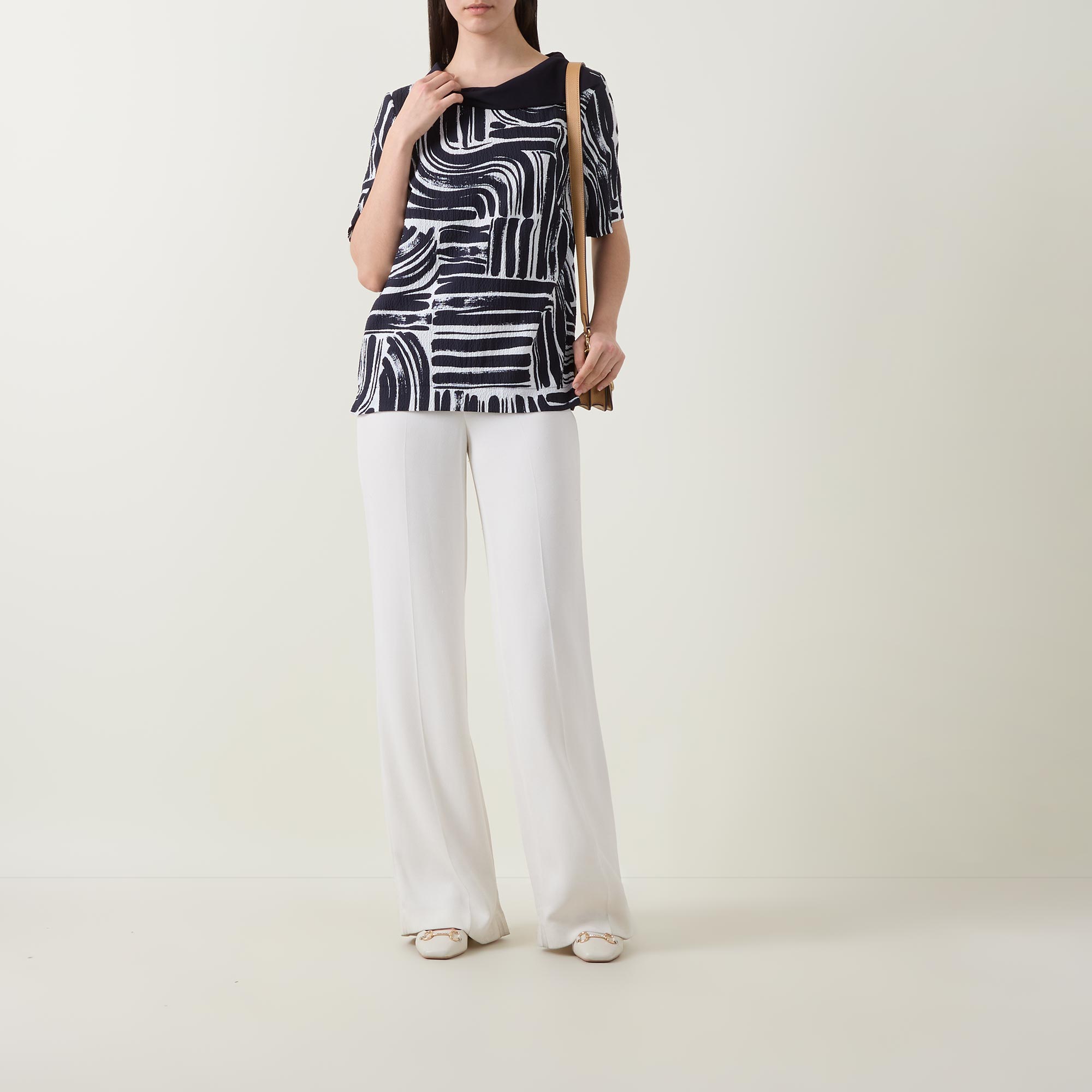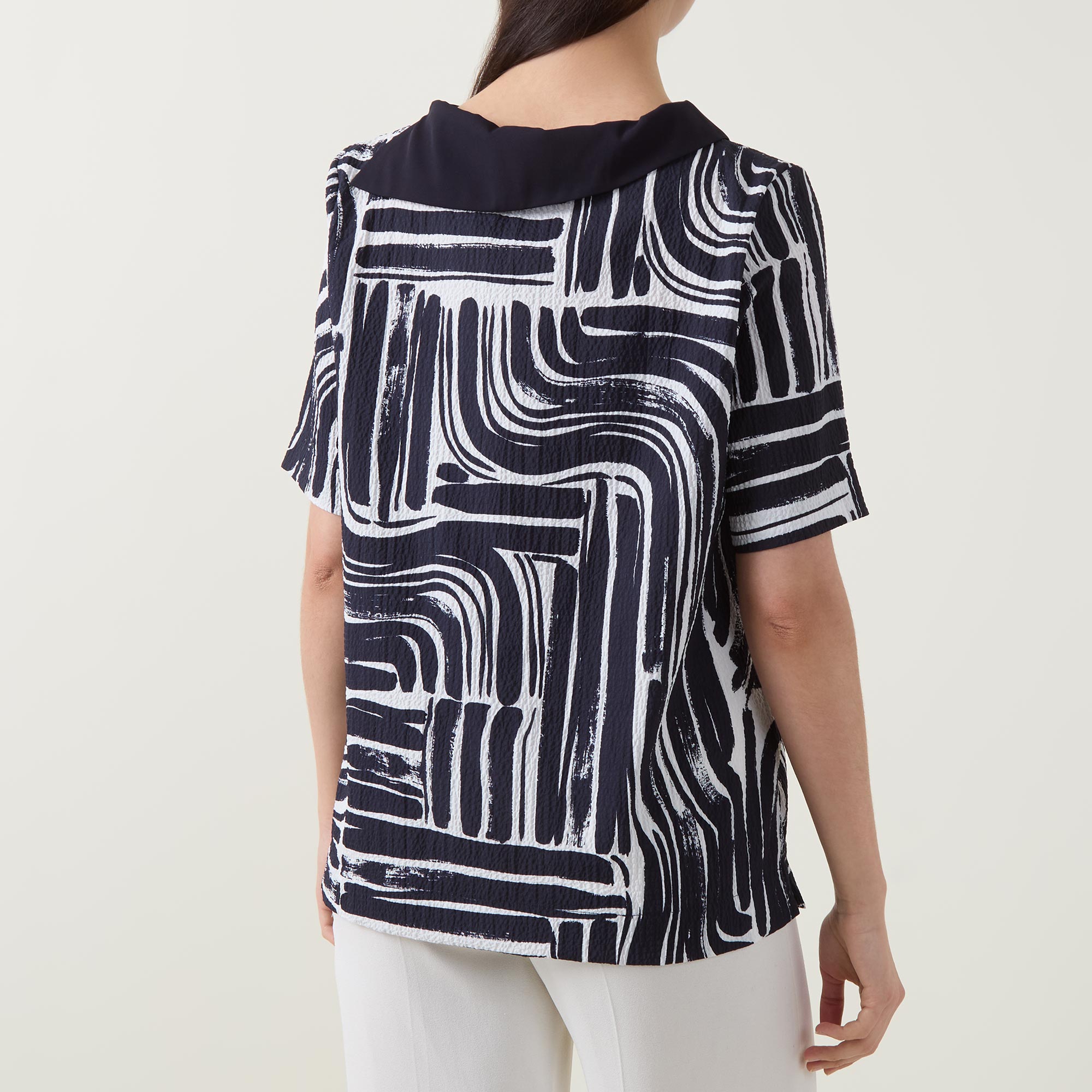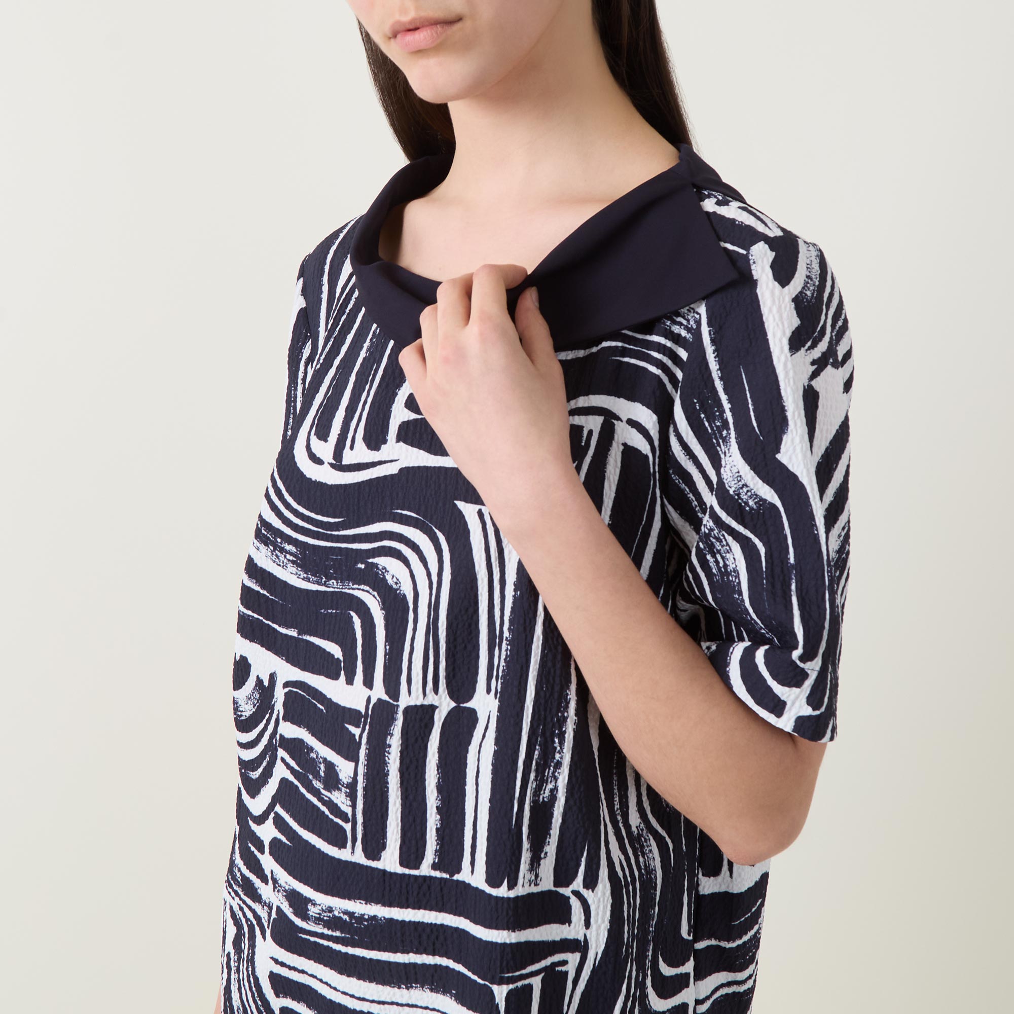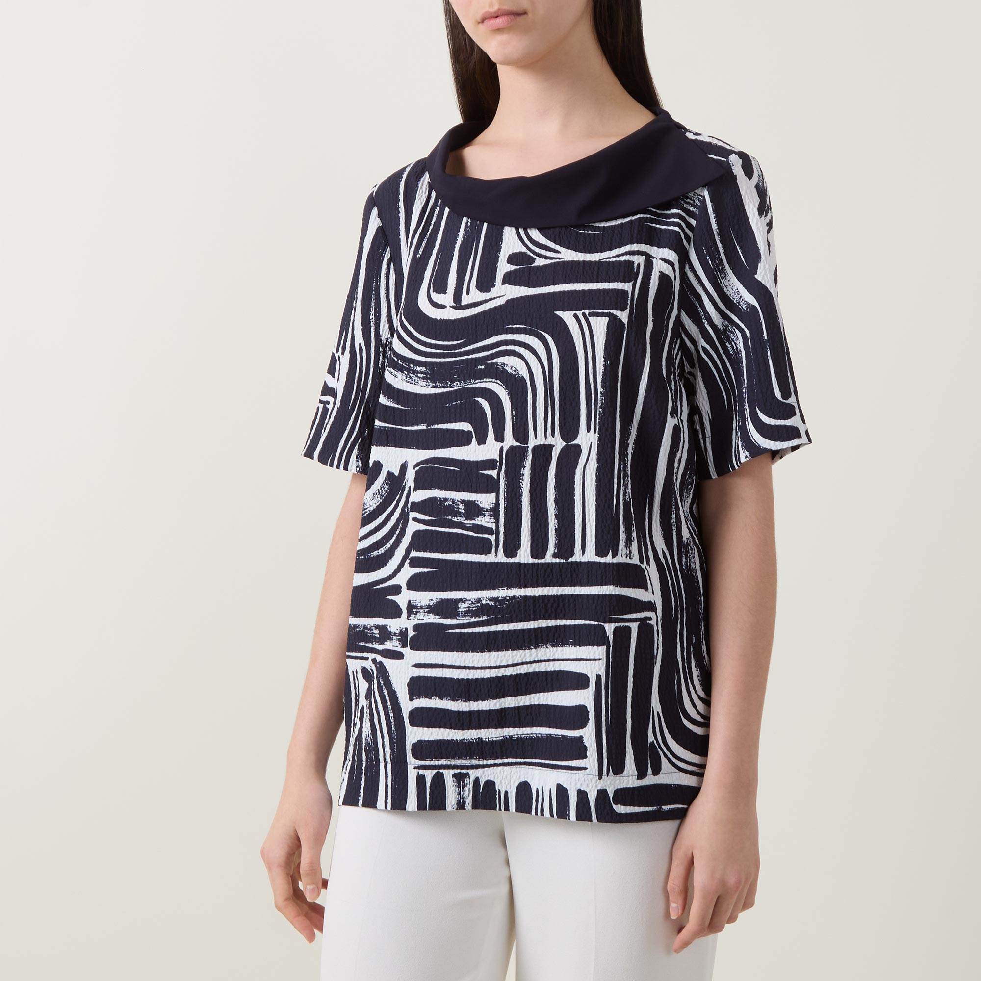 - Folded boat neckline, short sleeves, straight hemline, abstract print, rhinestone embellishment