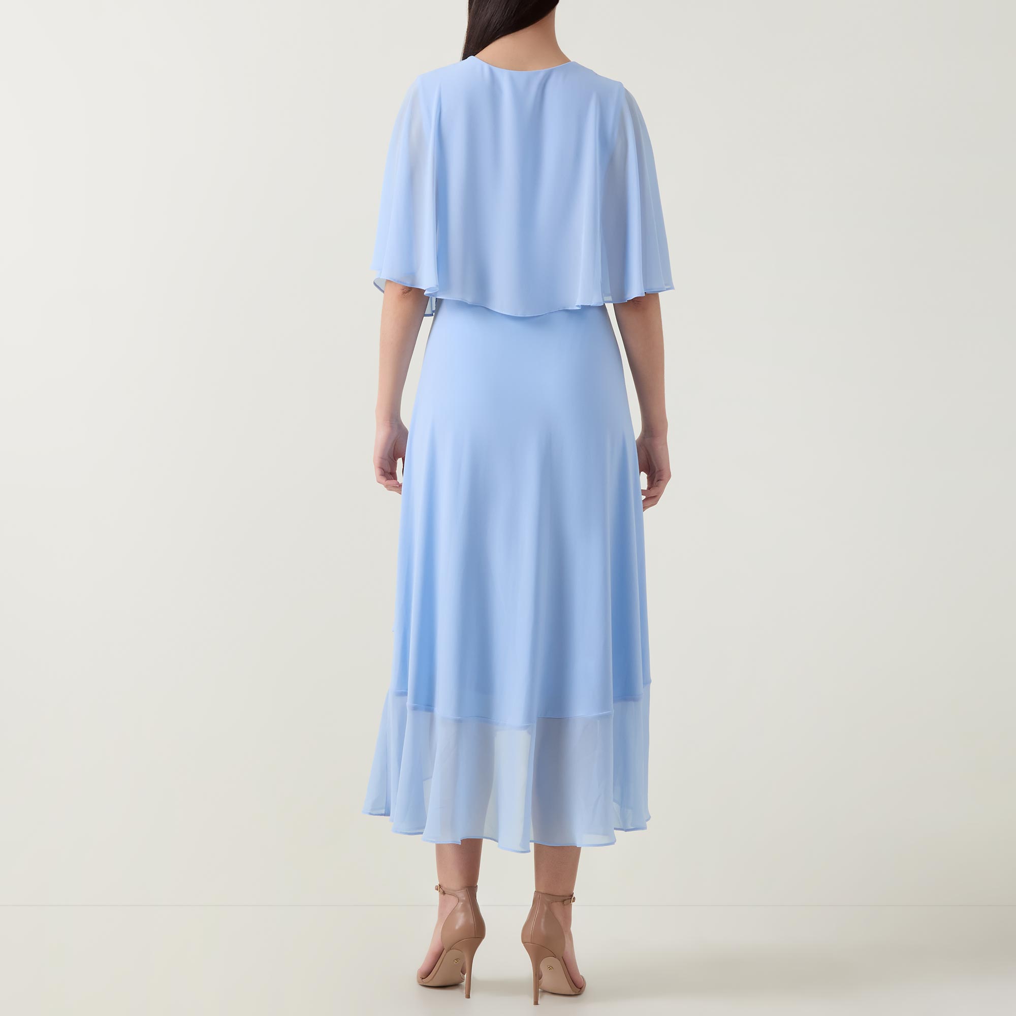 - V-neckline, wrap-style, belt with diamante embellished buckle, asymmetric hemline, midi length, short sleeves