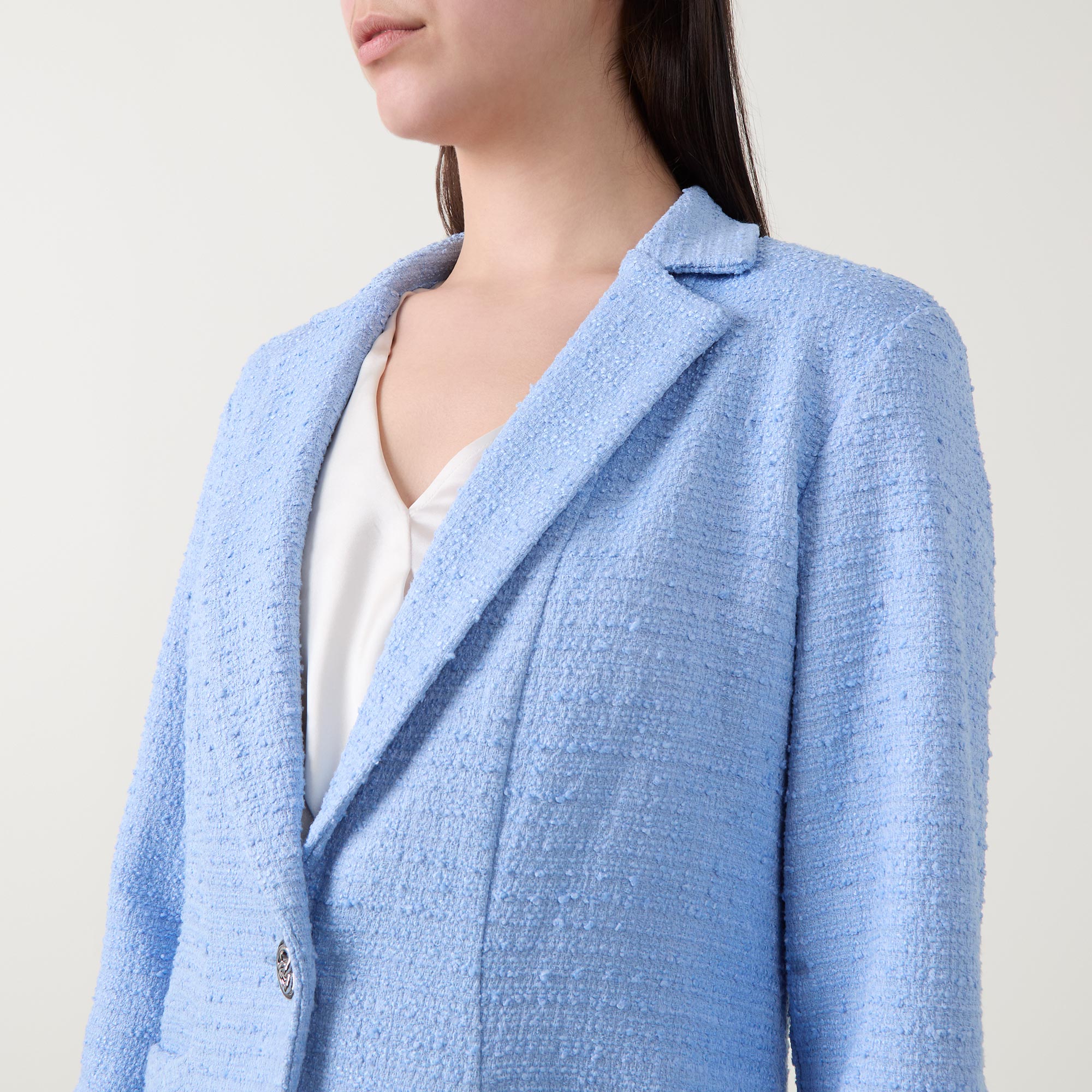 - Single breasted, notch lapel collar, long sleeves, front button fastening, two front slip pockets, curved hem, textured bouclé finish