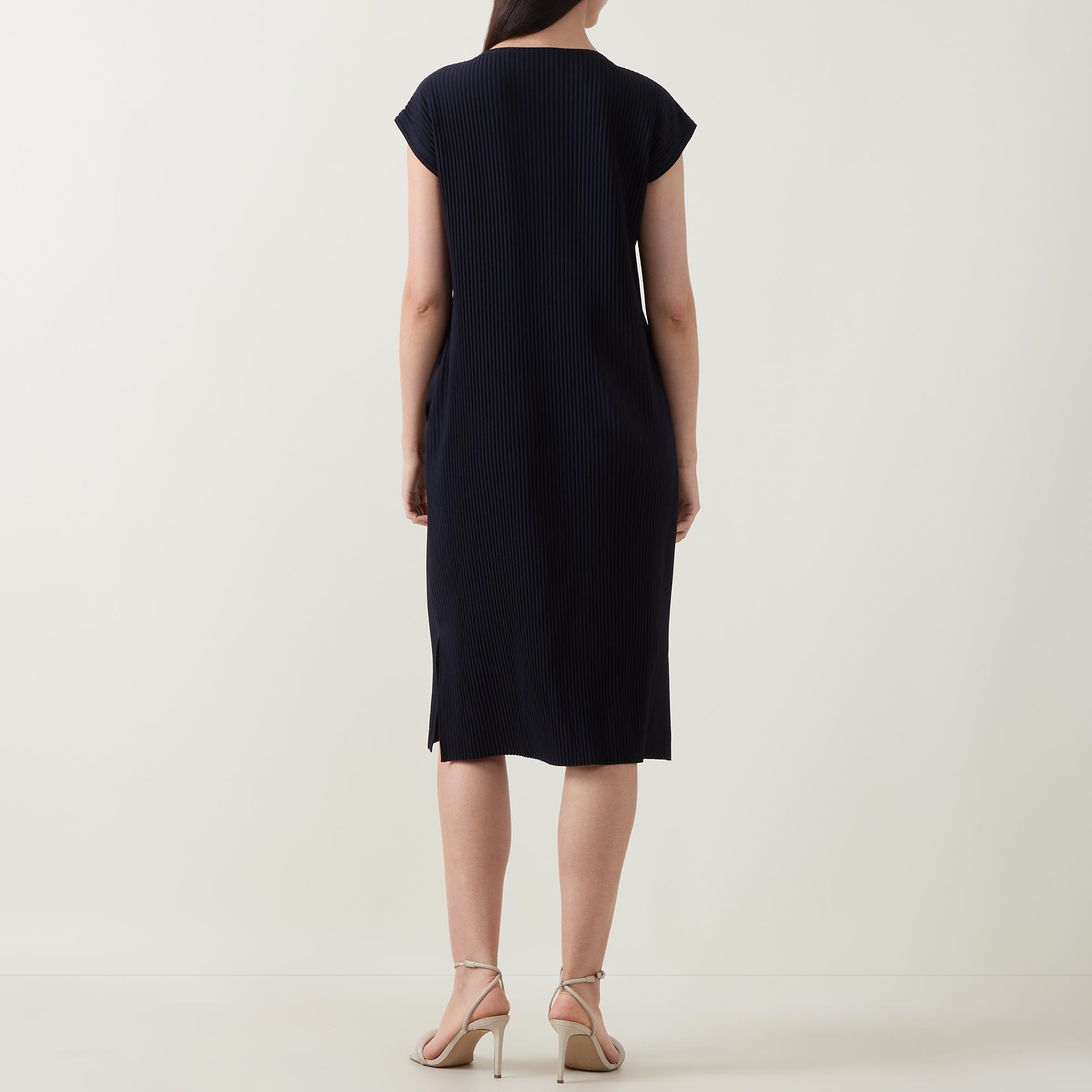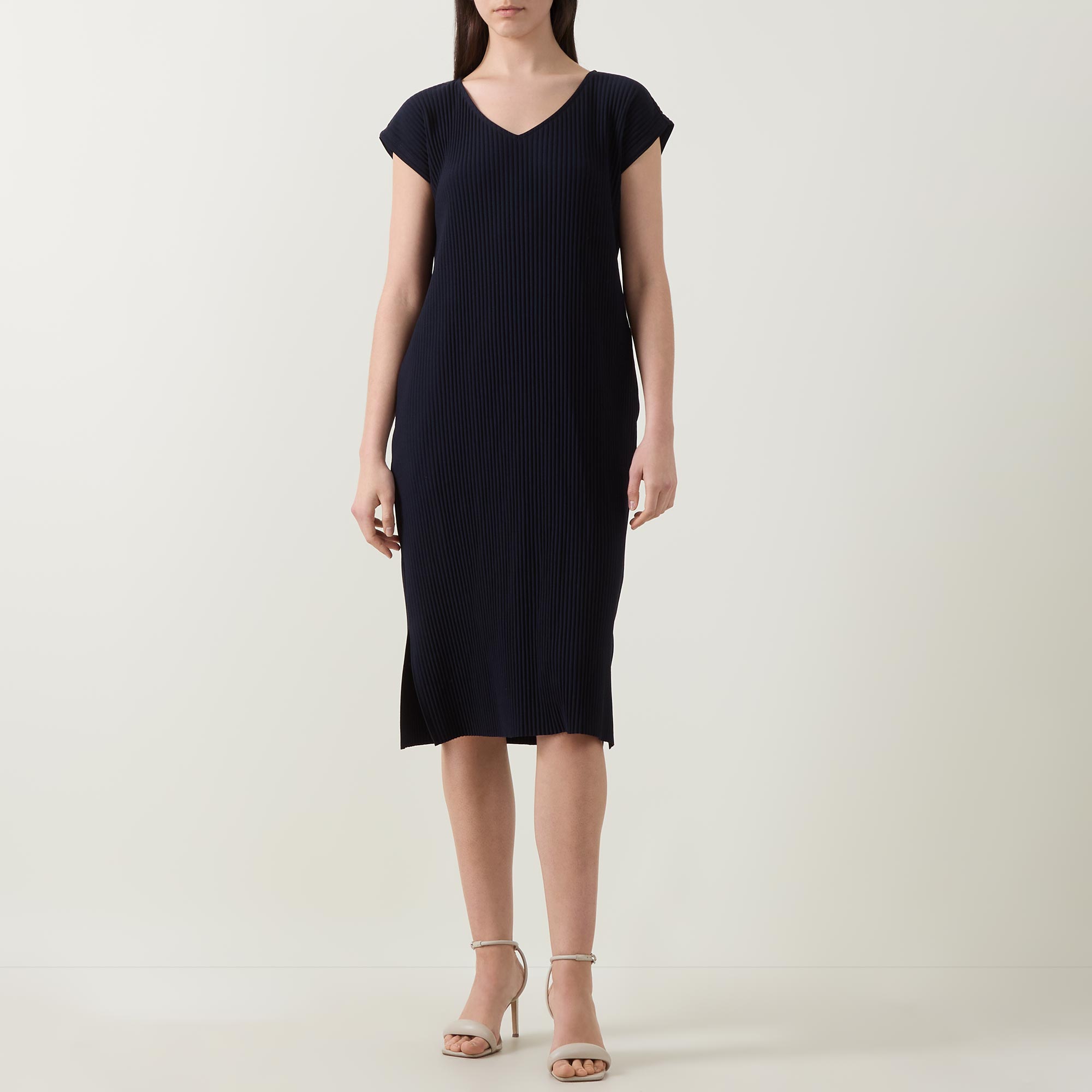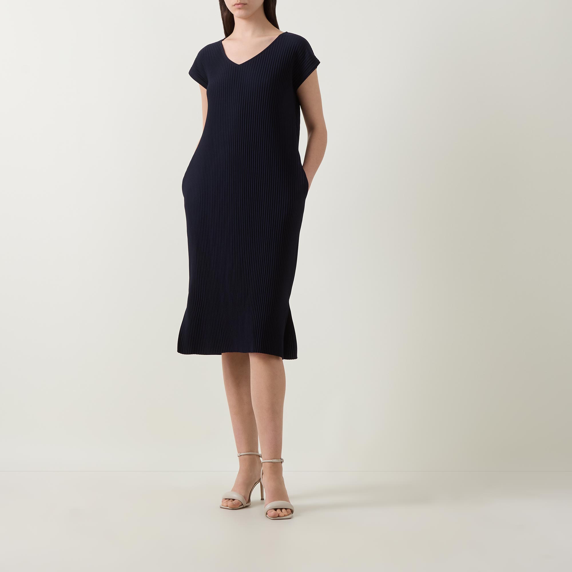 • V-neckline, midi length, pleated structure, split side seams, side entry pockets, pull-on style