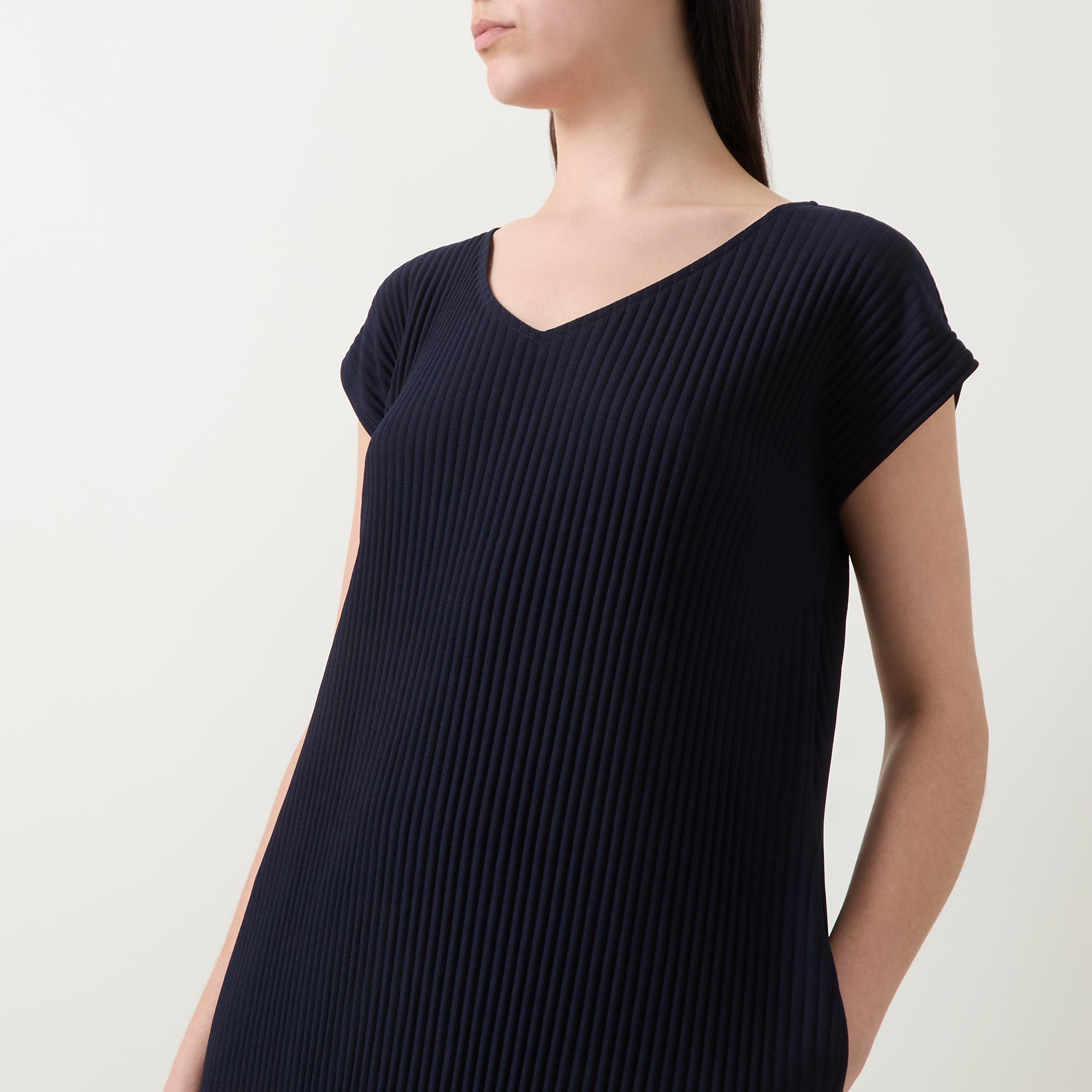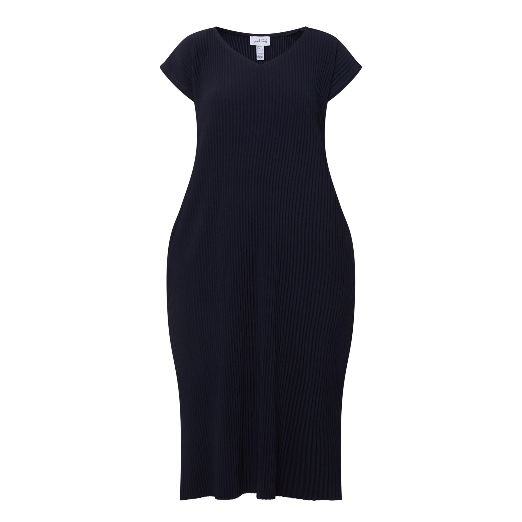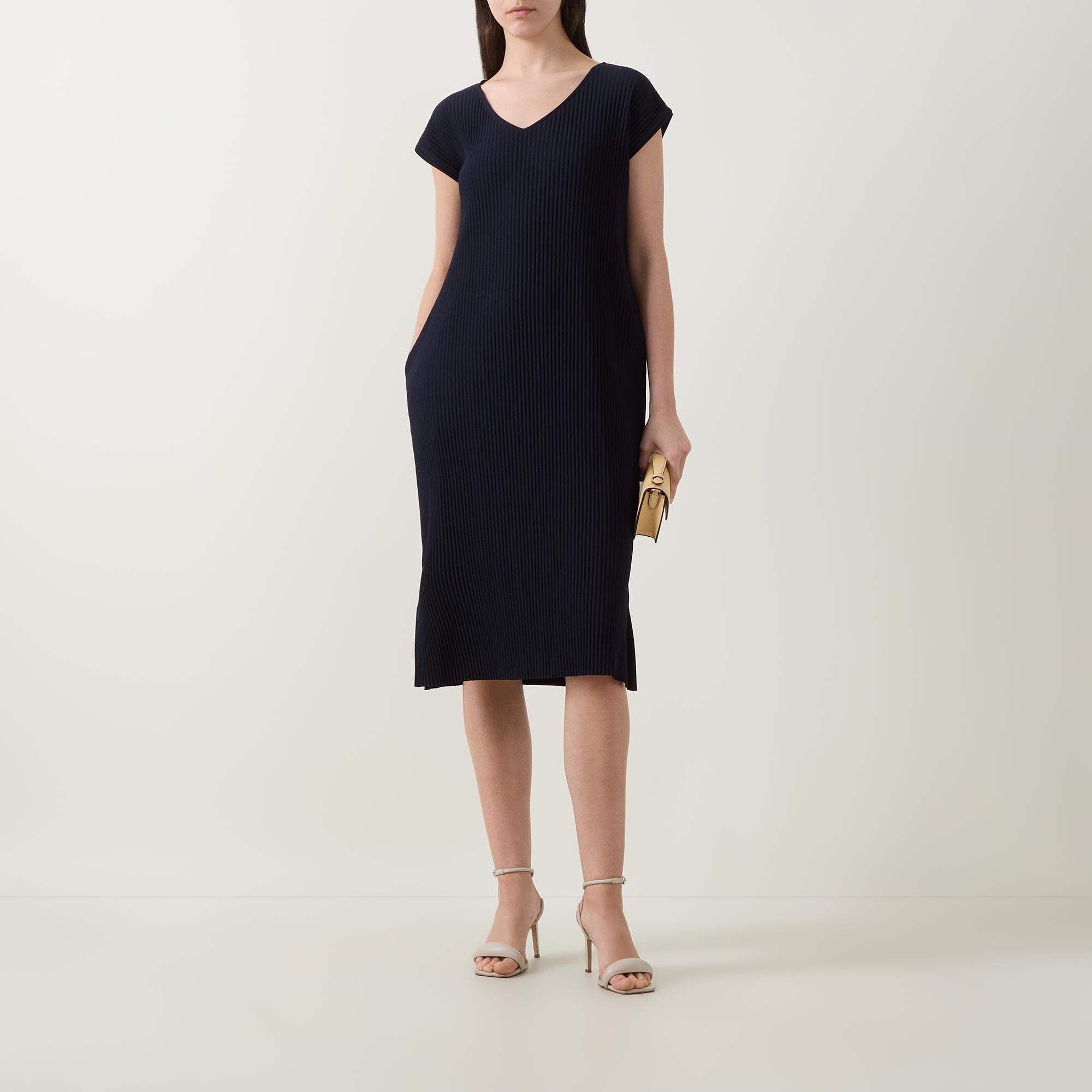 • V-neckline, midi length, pleated structure, split side seams, side entry pockets, pull-on style