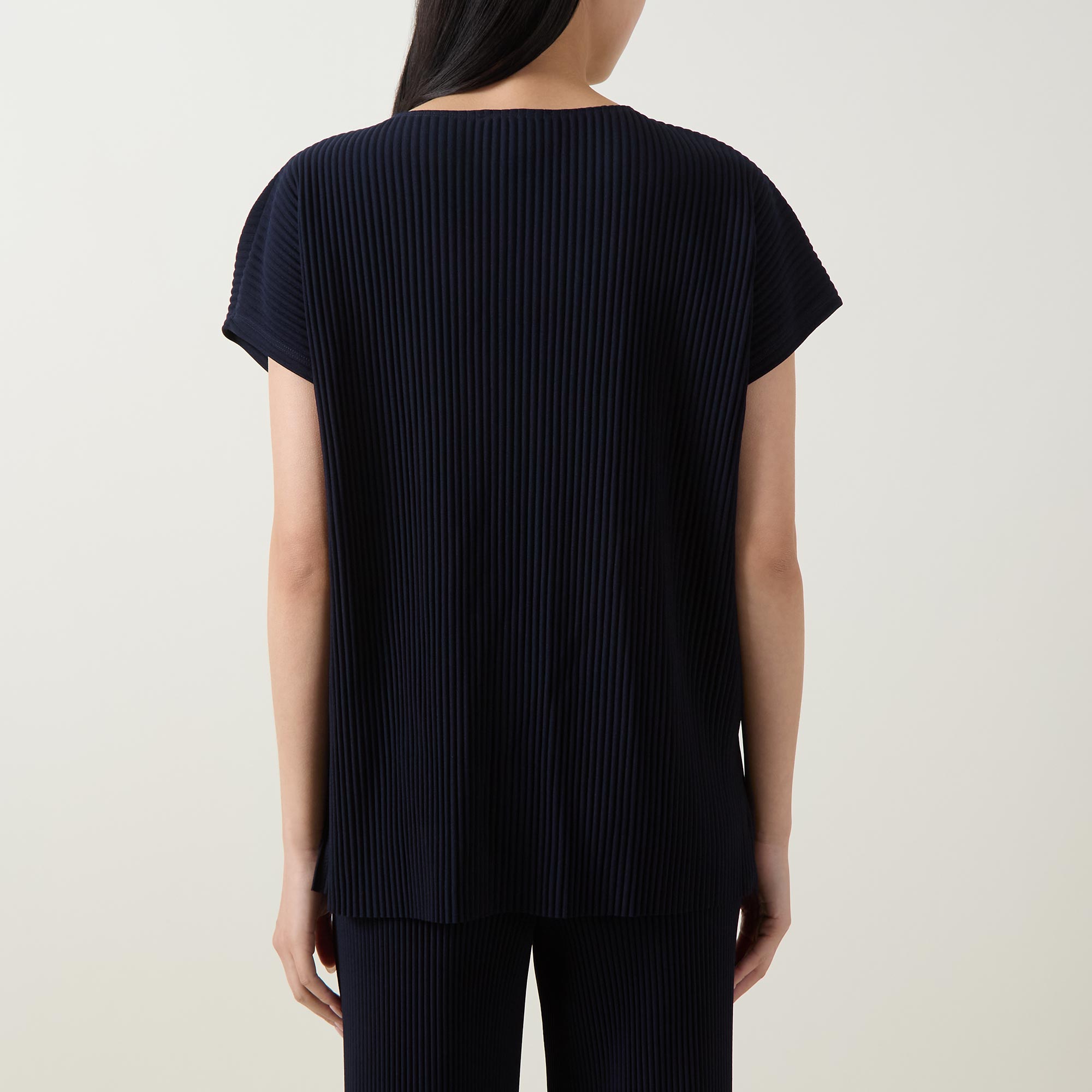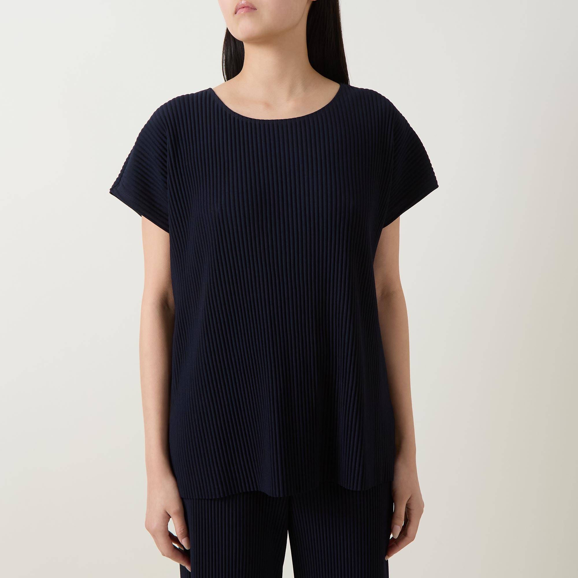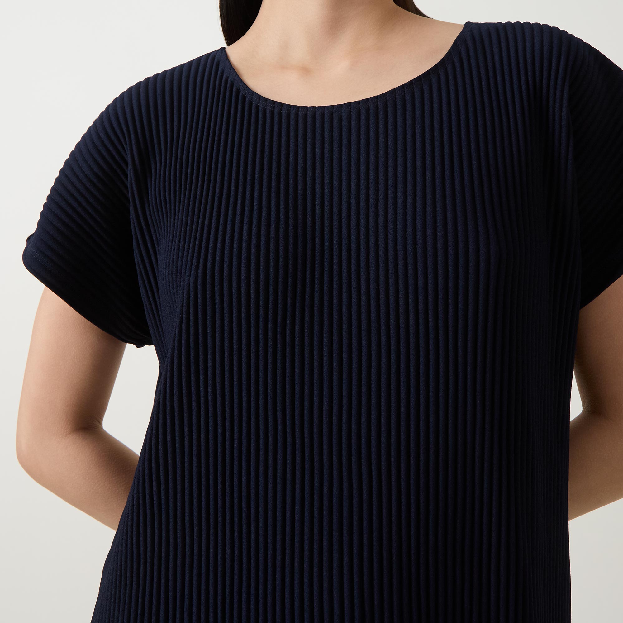 - Pleated texture, round neck, short sleeves, side slits