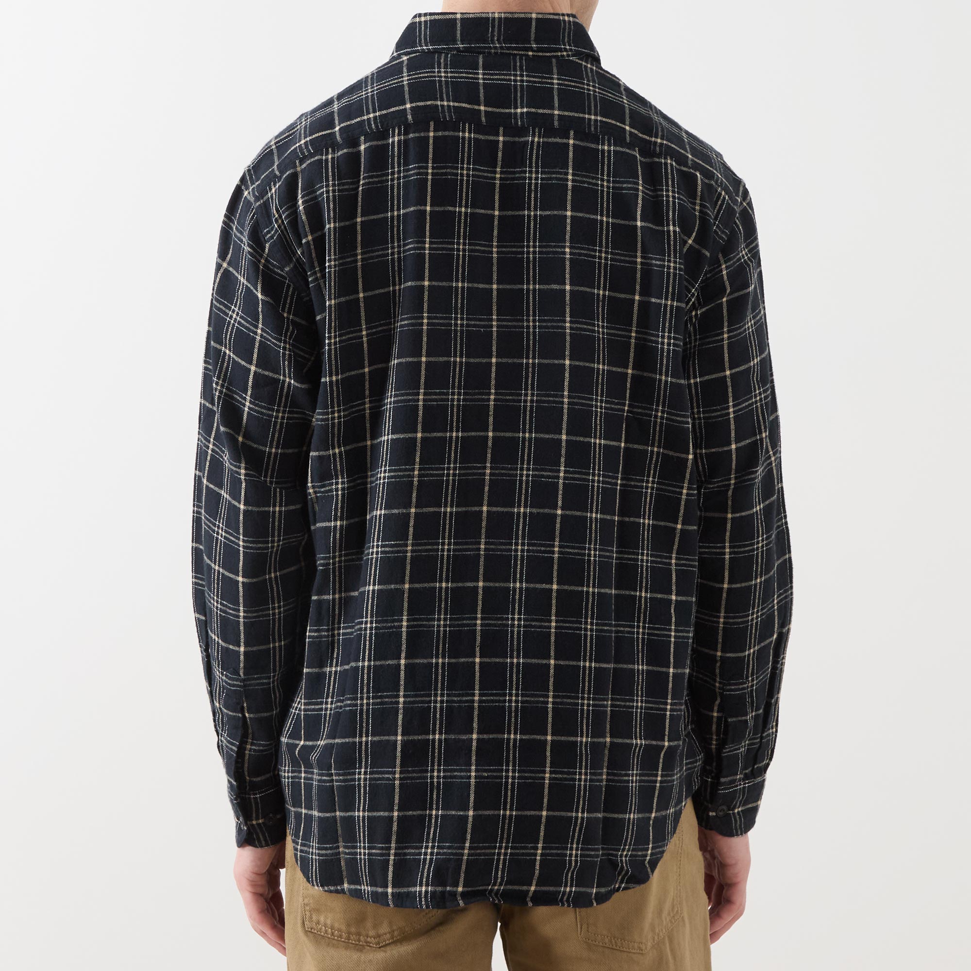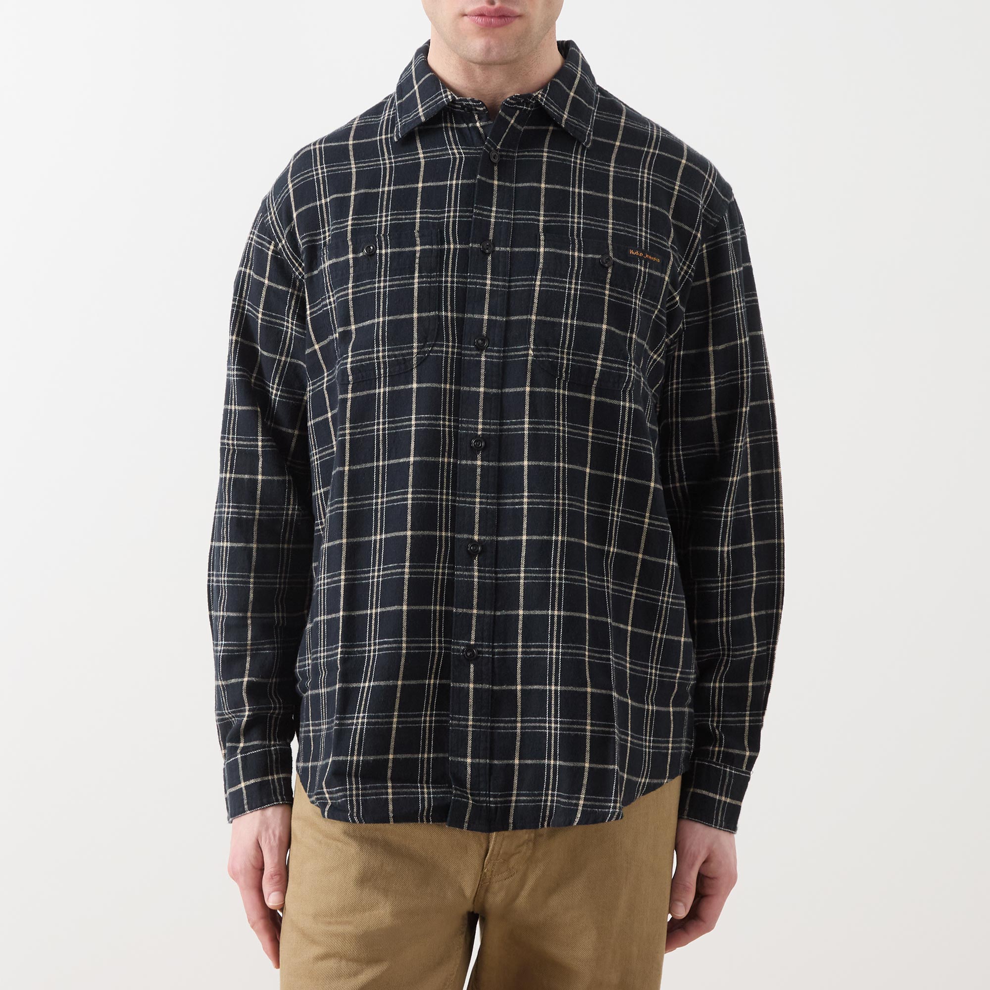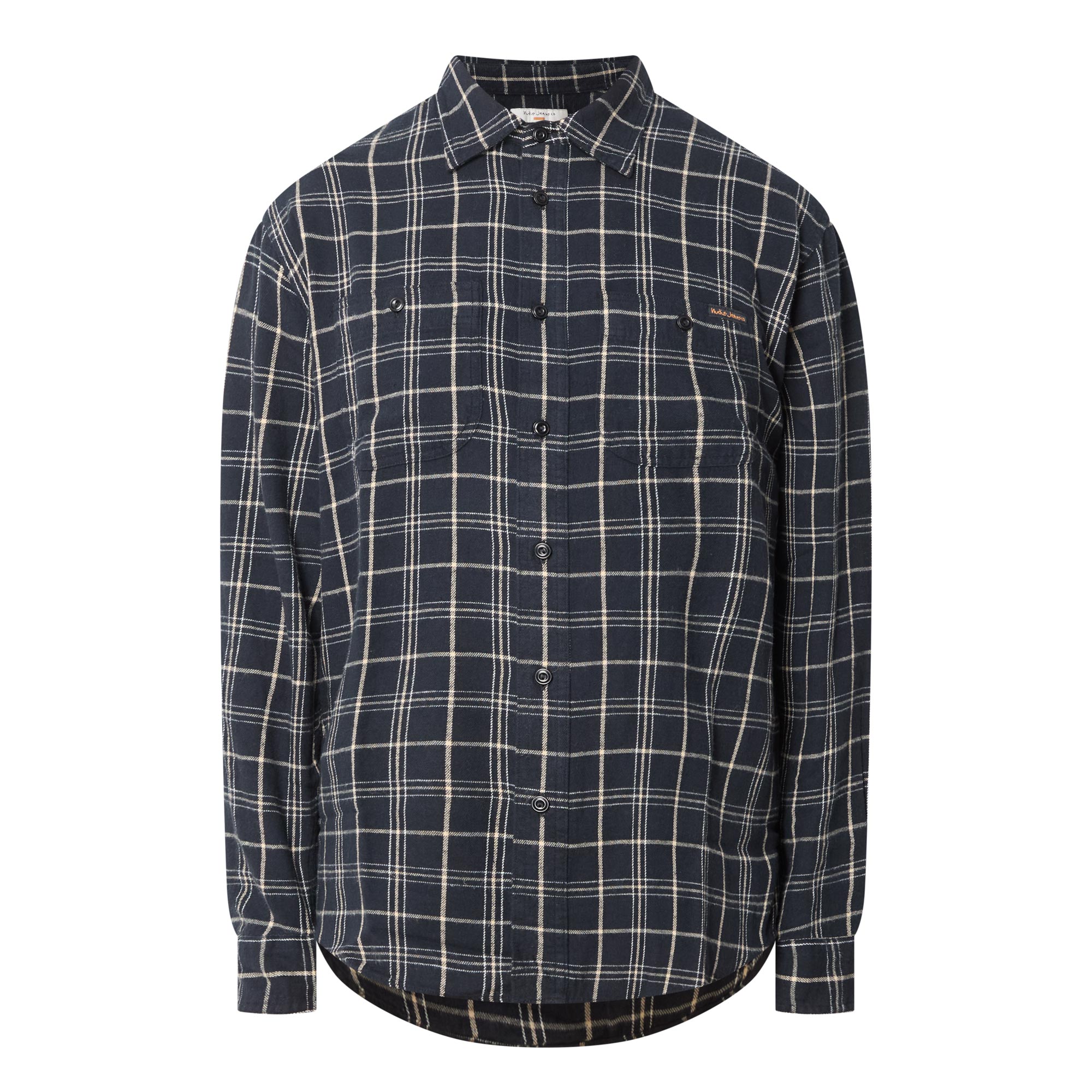 - Classic collar, button fastening, long sleeves, curved hemline, chest patch pockets with button fastening, check pattern, logo tab, buttoned cuffs, slightly crinkled texture fabric
