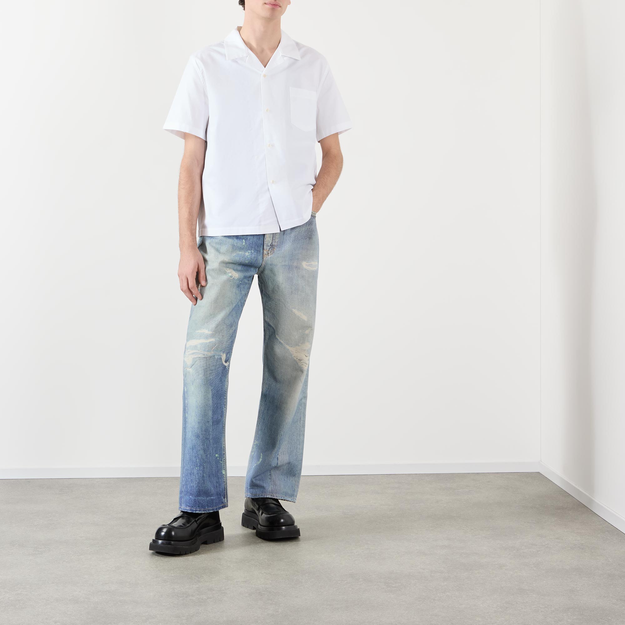 - Camp collar, dropped shoulders, short sleeves, front button fastening, one chest patch pocket, straight hem, Guinness illustration and poem in beaded embroidery at the back