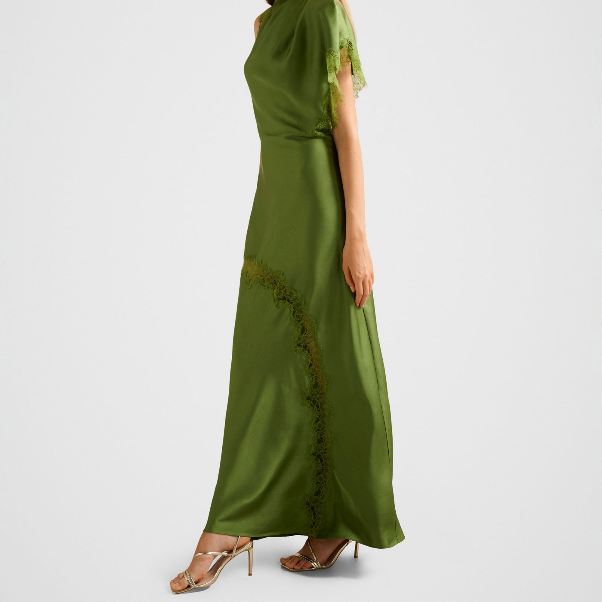 - Regular fit, high, asymmetric neckline, left shoulder coverage and sleeveless right, column-shaped skirt with pleated hem, keyhole fastening at rear neck, concealed zip closure, lined