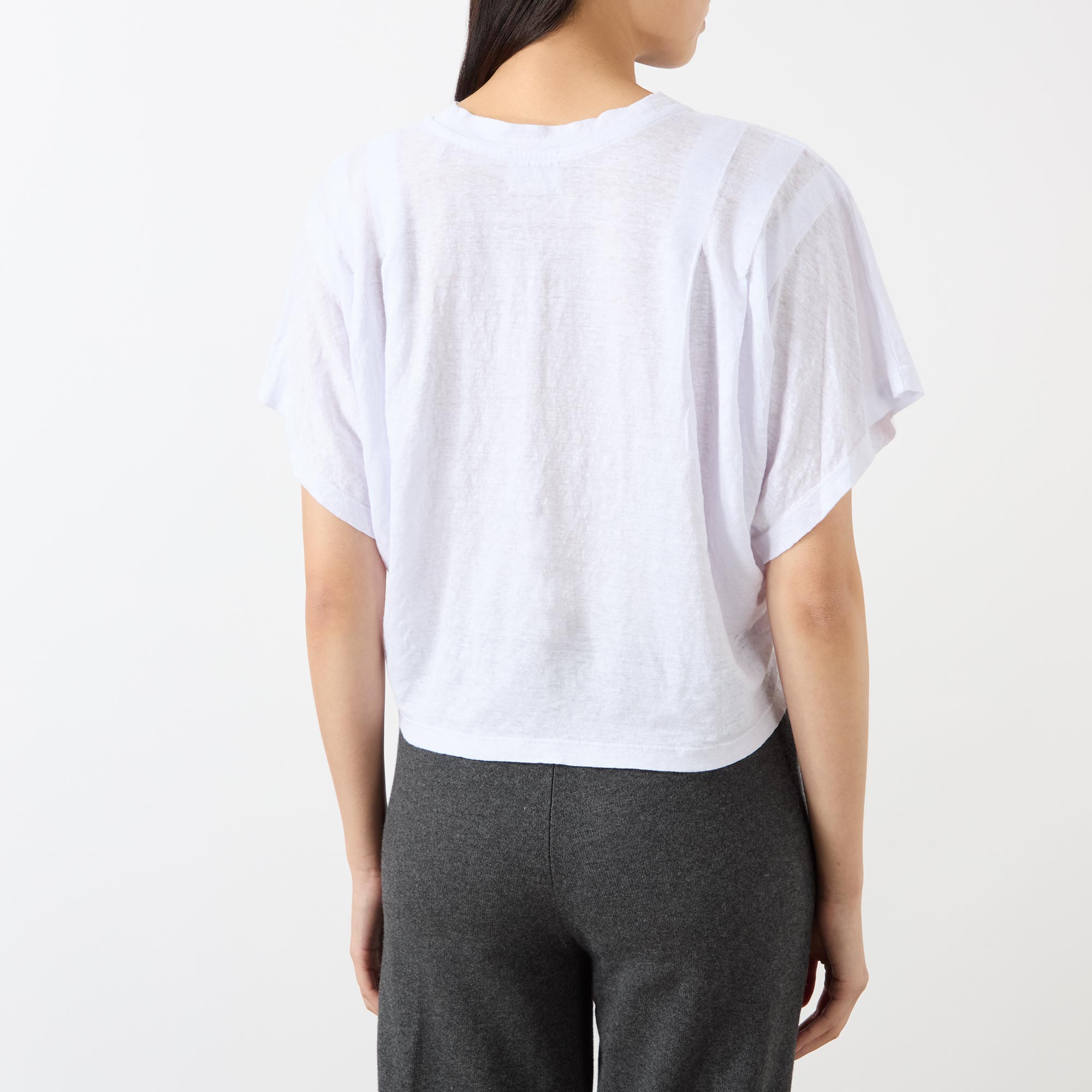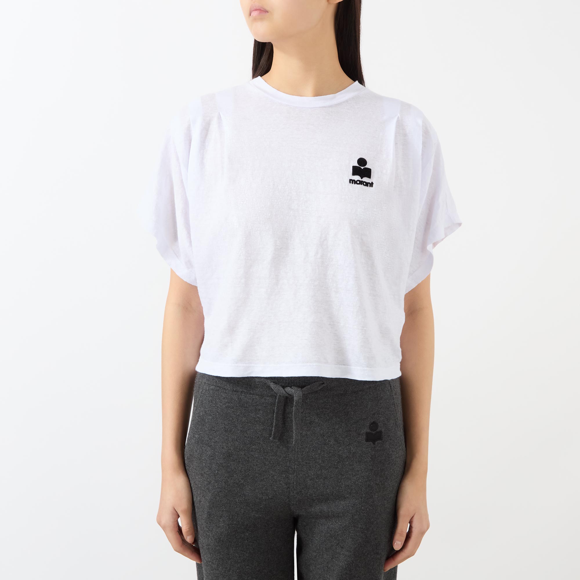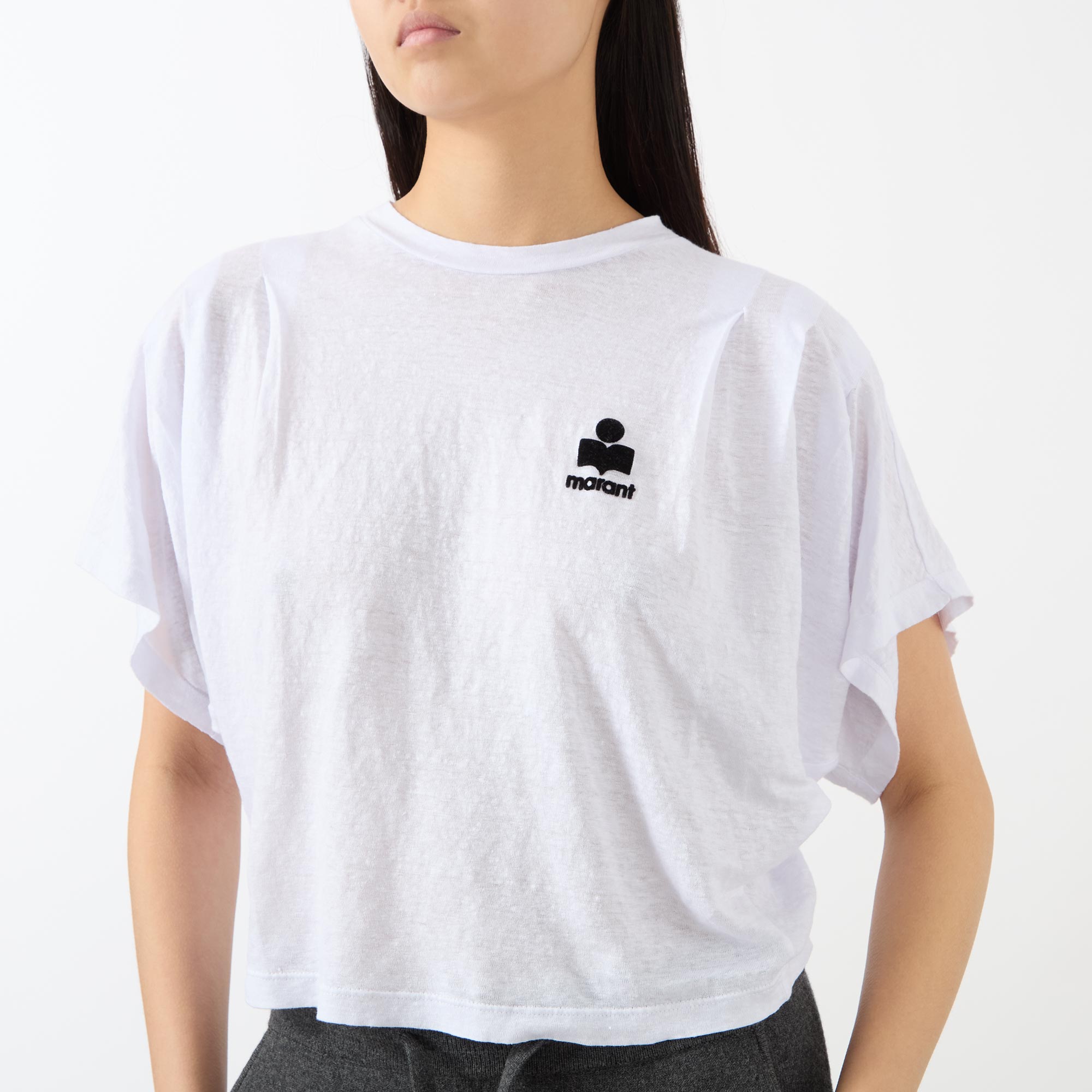 - Round neck, dropped shoulders, short sleeves, straight hem, slightly cropped length, contrast logo detail on the chest, pleating throughout, lightweight, breathable