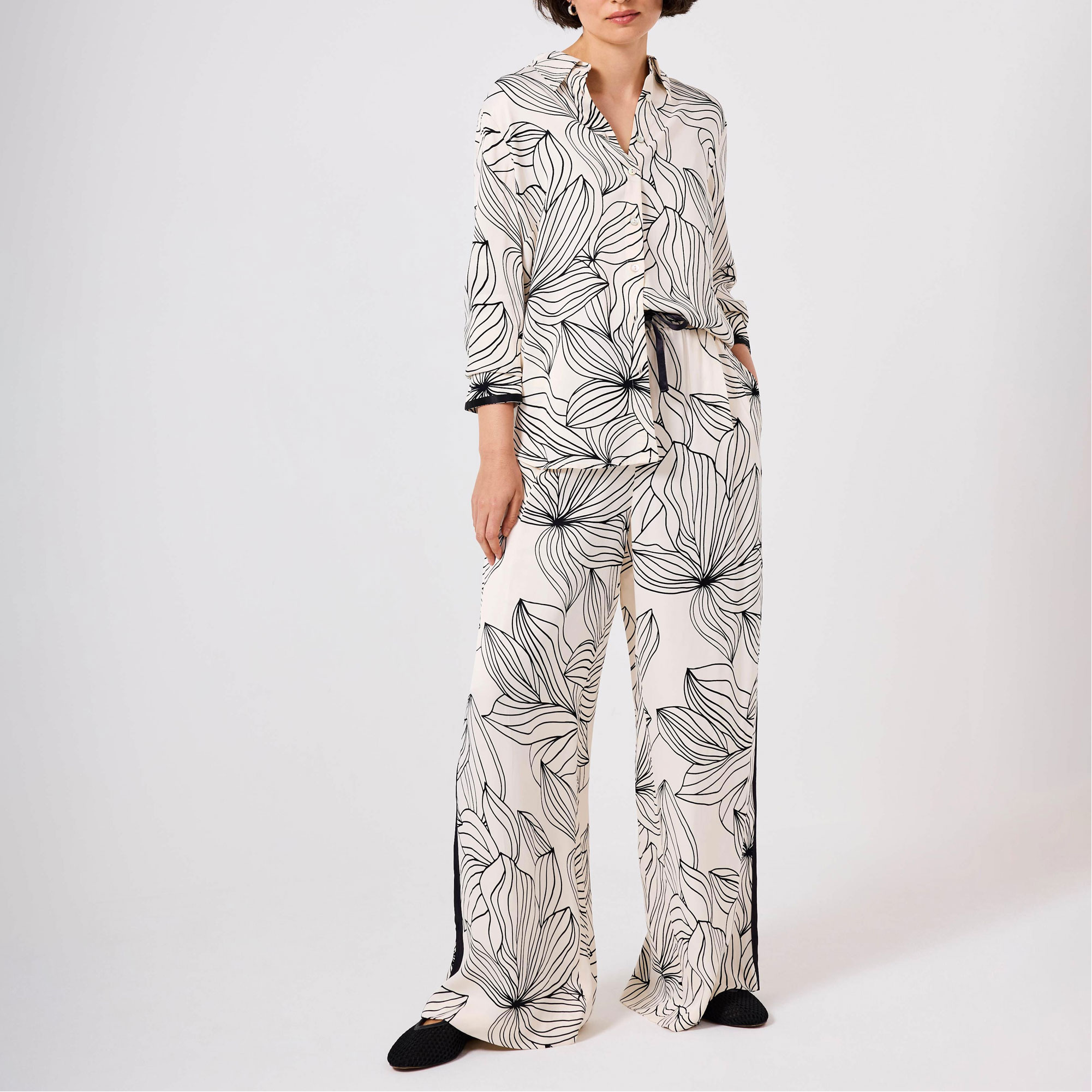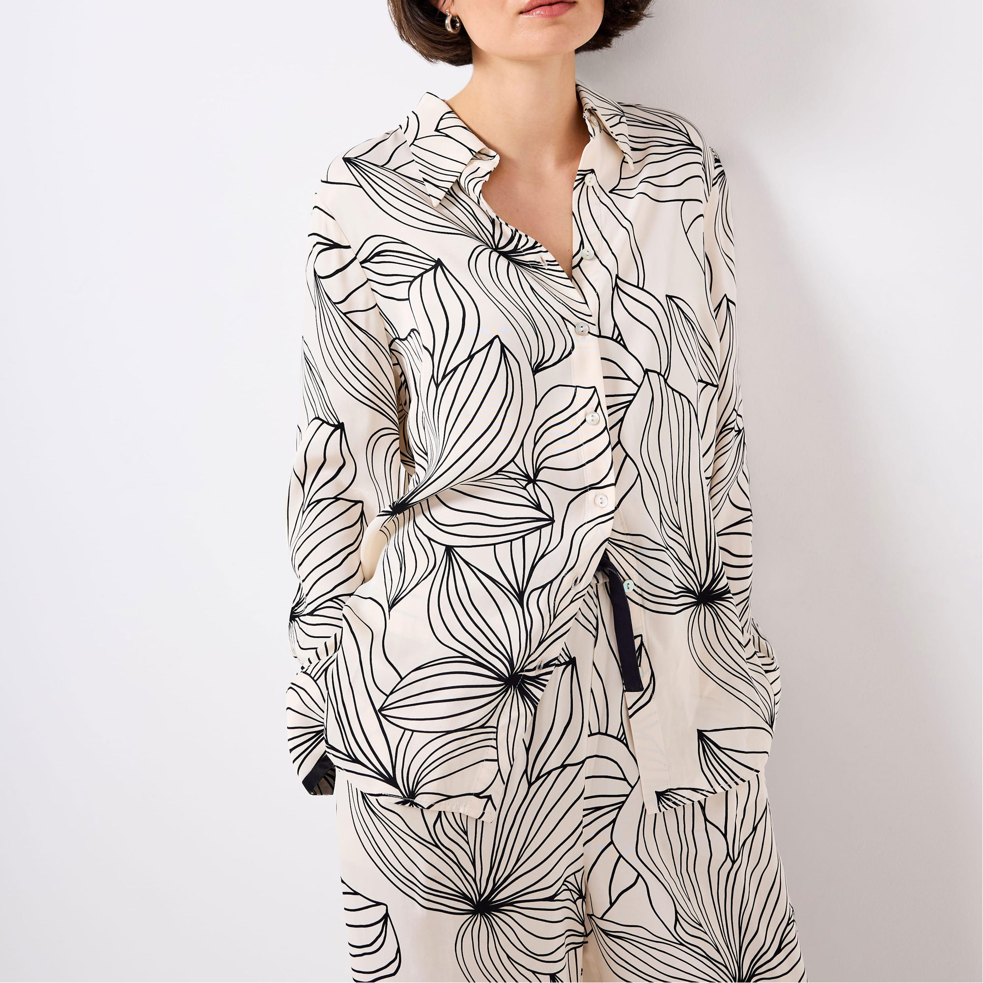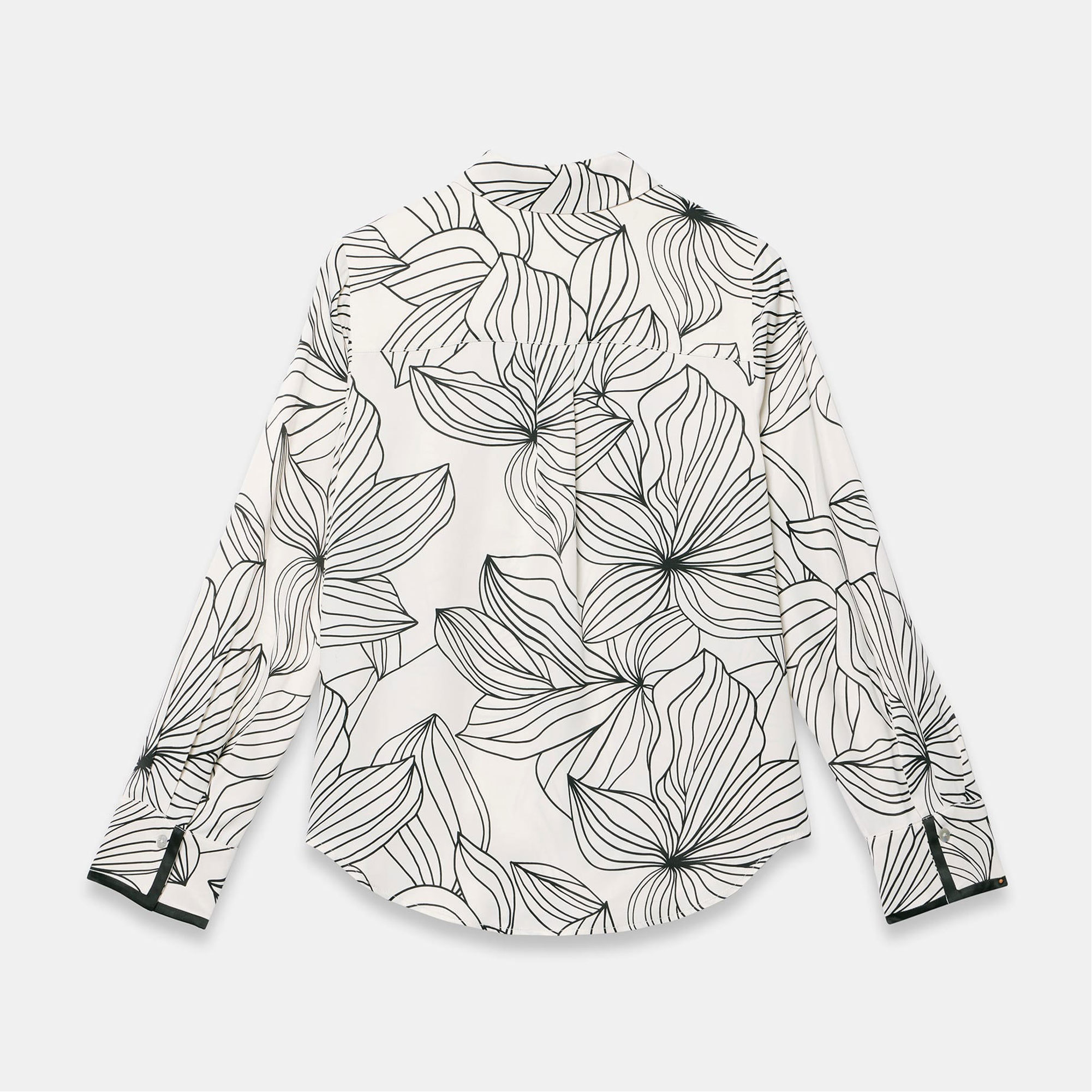 - Floral print, classic collar, long sleeves, contrast trim, buttoned cuffs, curved hemline, front button fastenings