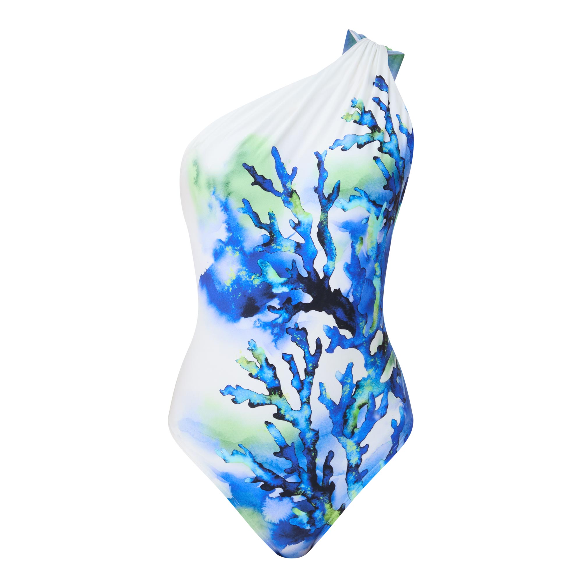 • One-shoulder style, ruched details, low back, cheeky coverage, high-cut legs, coral print