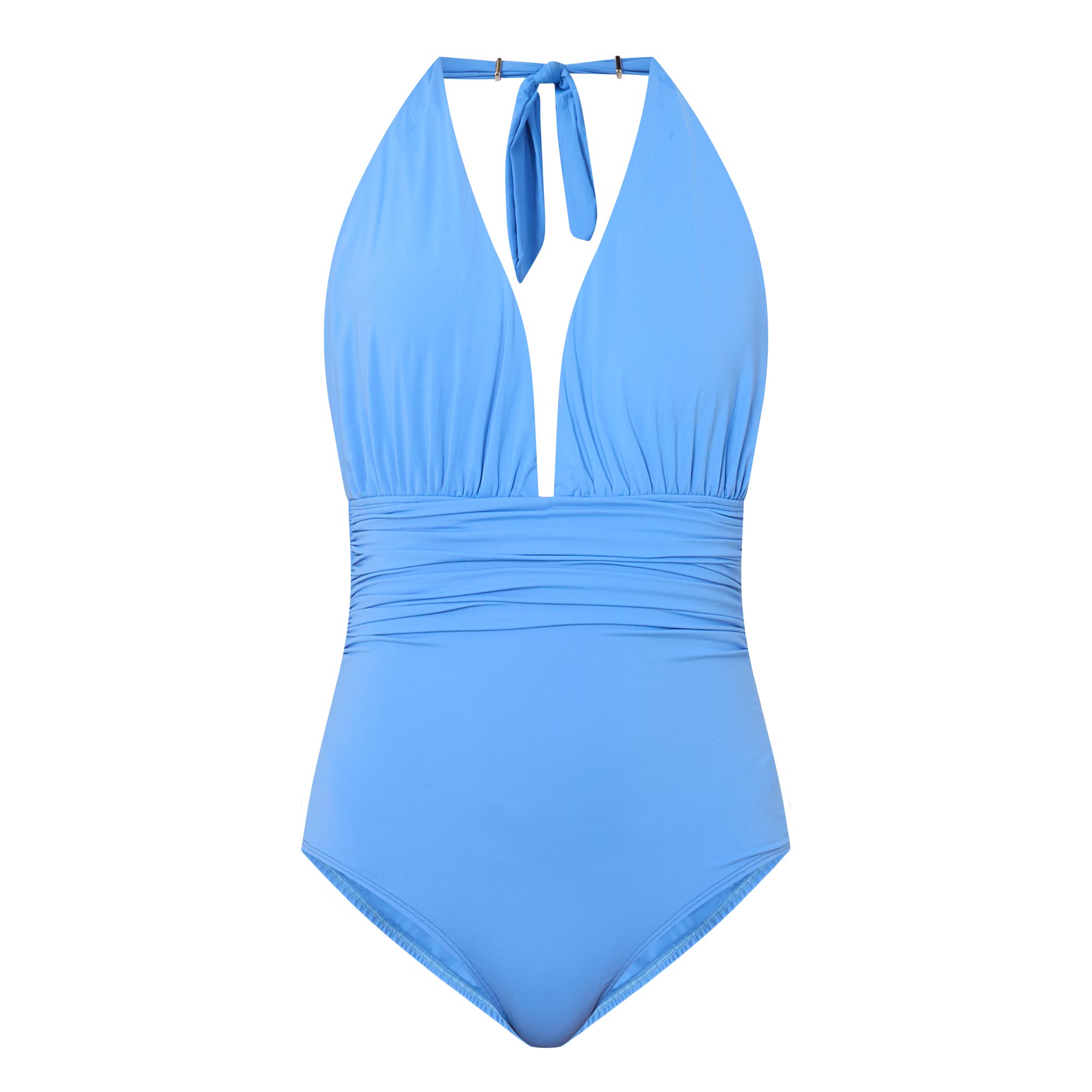 • One-piece design, adjustable tie-fastening halter neckline, plunging V-neckline, backless design, full rear coverage, gathered ruched waist
