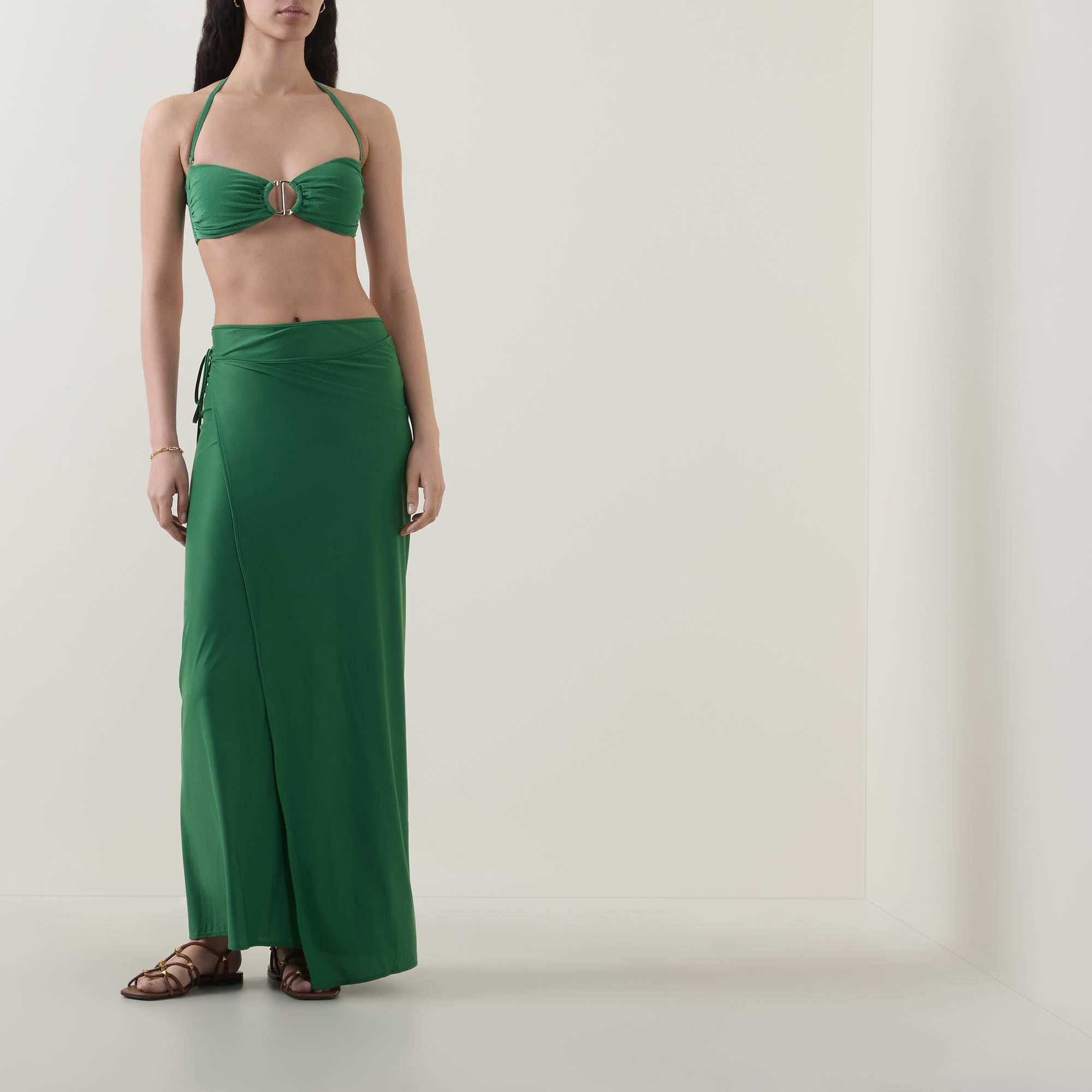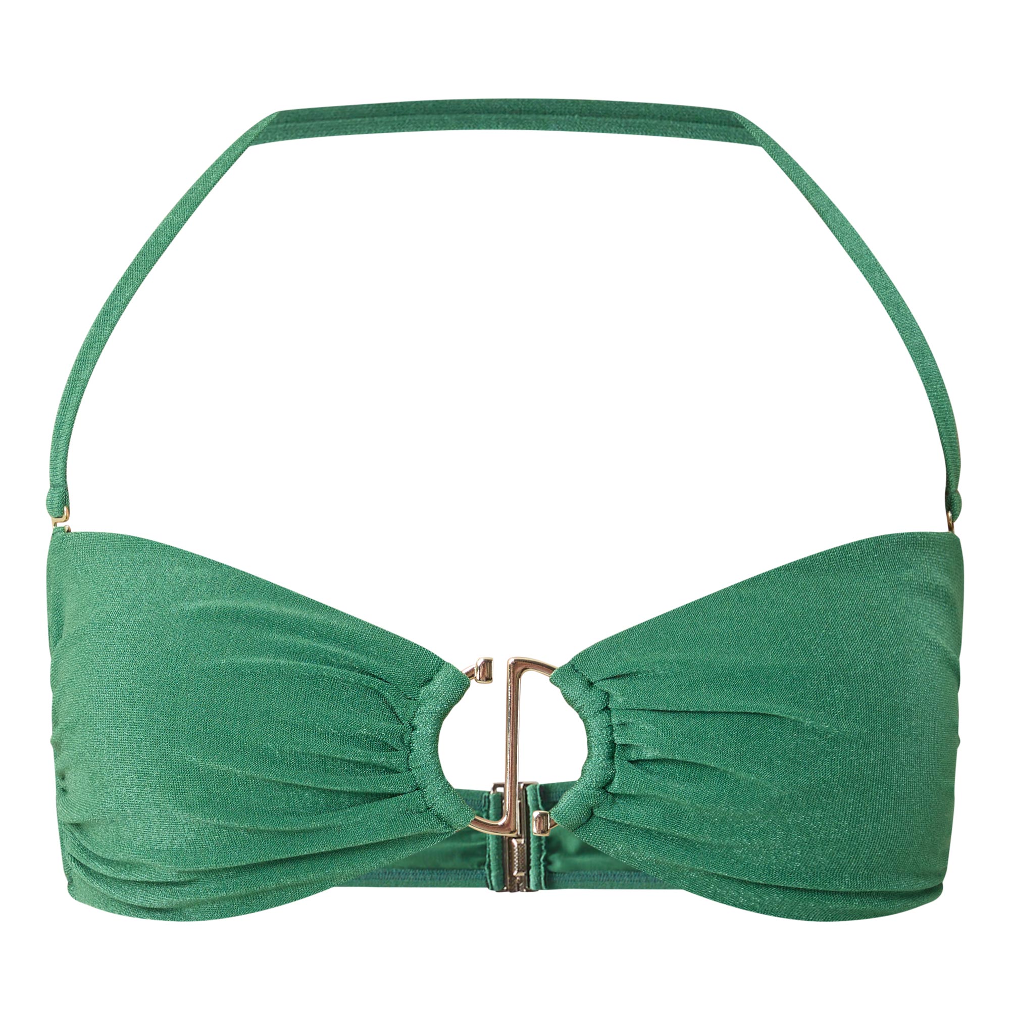 - Detachable halterneck strap, clasp closure to the back, ruched cups, ring hardware detail