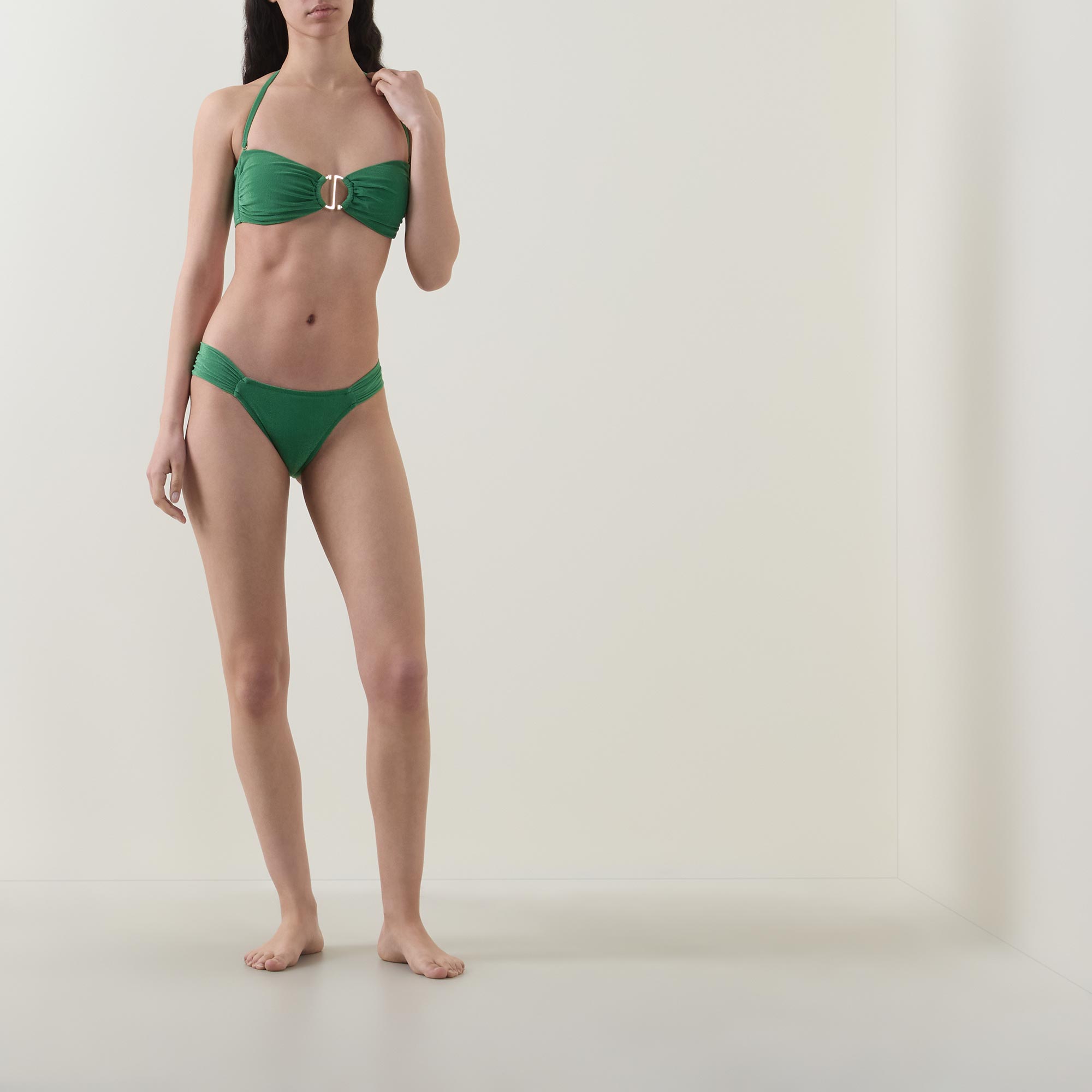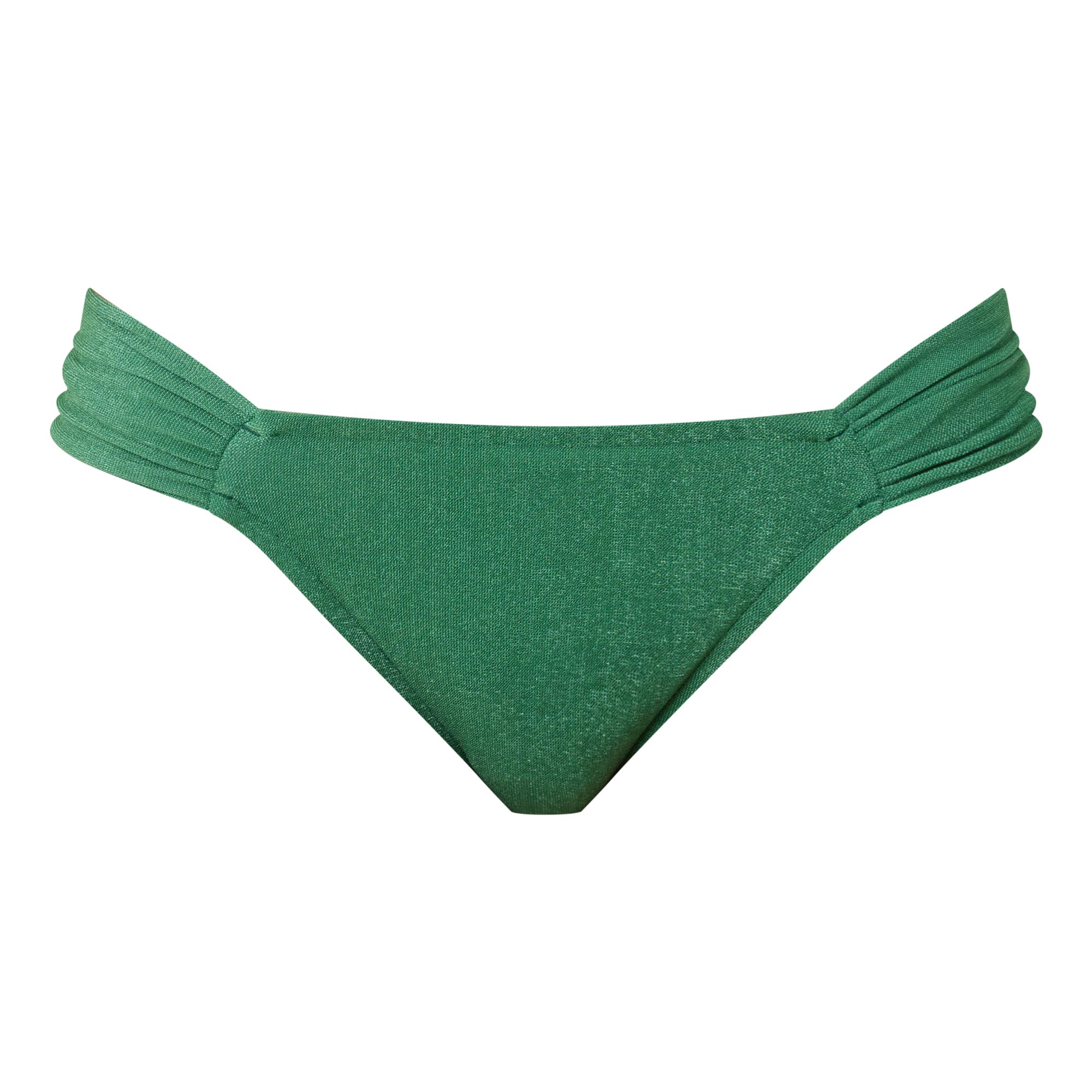 - Low-rise, cheeky coverage, ruched detailing, sparkle finish, fixed side straps