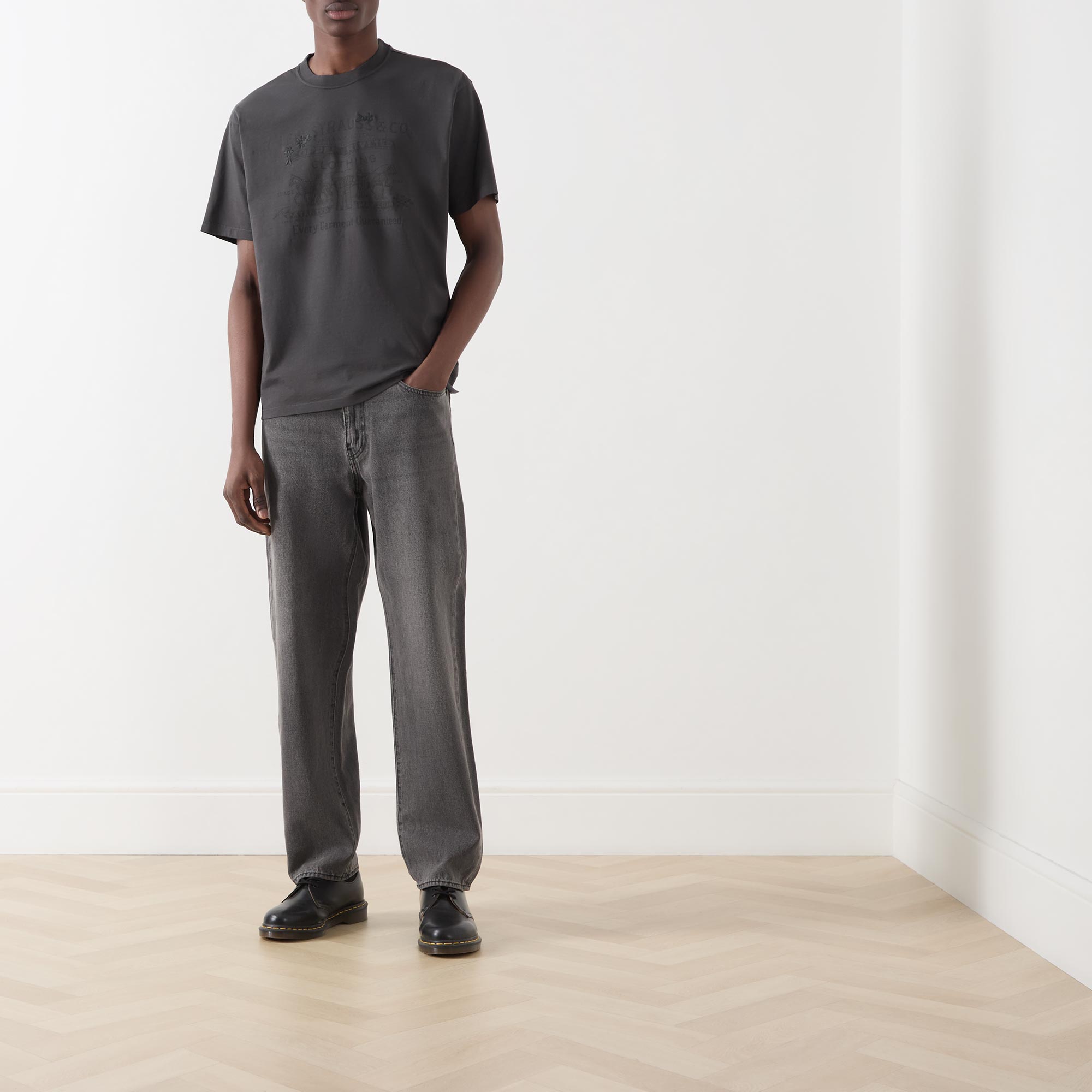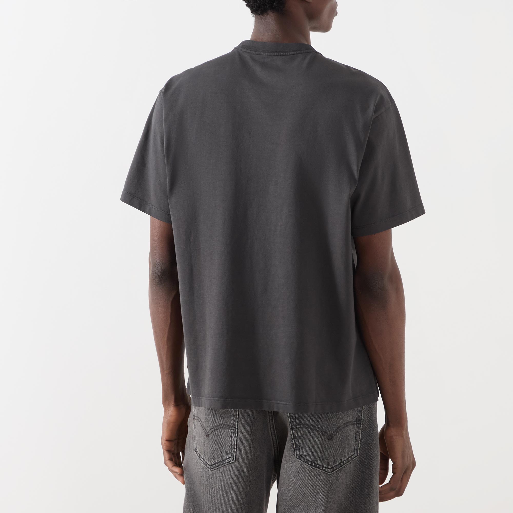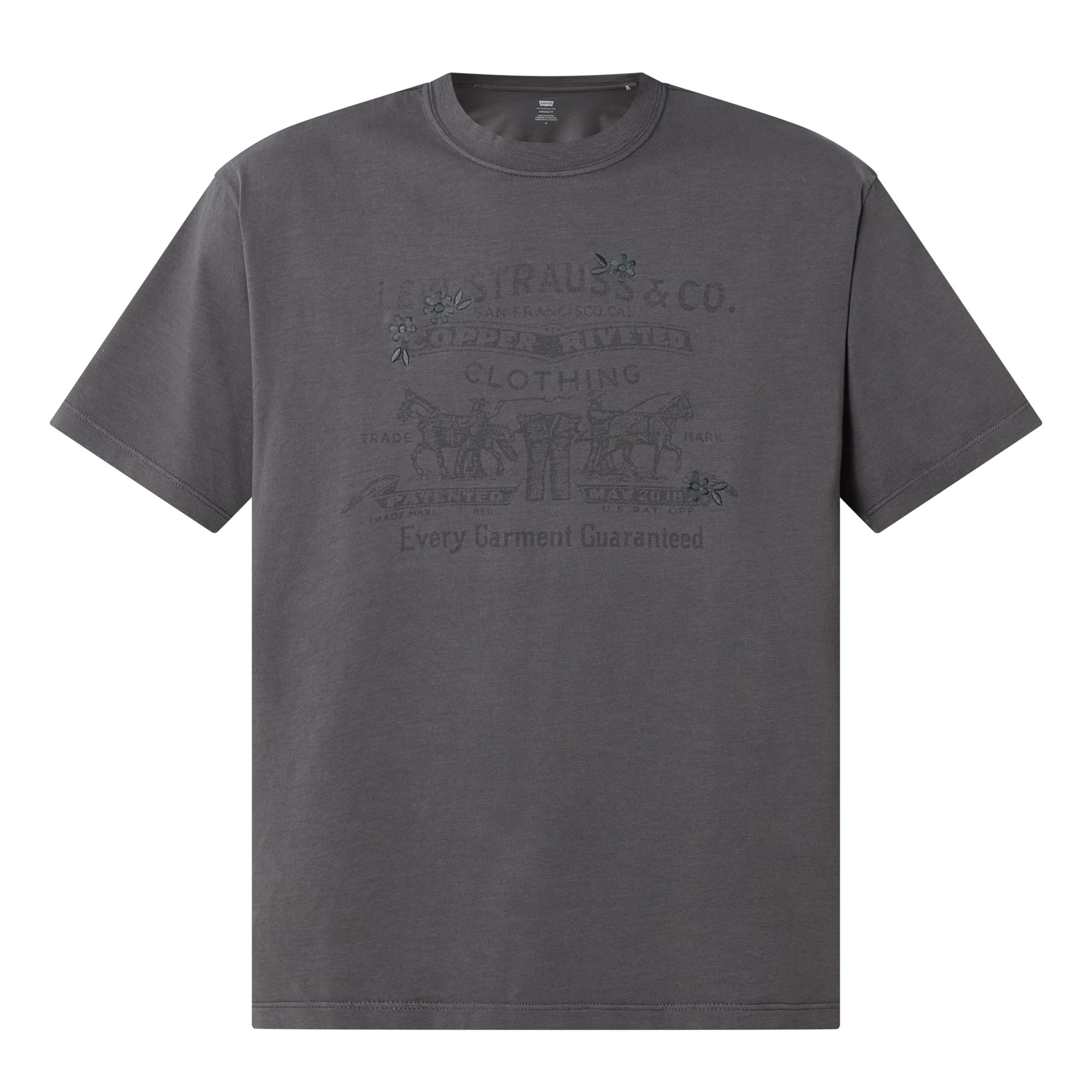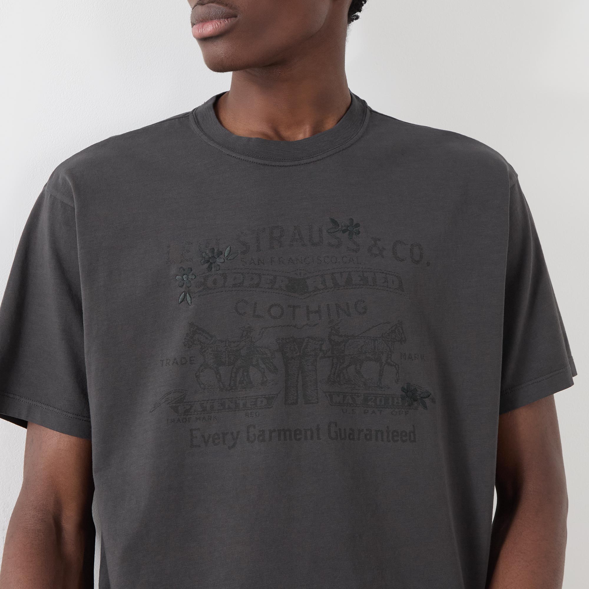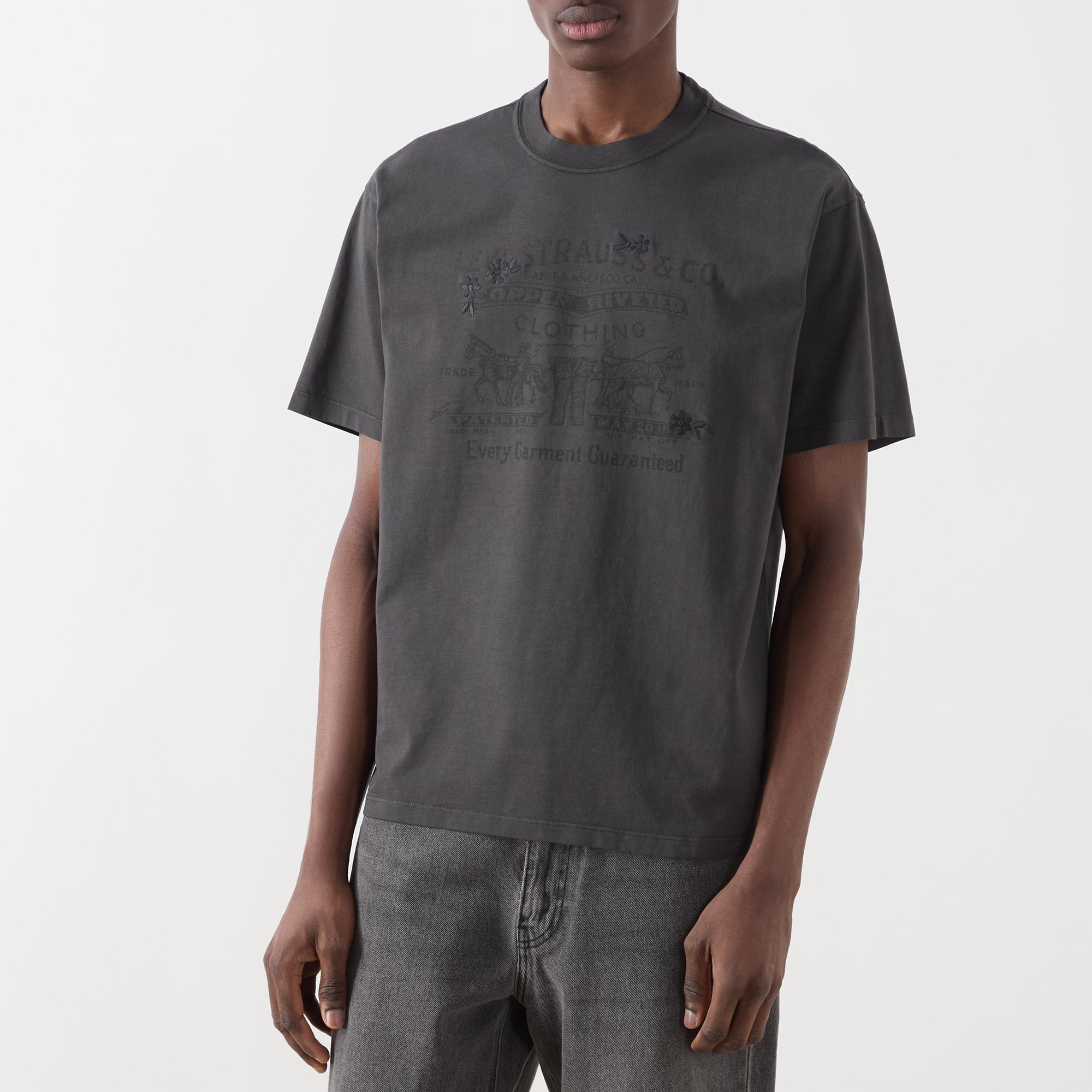 - Crew neck, dropped shoulders, short sleeves, straight hem, vintage-inspired tonal logo graphic on the chest, tonal stitching, smooth finish