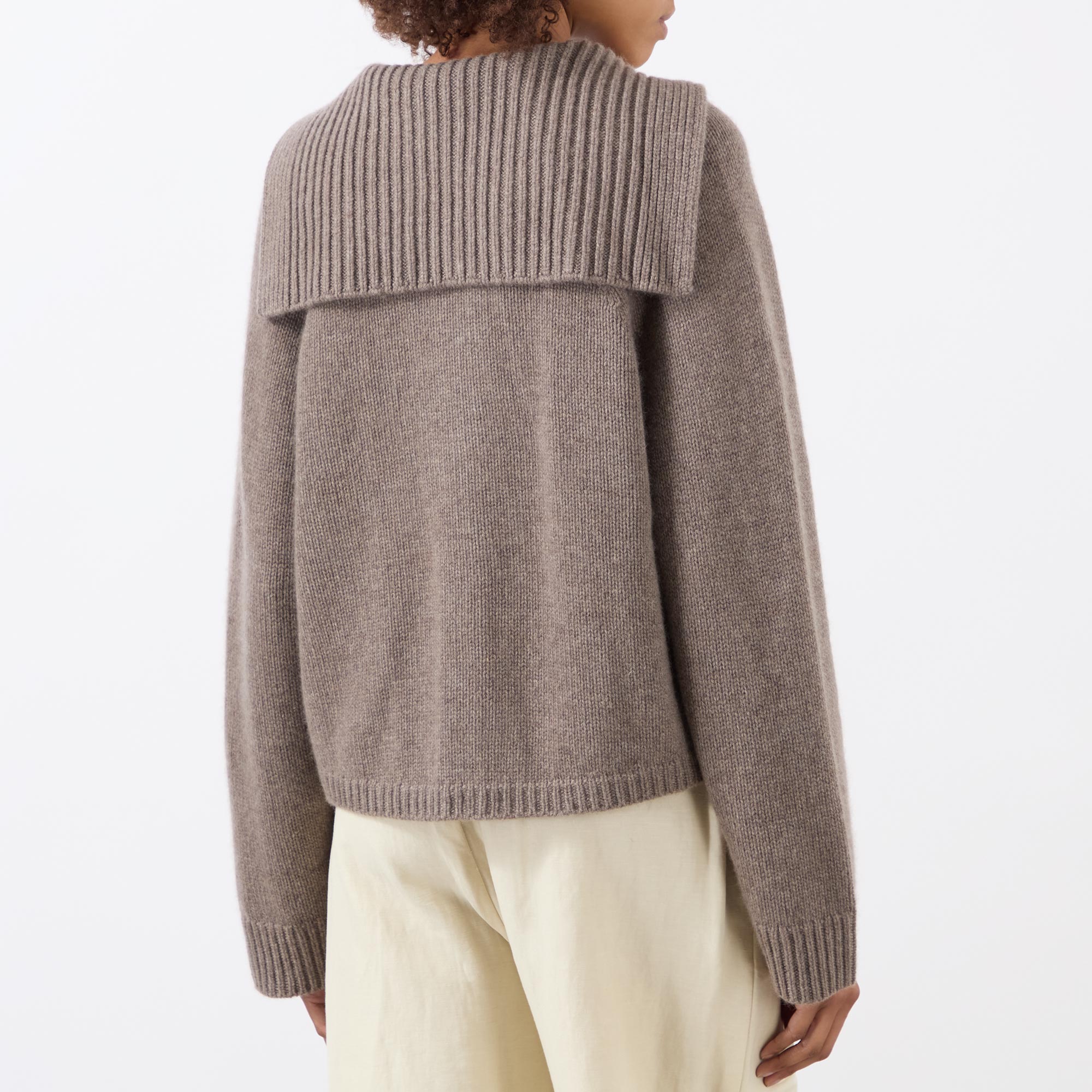 - Exaggerated collar, long sleeves, ribbed knit, button fastenings, straight hemline