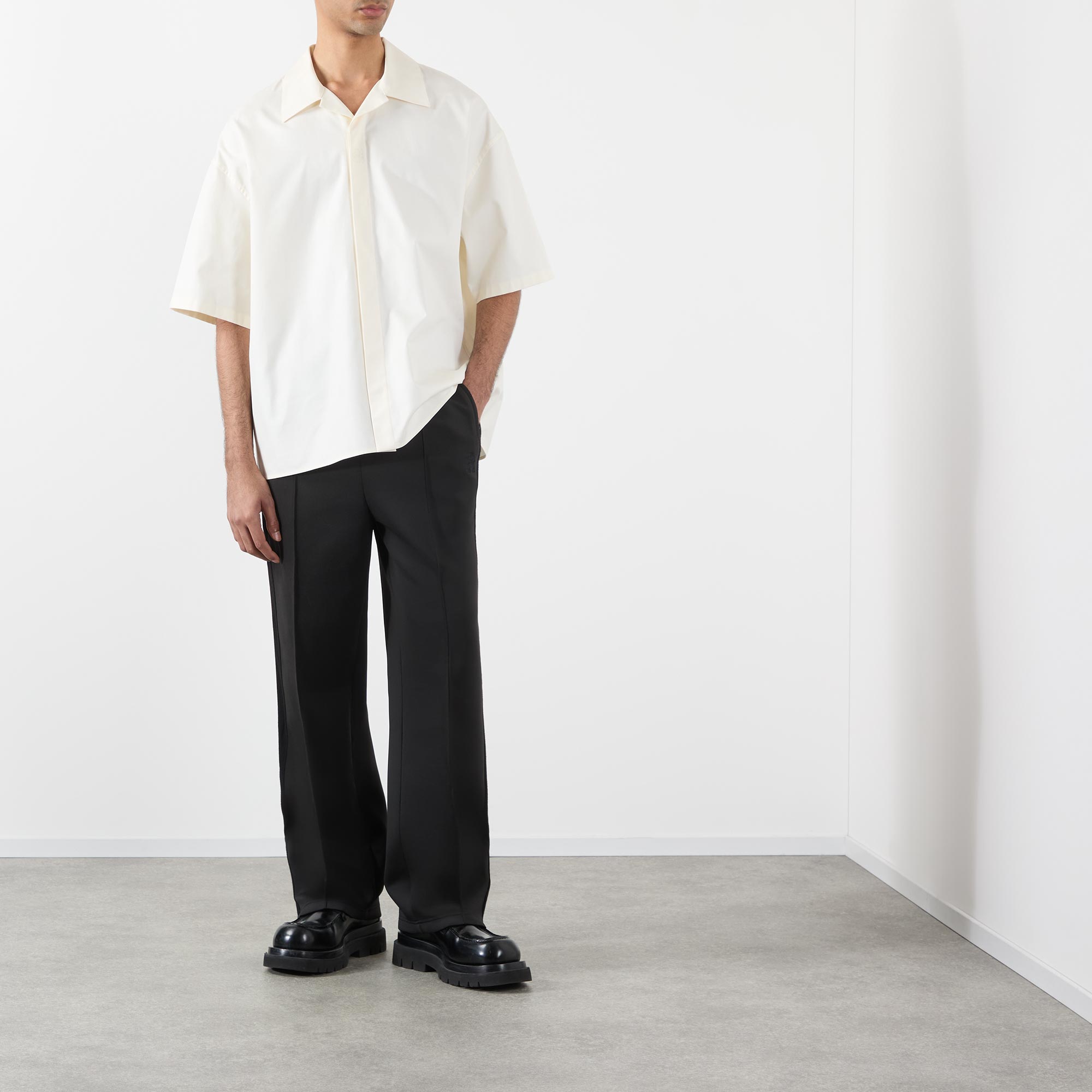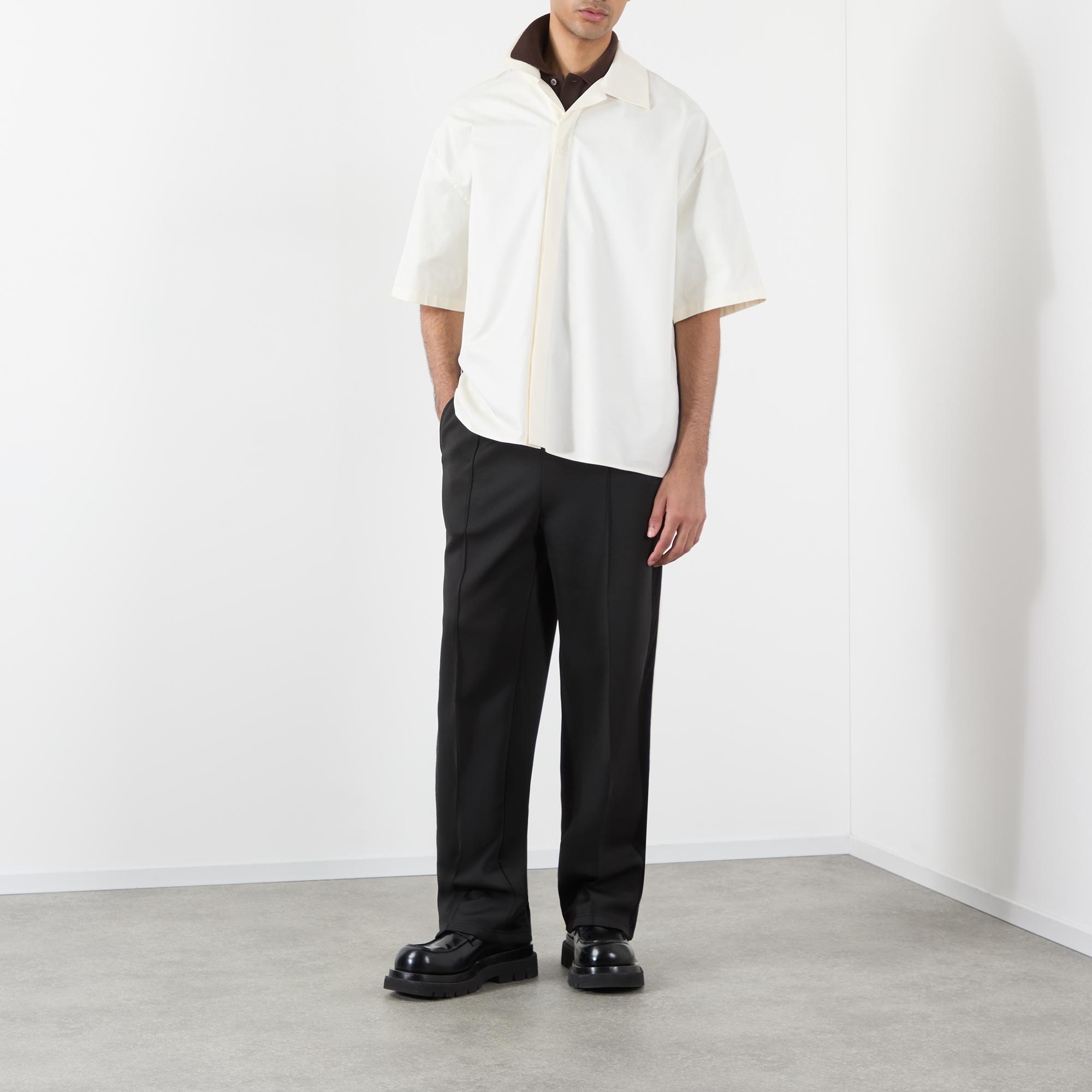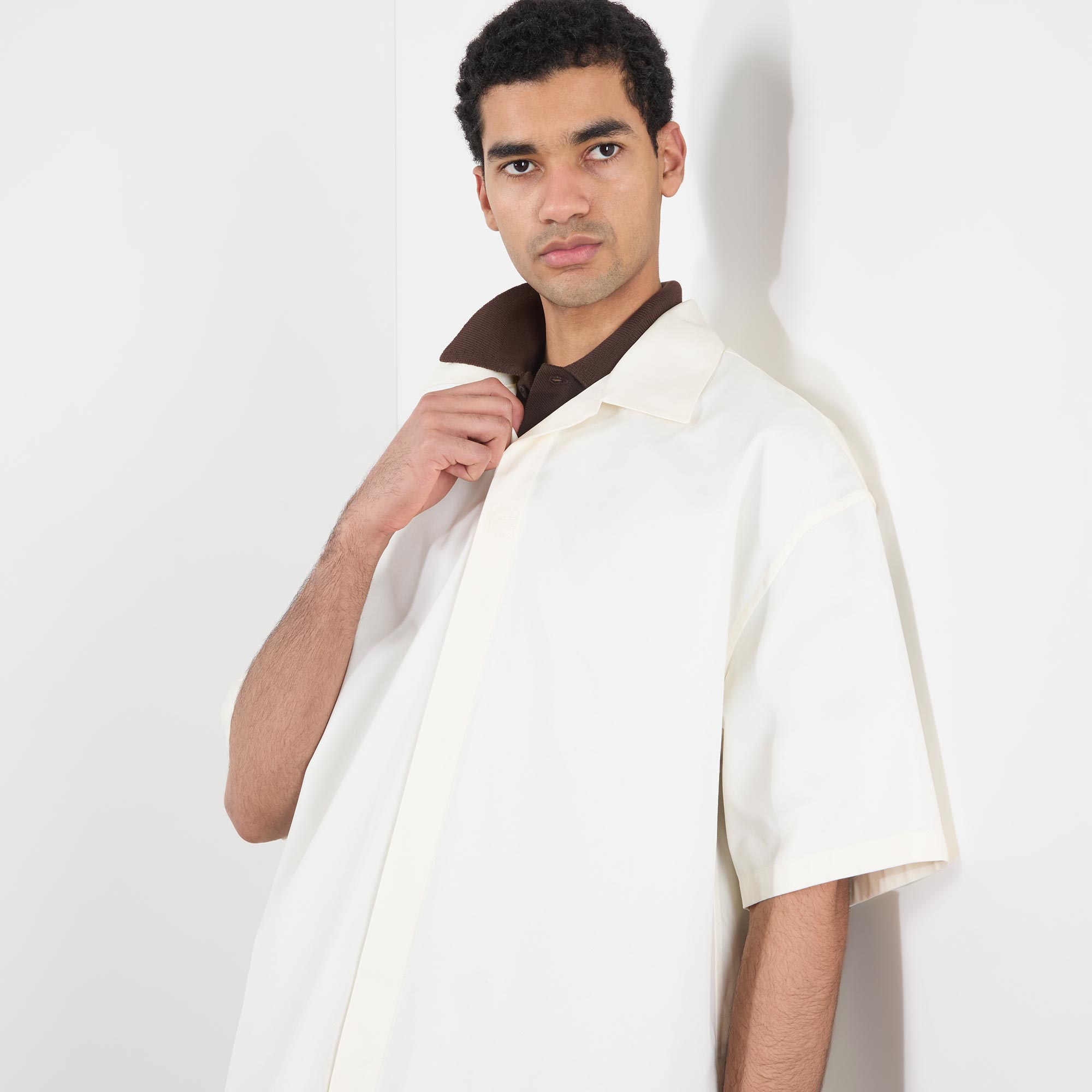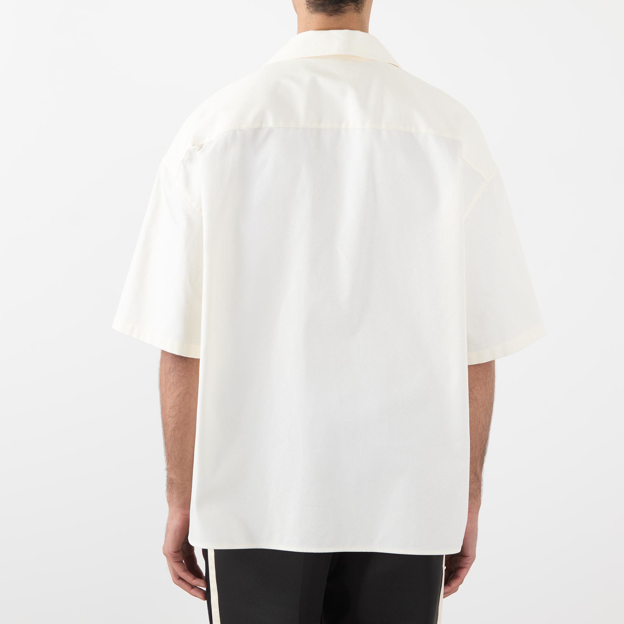 • Notched collar, short sleeves, concealed button placket, logo detail, straight hemline