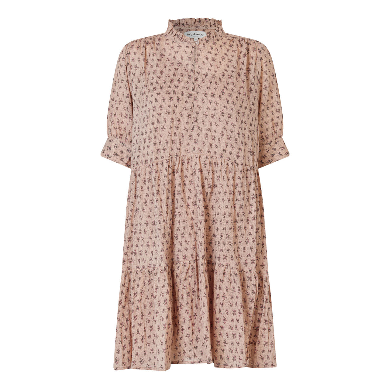 - Printed, high ruffled collar with button fastening, V-neckline, tiered skirt, short sleeves, buttoned cuffs, mini length