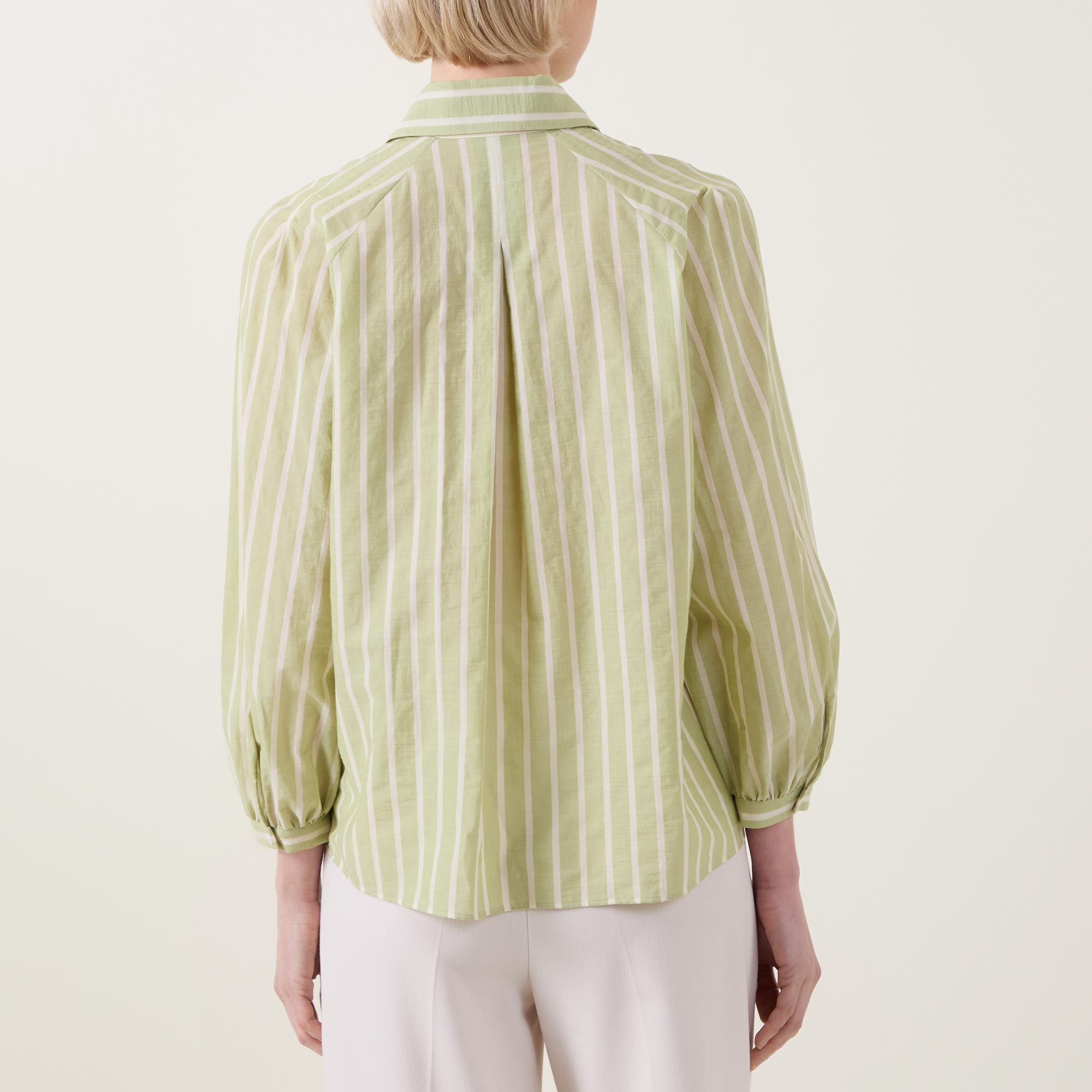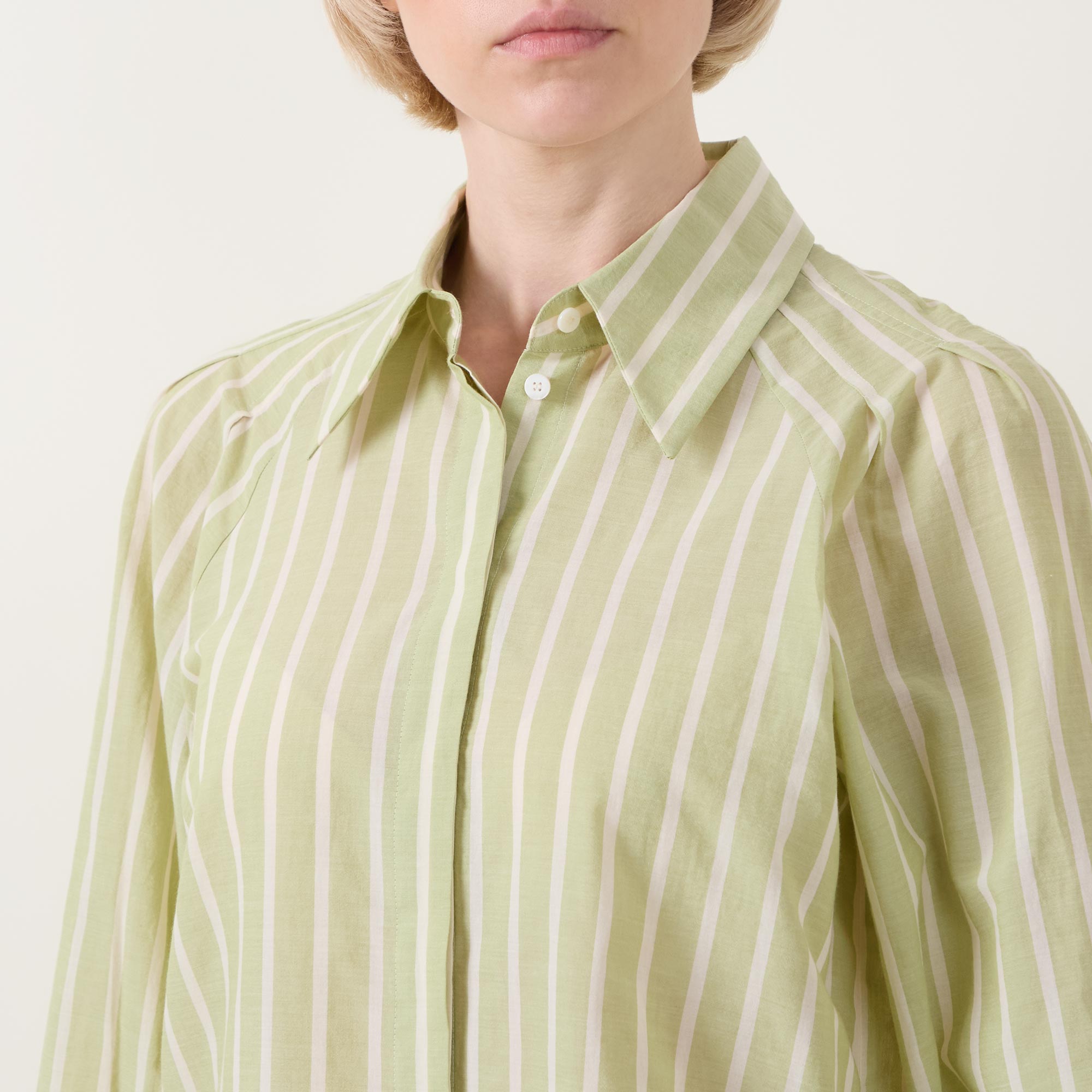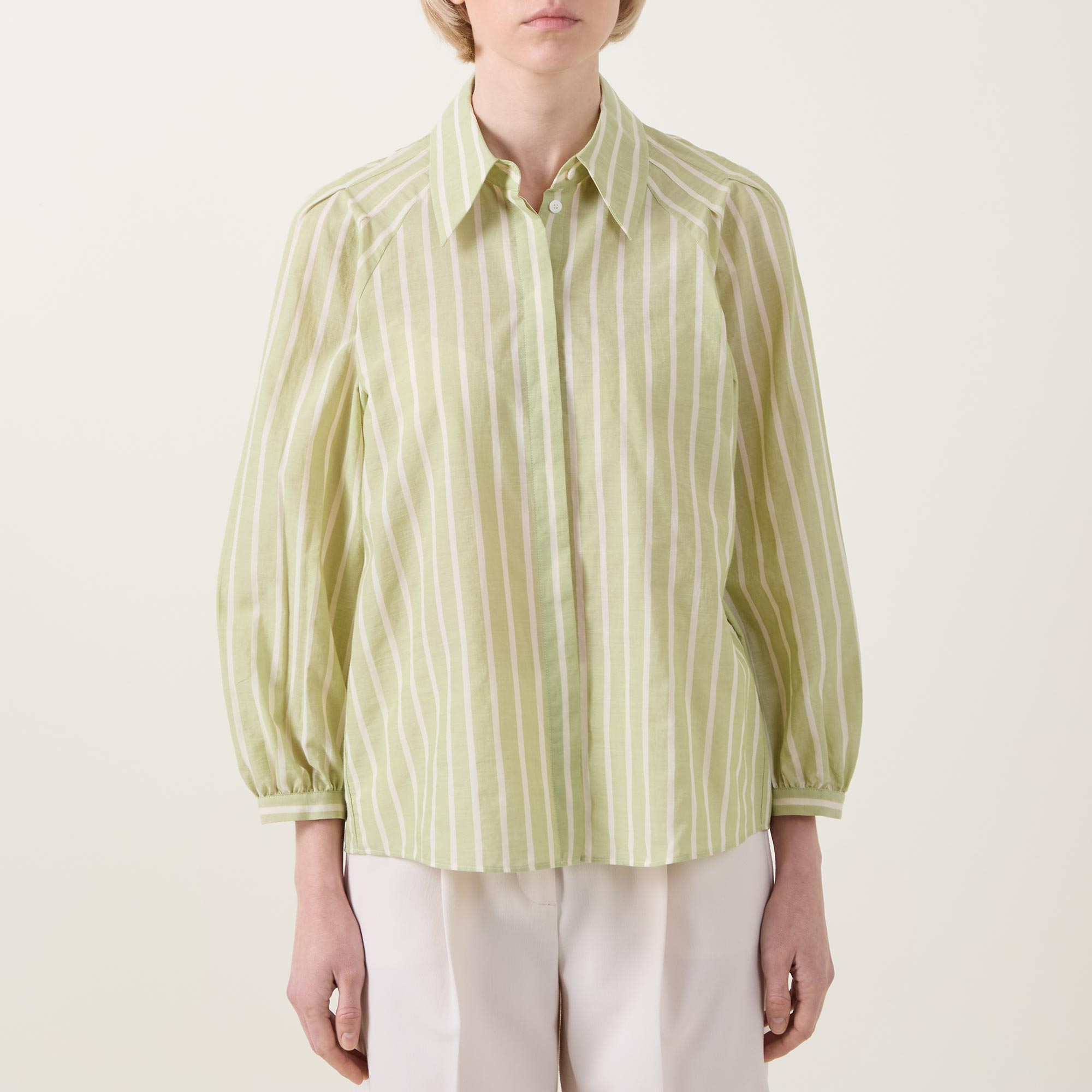 • Pointed collar, concealed button fastening with visible top button, three-quarter-length sleeves, buttoned cuffs, curved hemline, inverted pleat, stripe pattern