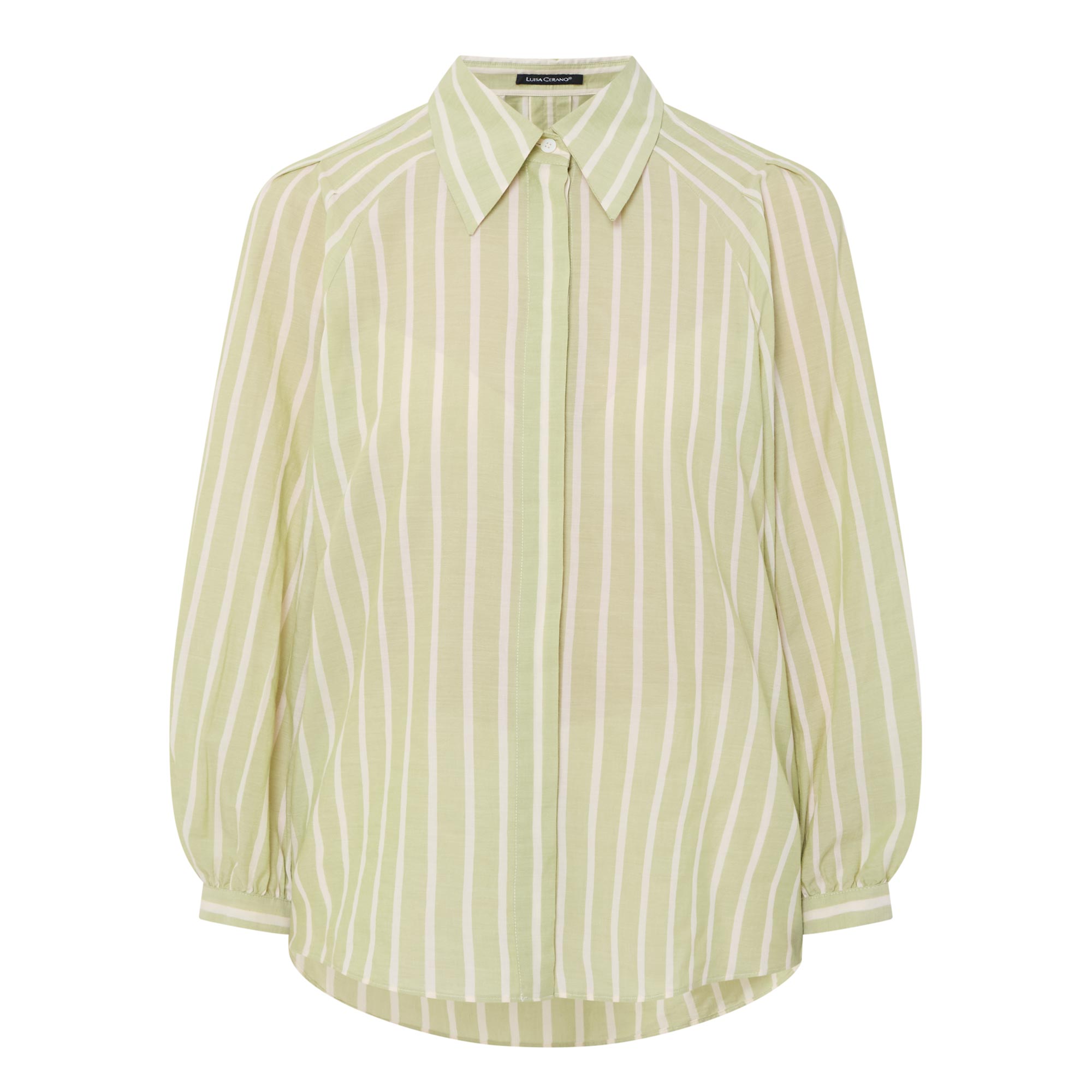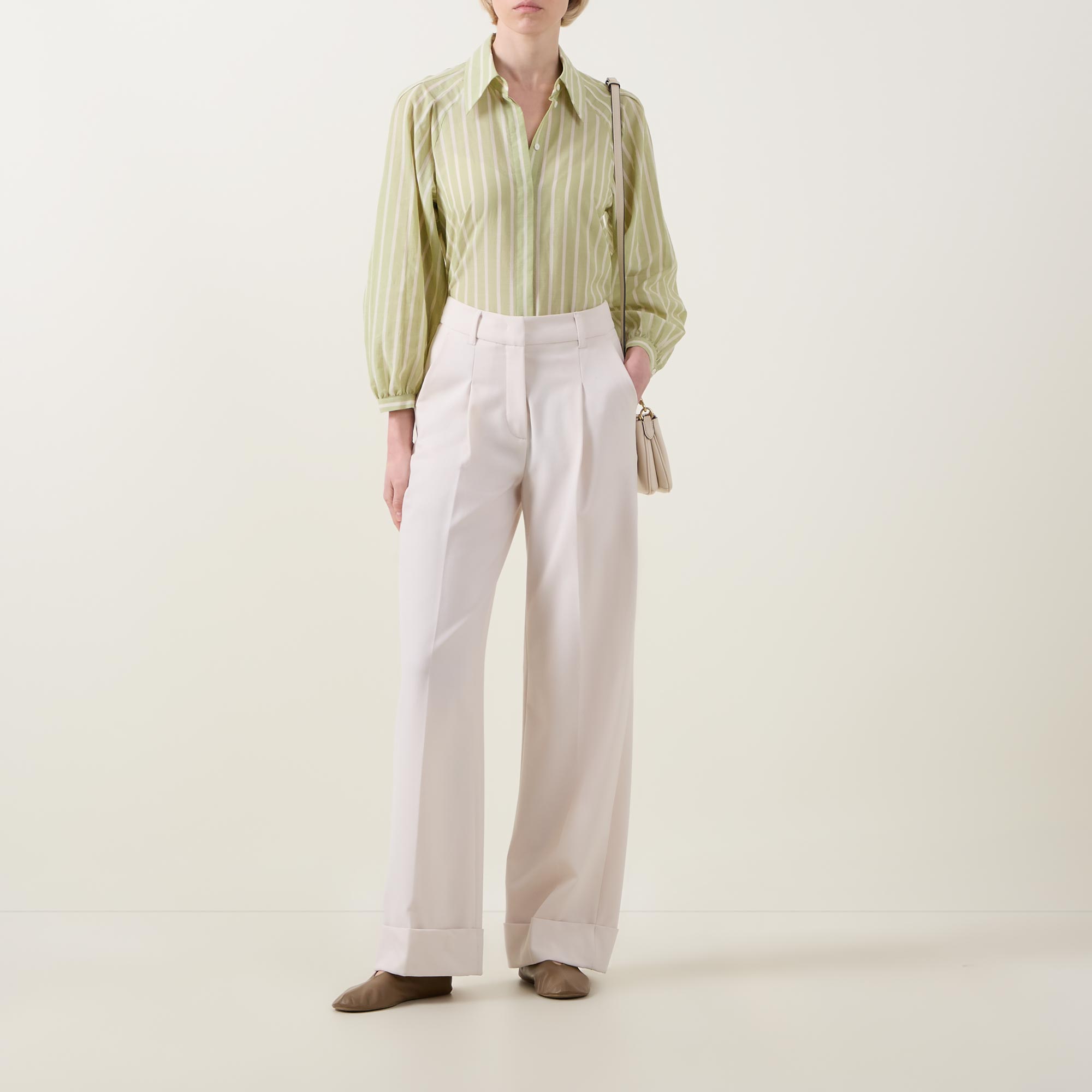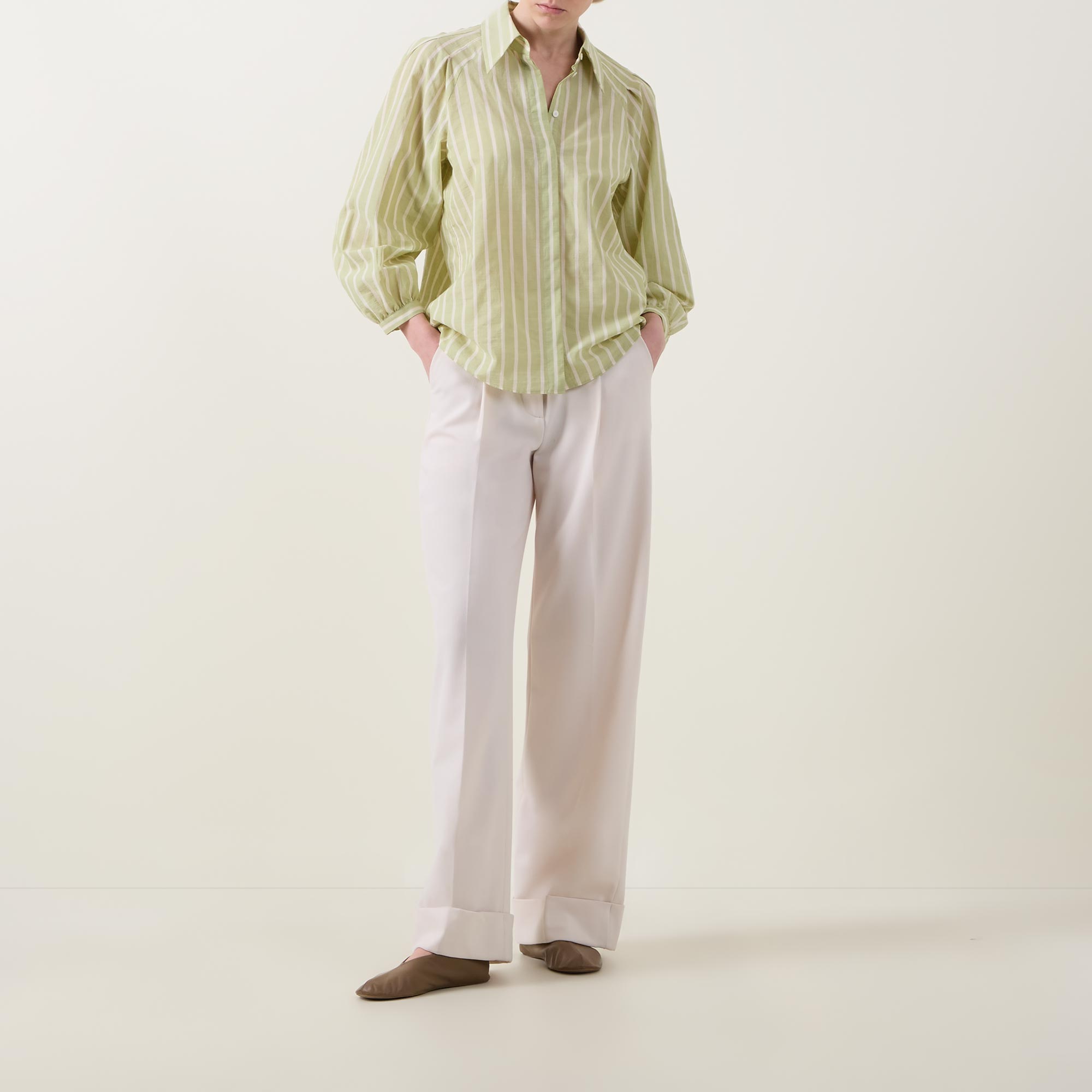 • Pointed collar, concealed button fastening with visible top button, three-quarter-length sleeves, buttoned cuffs, curved hemline, inverted pleat, stripe pattern