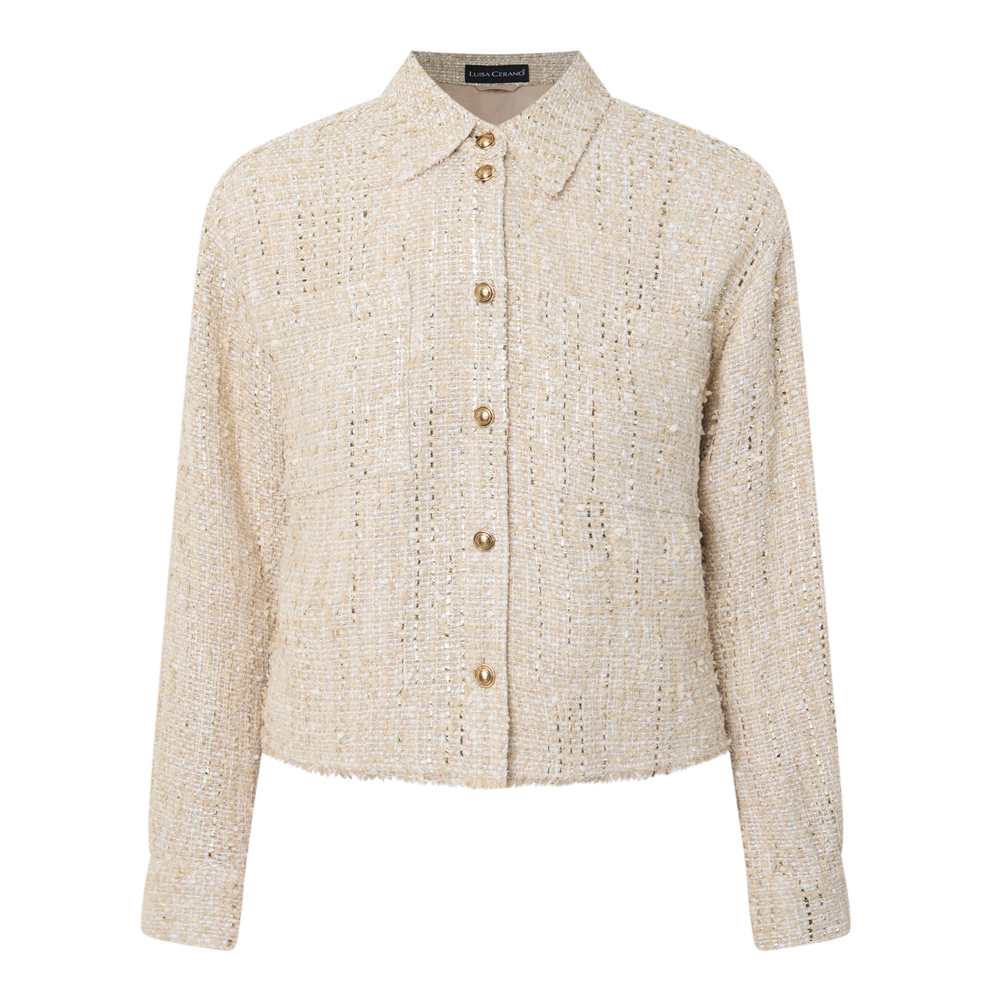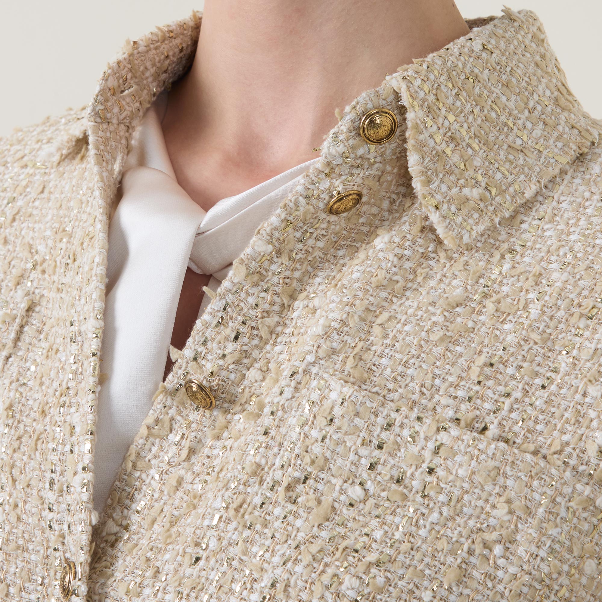 - Point collar, long sleeves, dropped shoulders, front button placket, gold-tone buttons, two patch pockets, single-button cuffs, back box pleat, raw frayed hemline, textured tweed finish