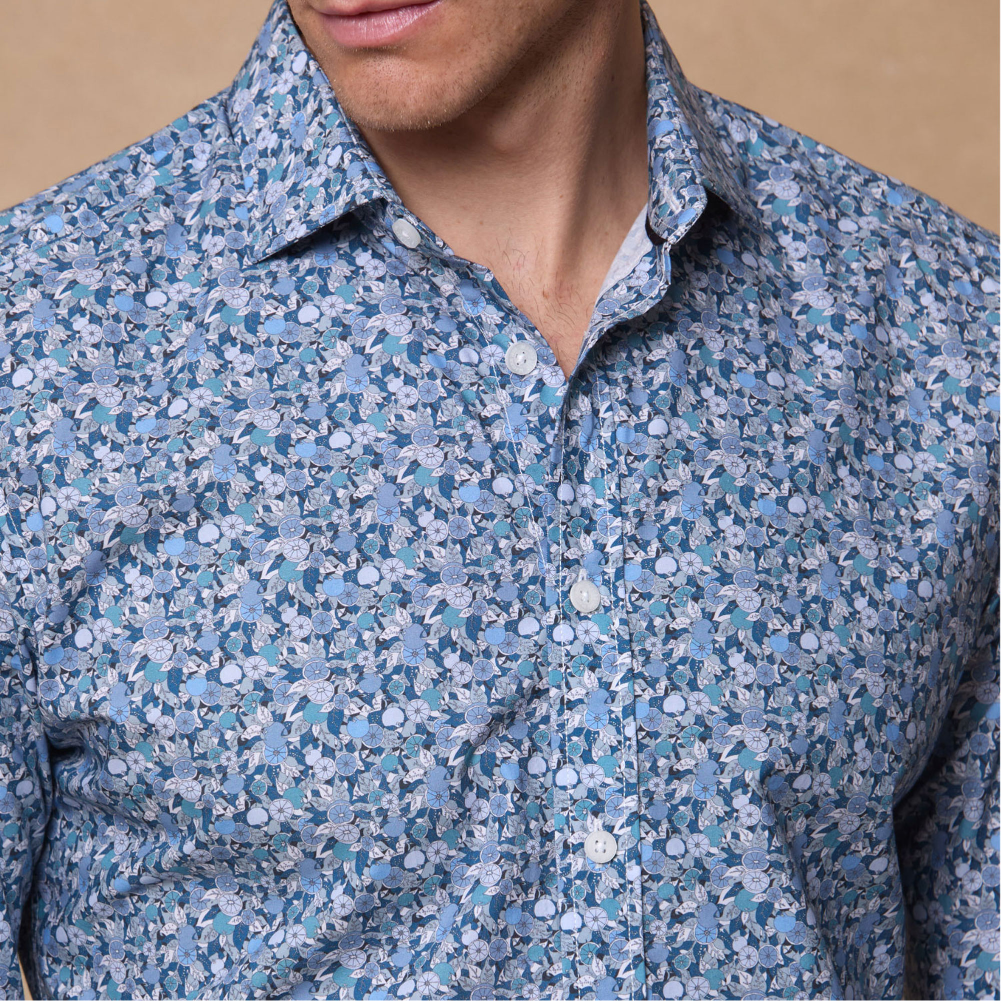 This fitted, Kippure shirt is a tailored summer essential. Crafted in blue Liberty Print cotton with a vibrant tangerine motif, it brings fresh seasonal style to your wardrobe.