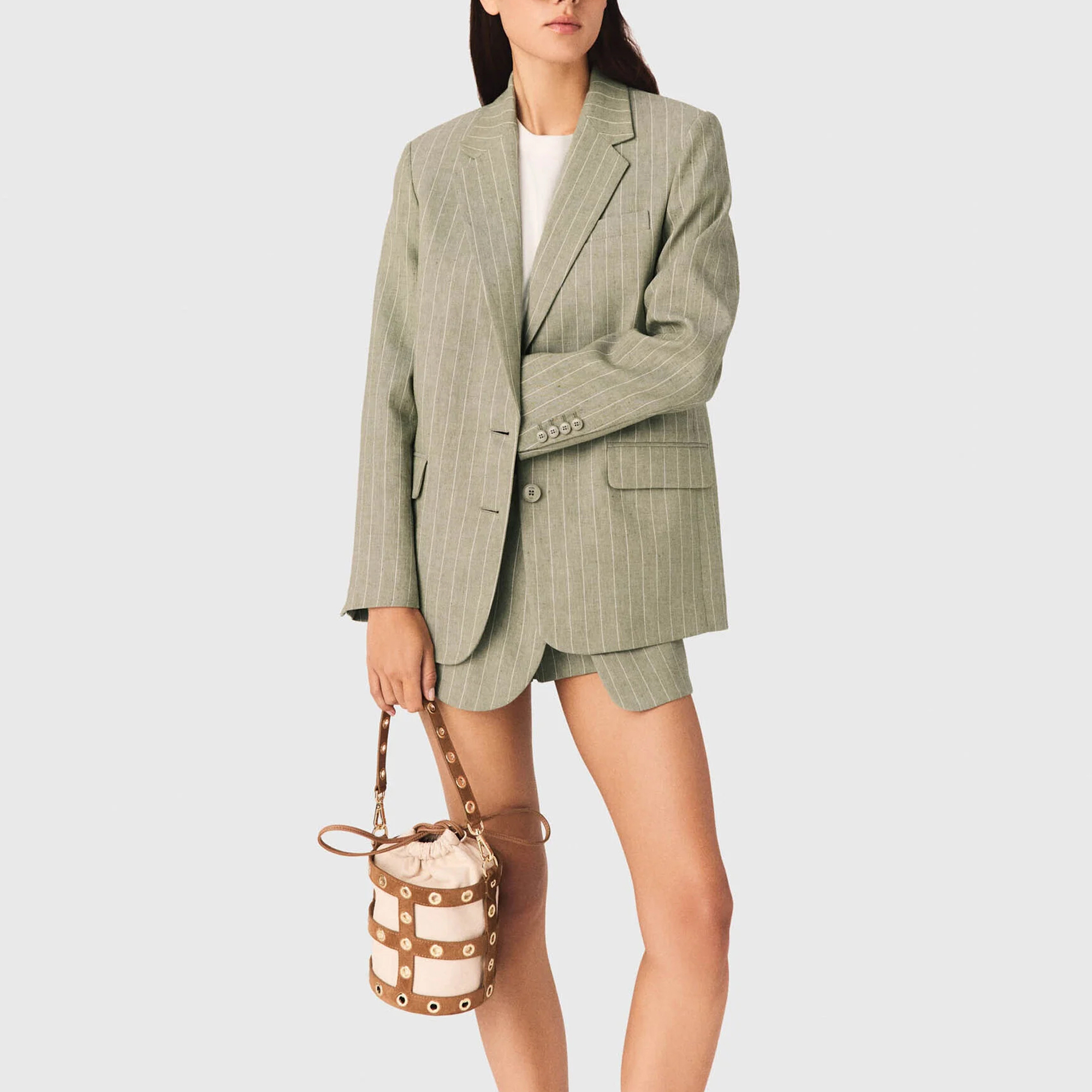 - Striped, pinstripe pattern, straight style, single-breasted cut, notched lapels, welt and flap pockets, natural texture, visible weave