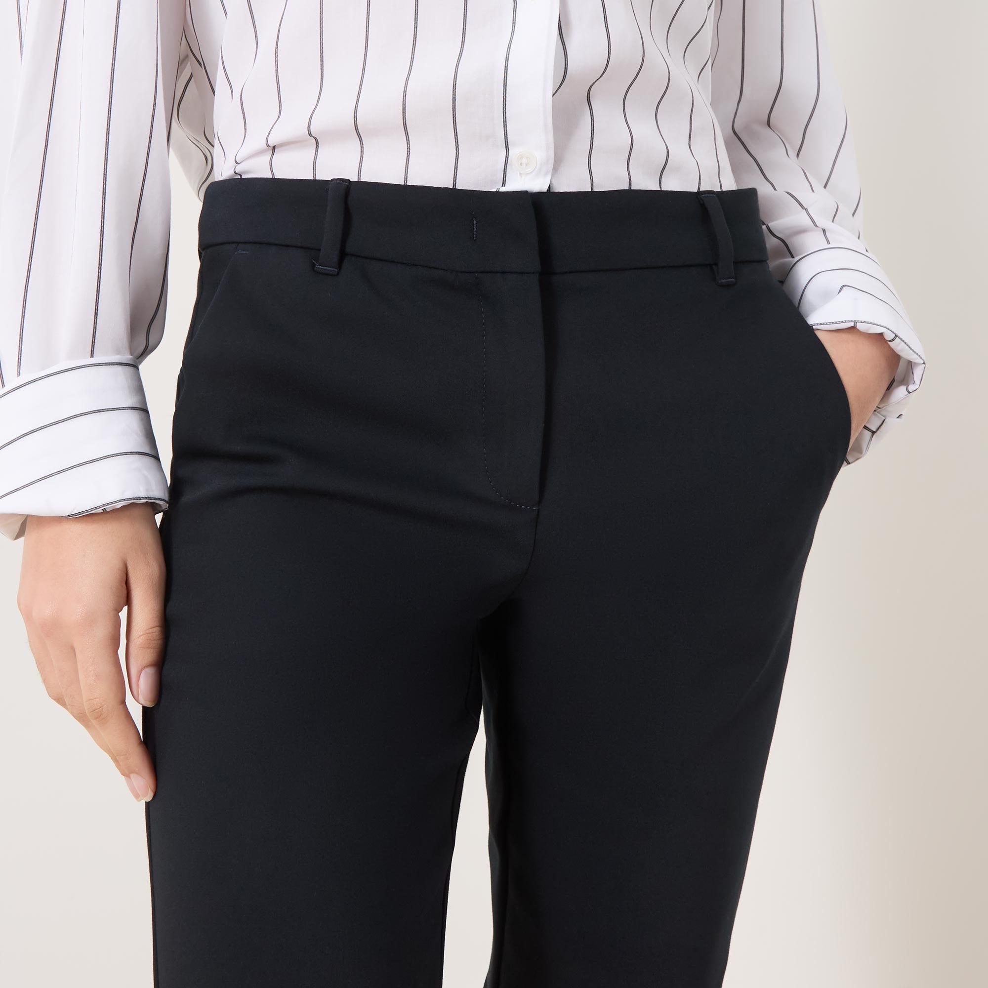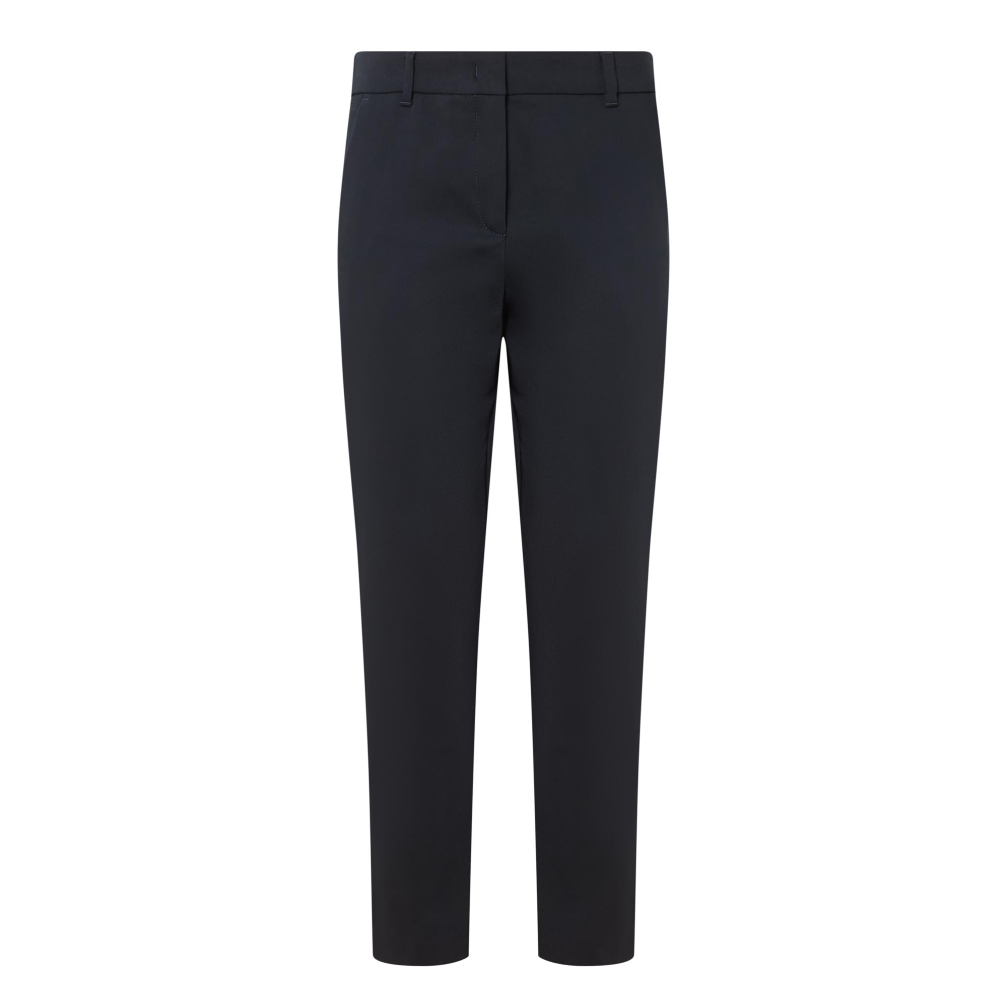 • Concealed zip-fly and hook-and-bar fastening, belt loops, two side in-seam pockets, two rear welt pockets, mid-rise, slim-cut leg, pressed creases, smooth fabric