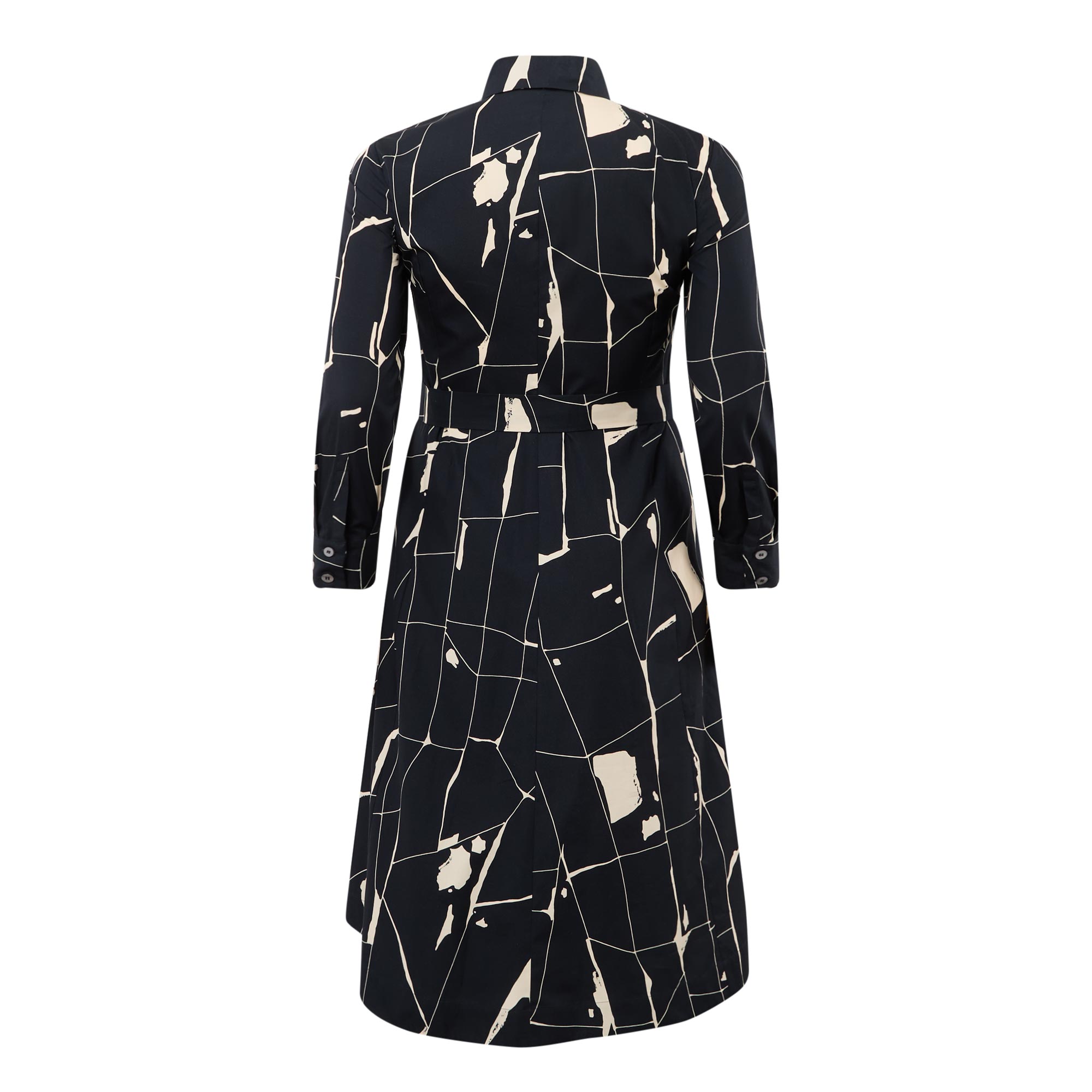 • Point collar, long sleeves, concealed button placket, printed design, double-button cuffs, tie-fastening self-fabric belt, shirt style, midi length, smooth fabric