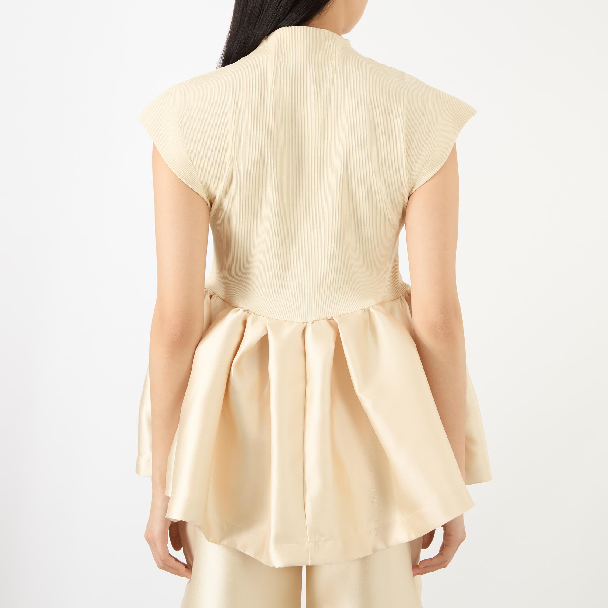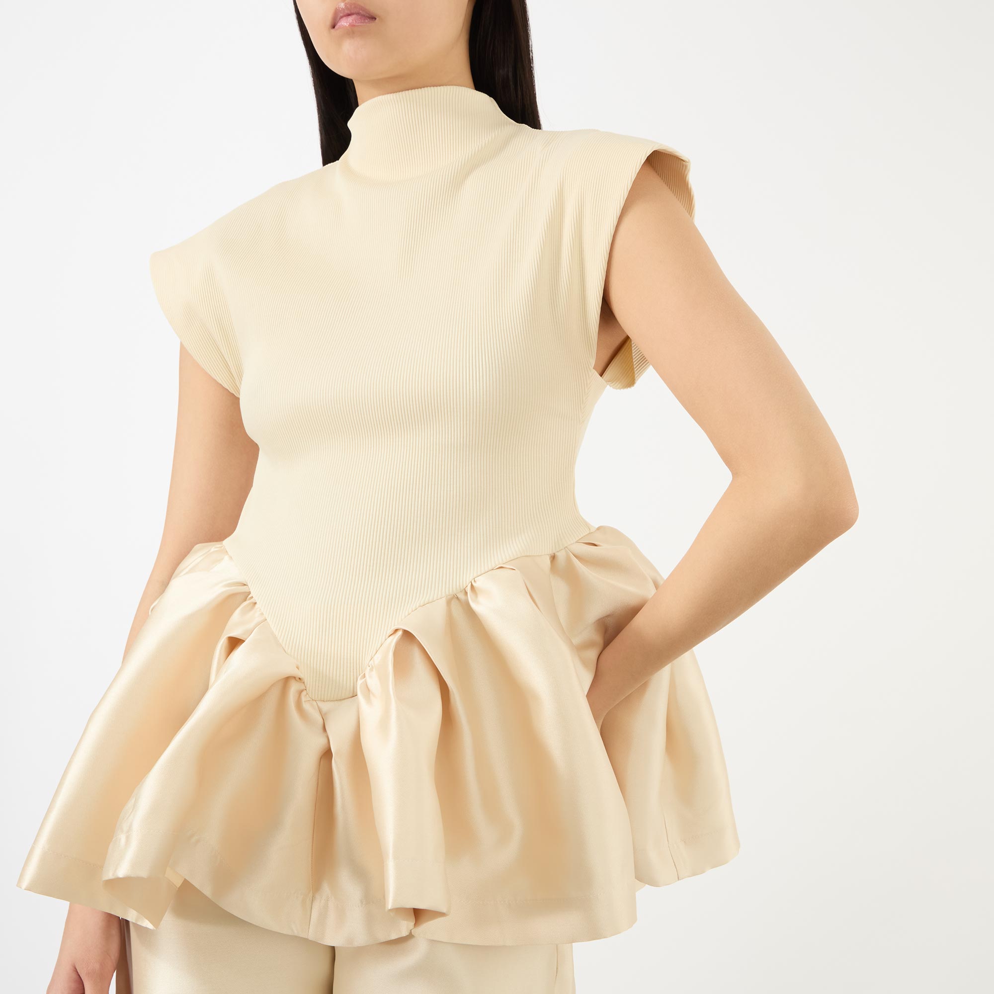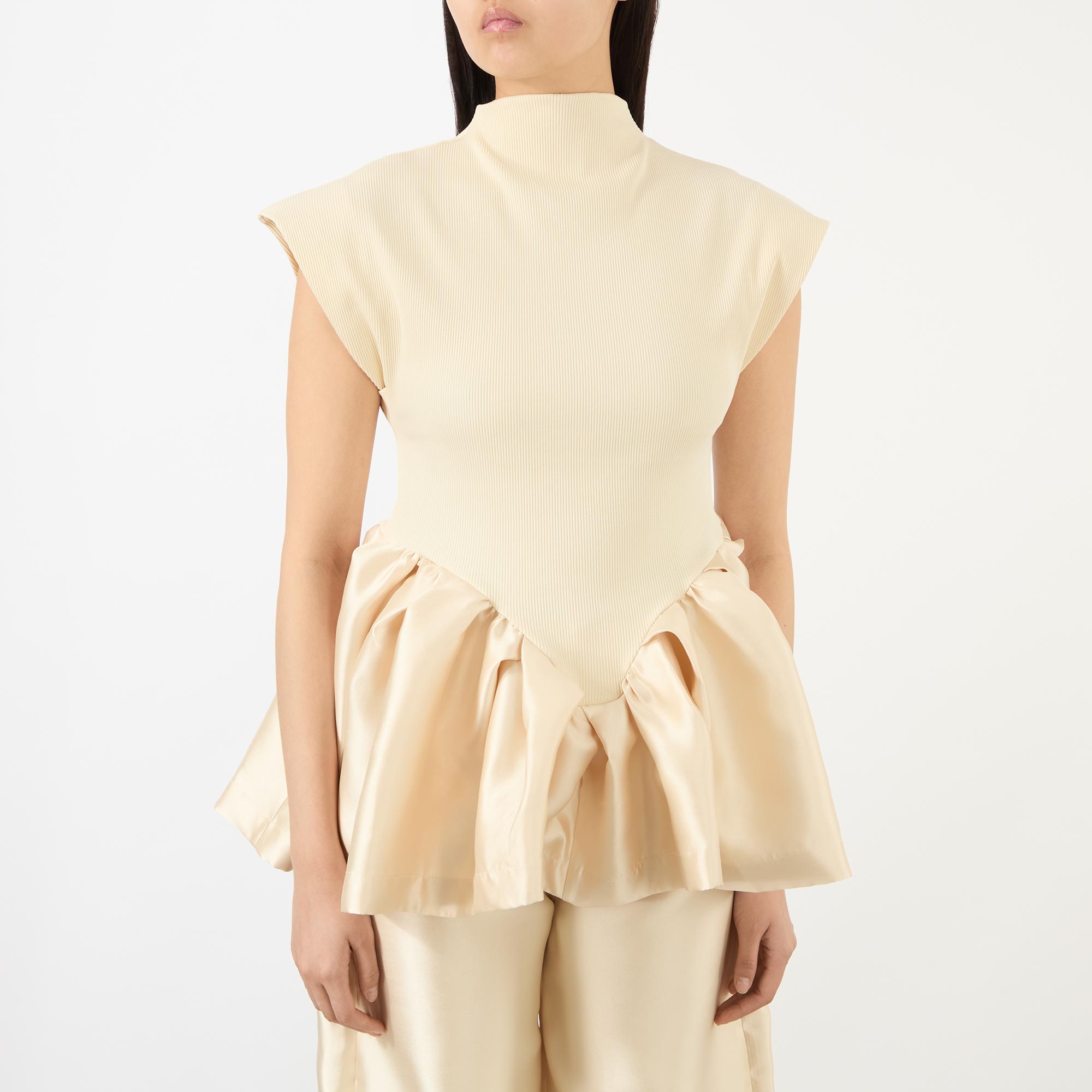 - High turtle neckline, cap sleeves, fitted through the waist, ribbed bodice, contrasting peplum hem in a satin finish