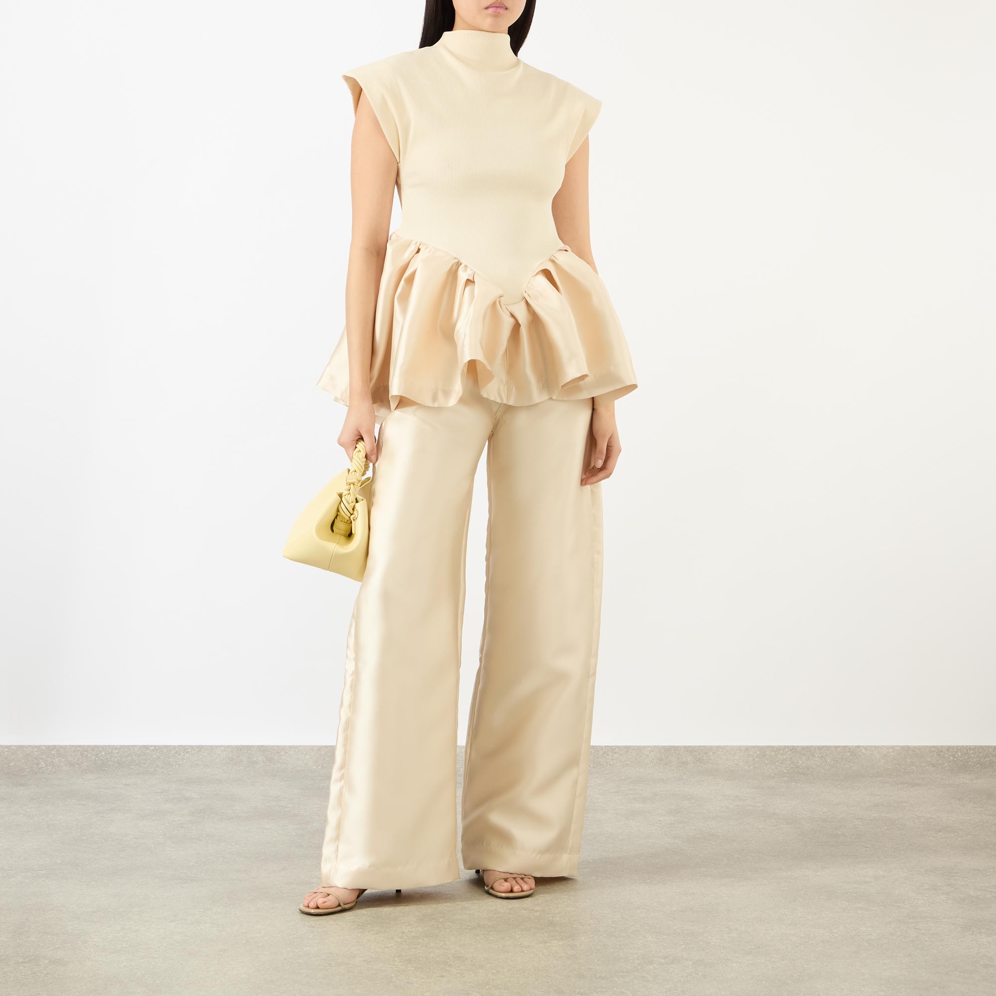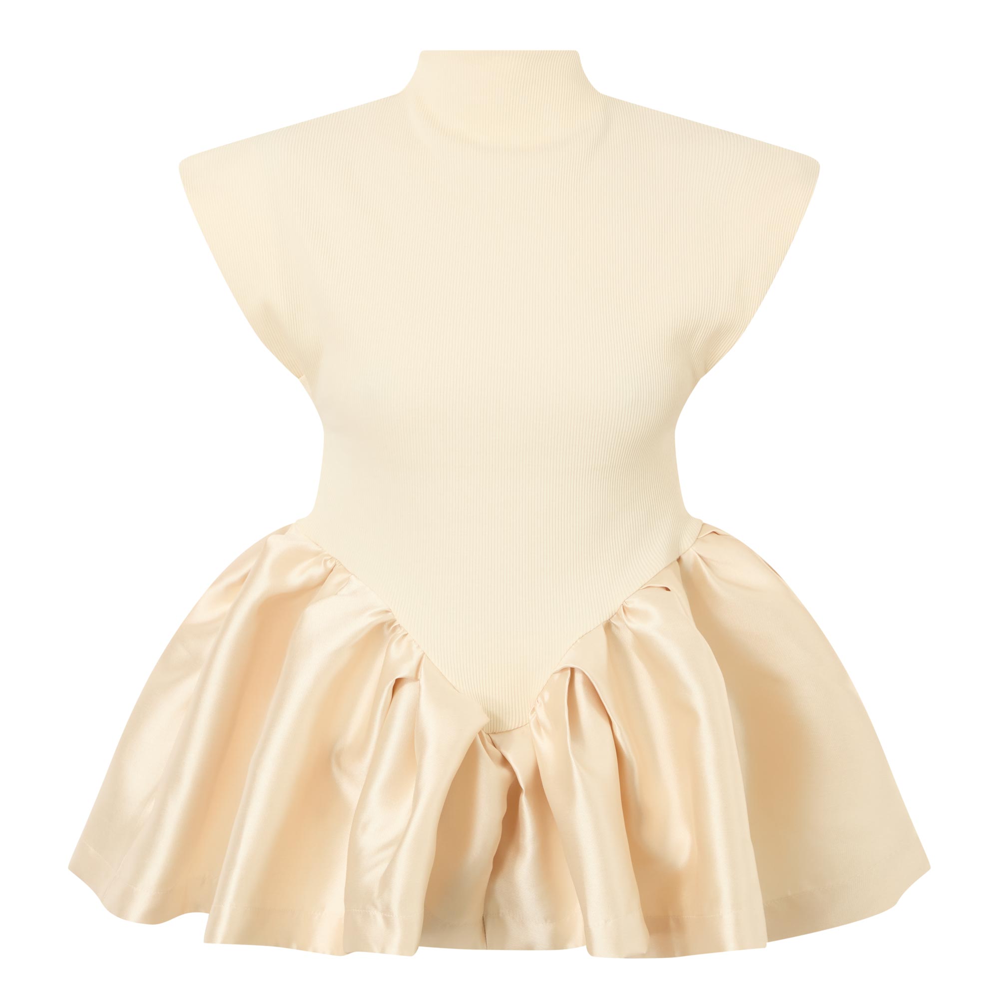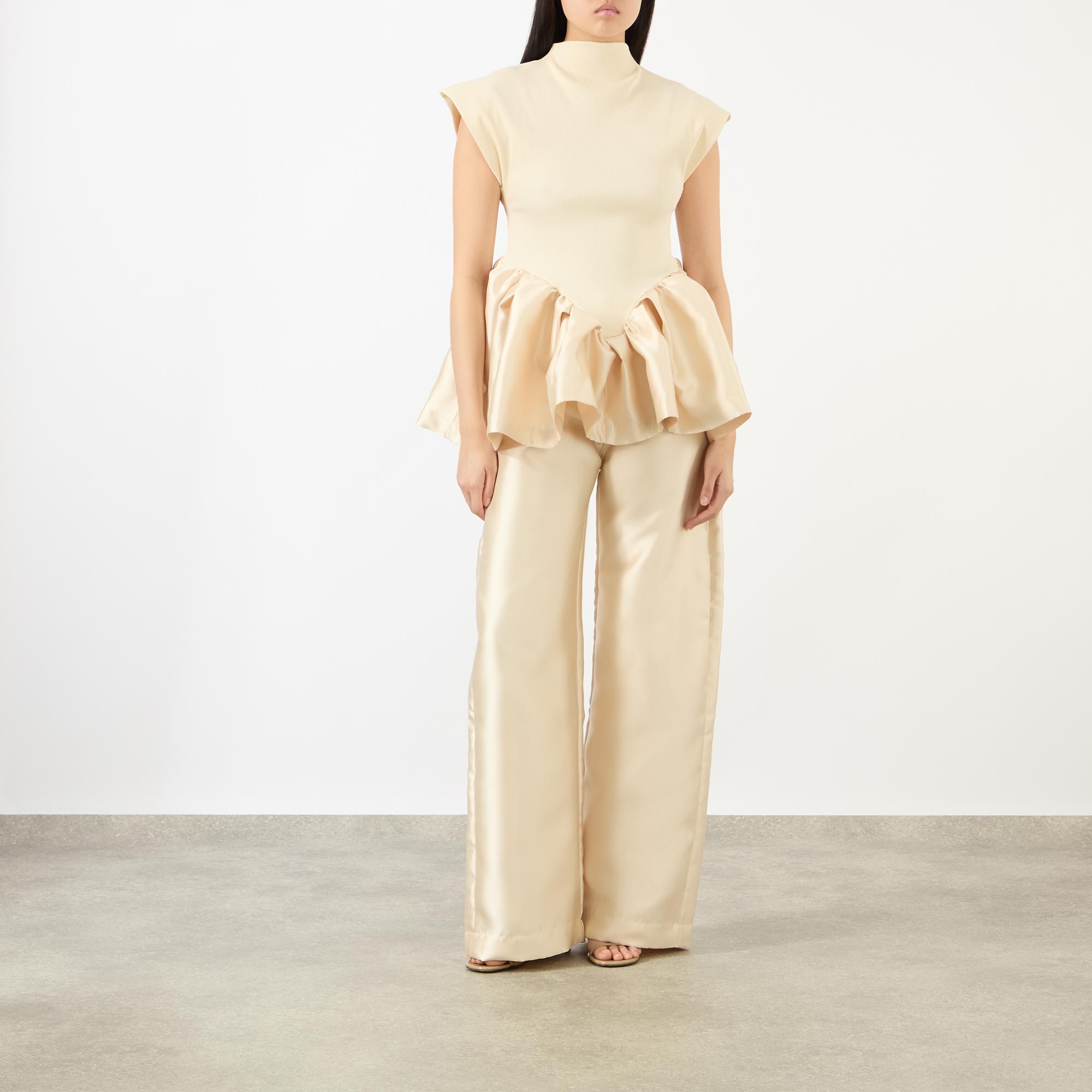 - High turtle neckline, cap sleeves, fitted through the waist, ribbed bodice, contrasting peplum hem in a satin finish