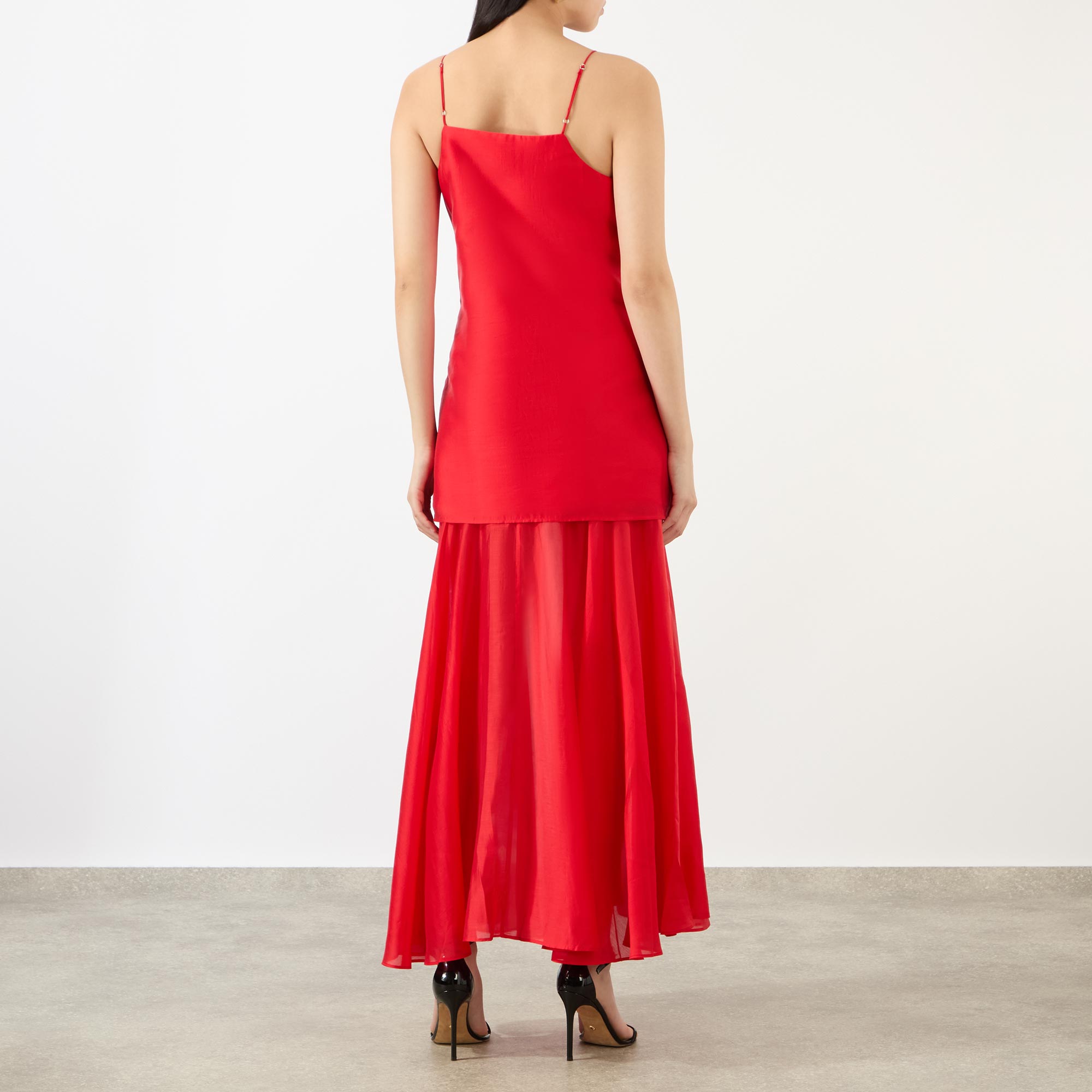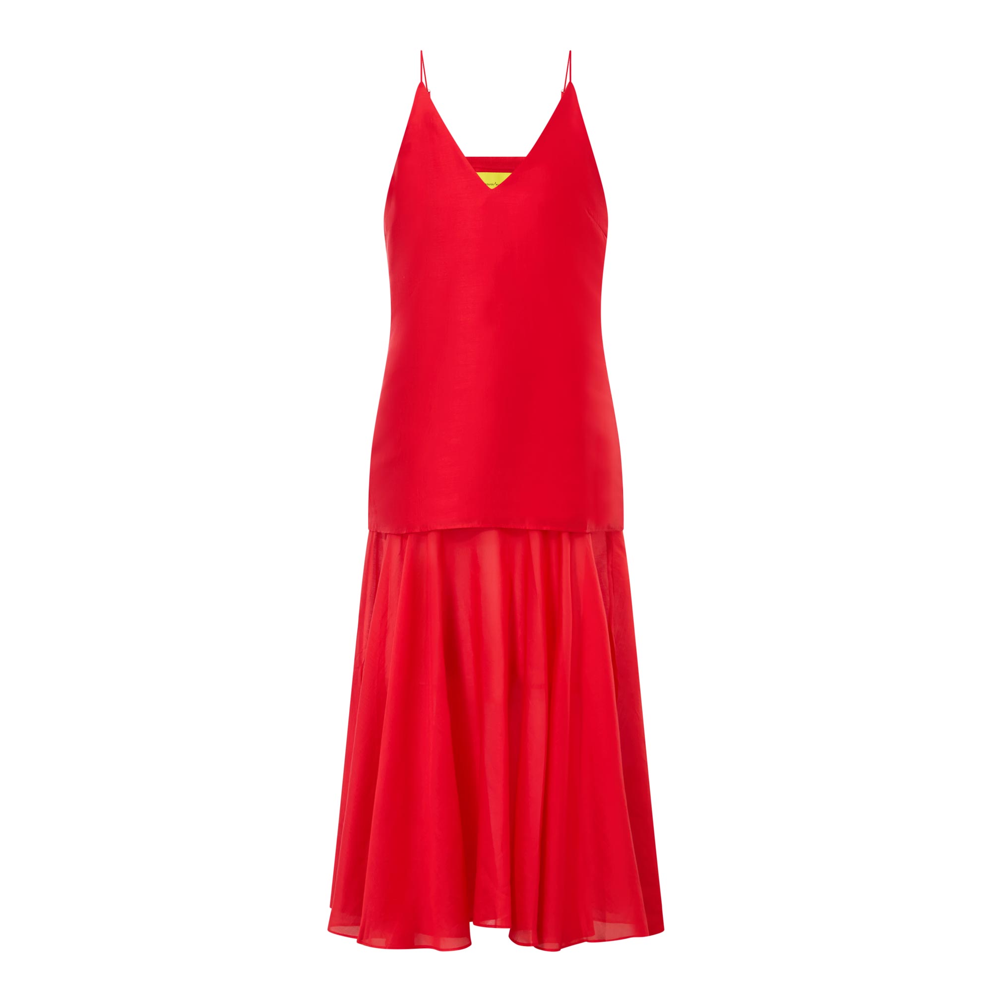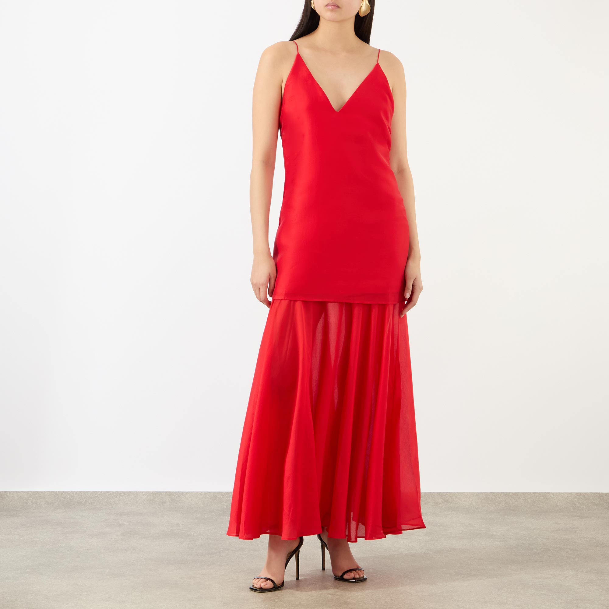 - V-neckline, fine adjustable straps, double layered design, flared semi-sheer skirt, midi length