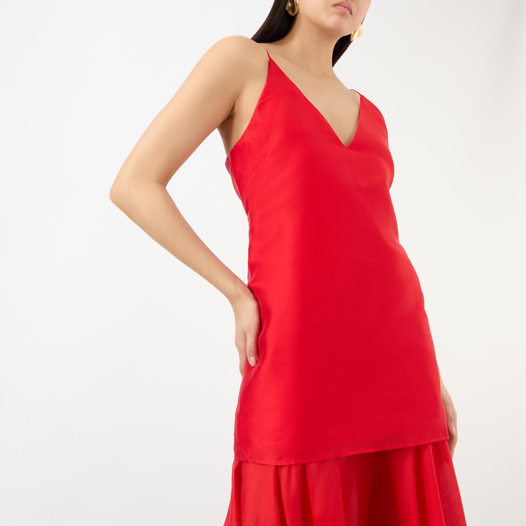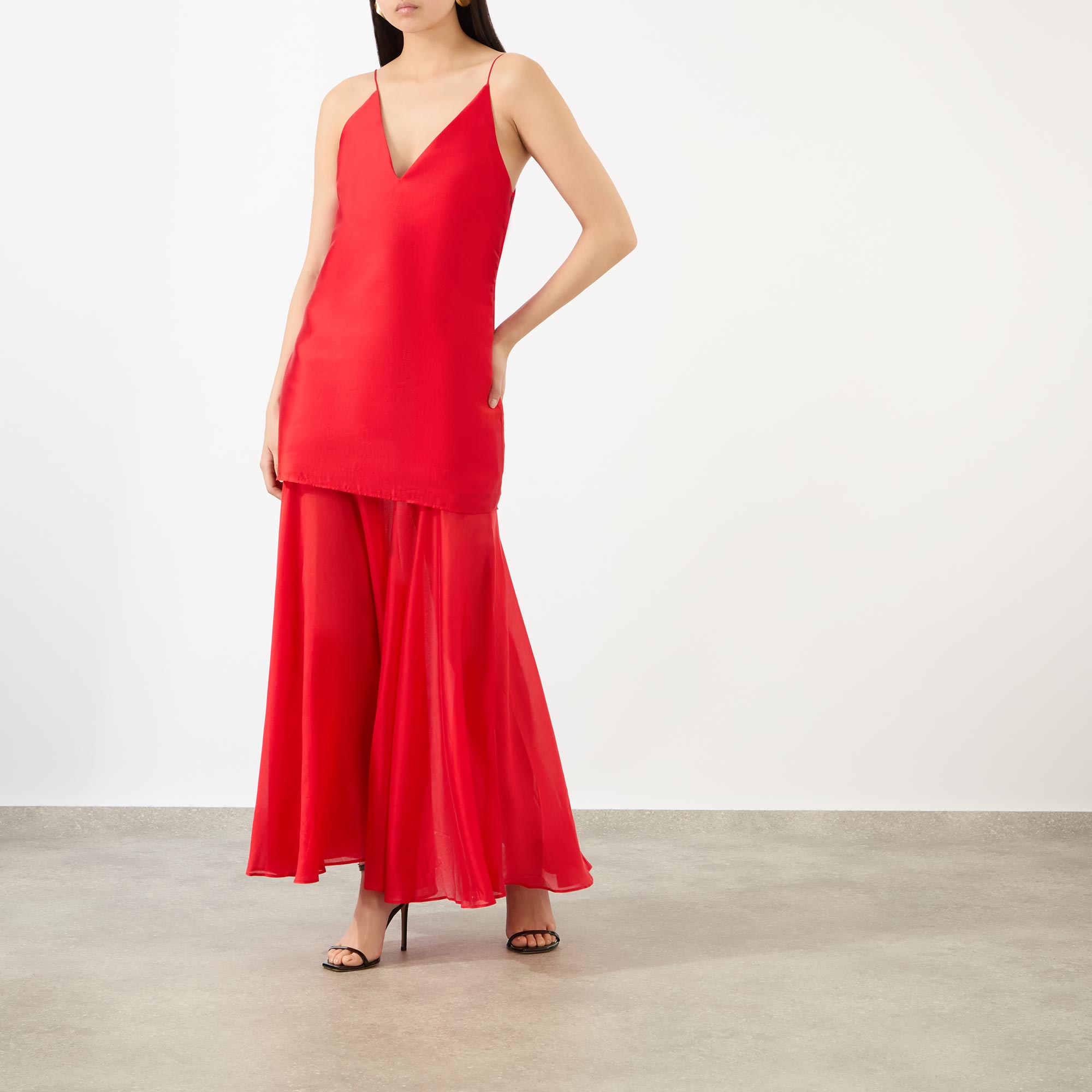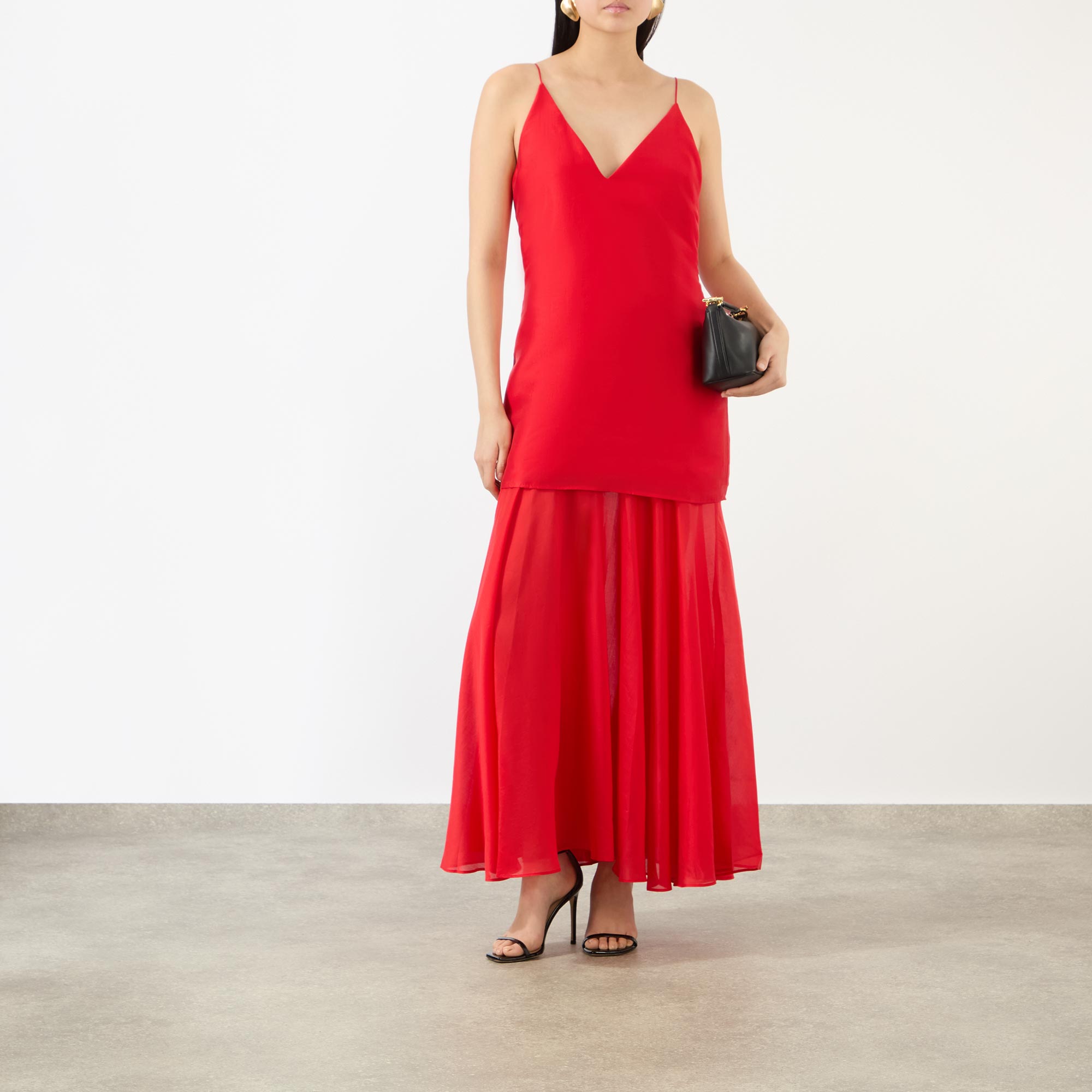 - V-neckline, fine adjustable straps, double layered design, flared semi-sheer skirt, midi length