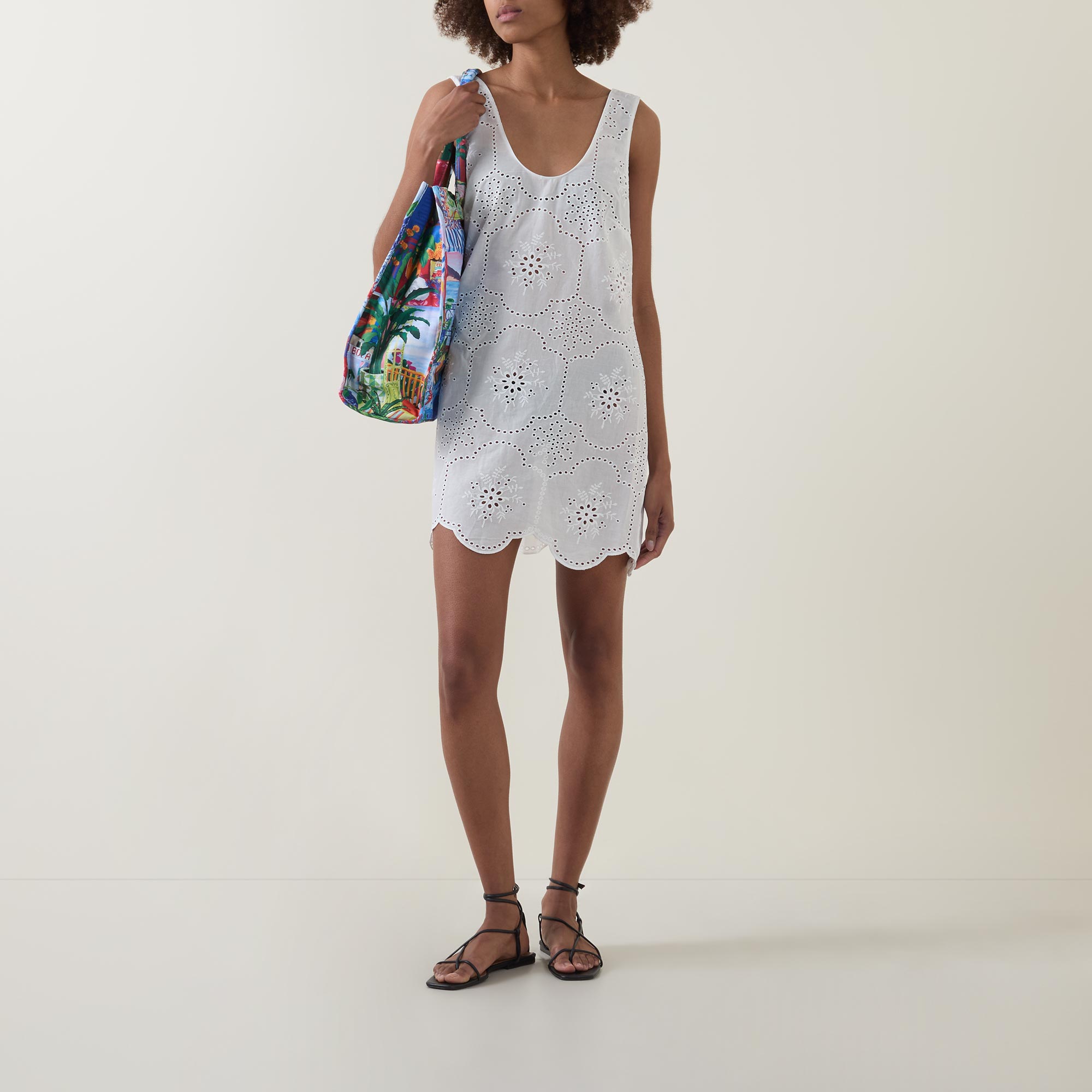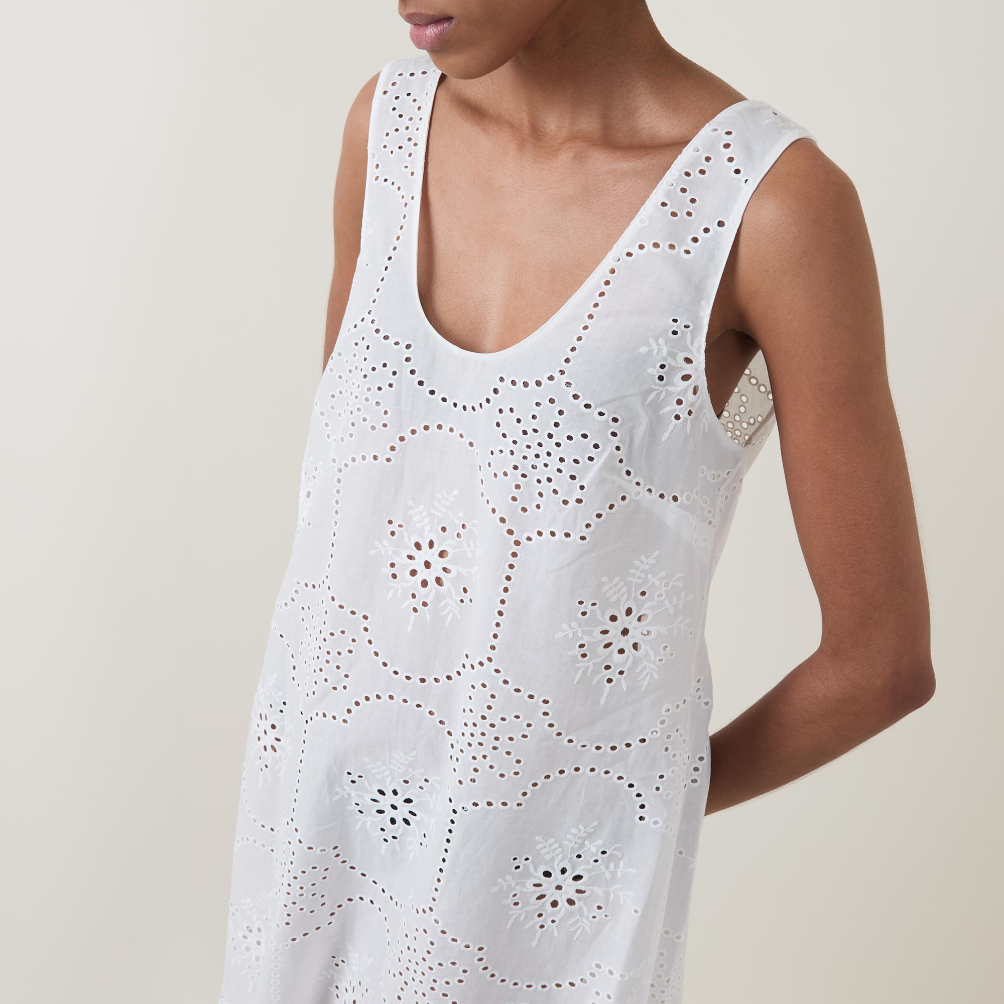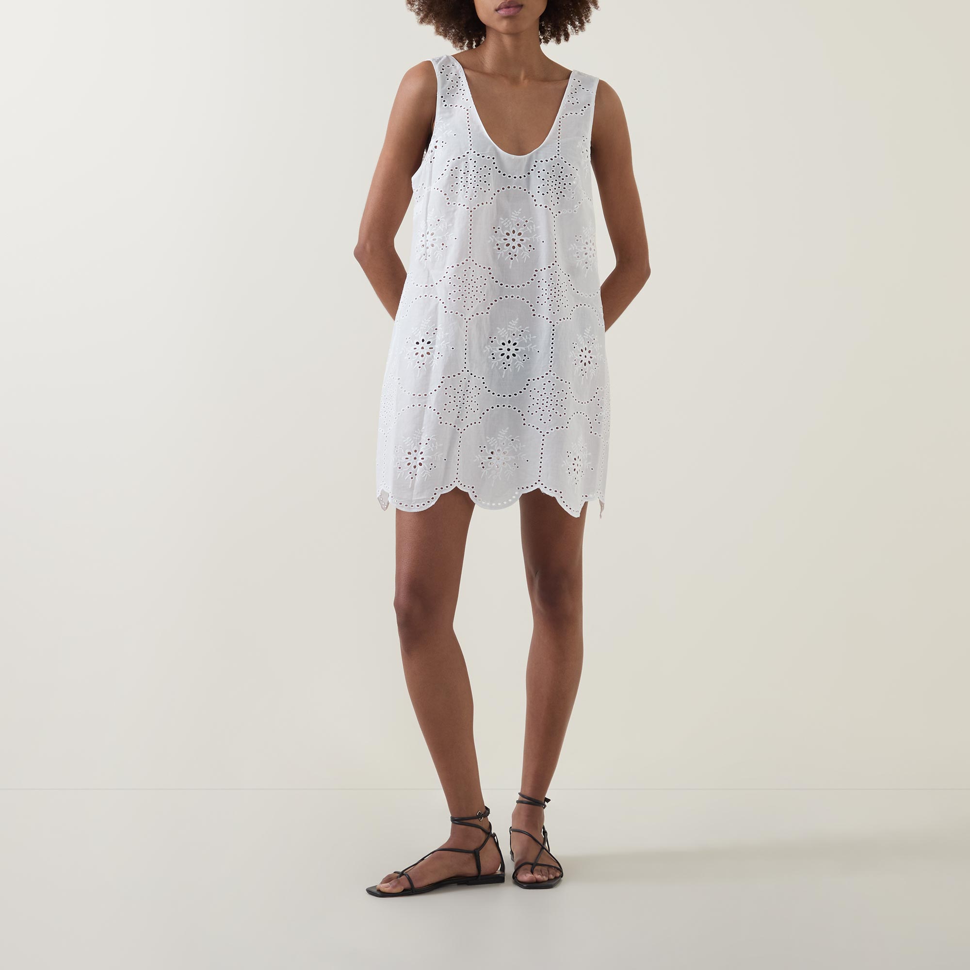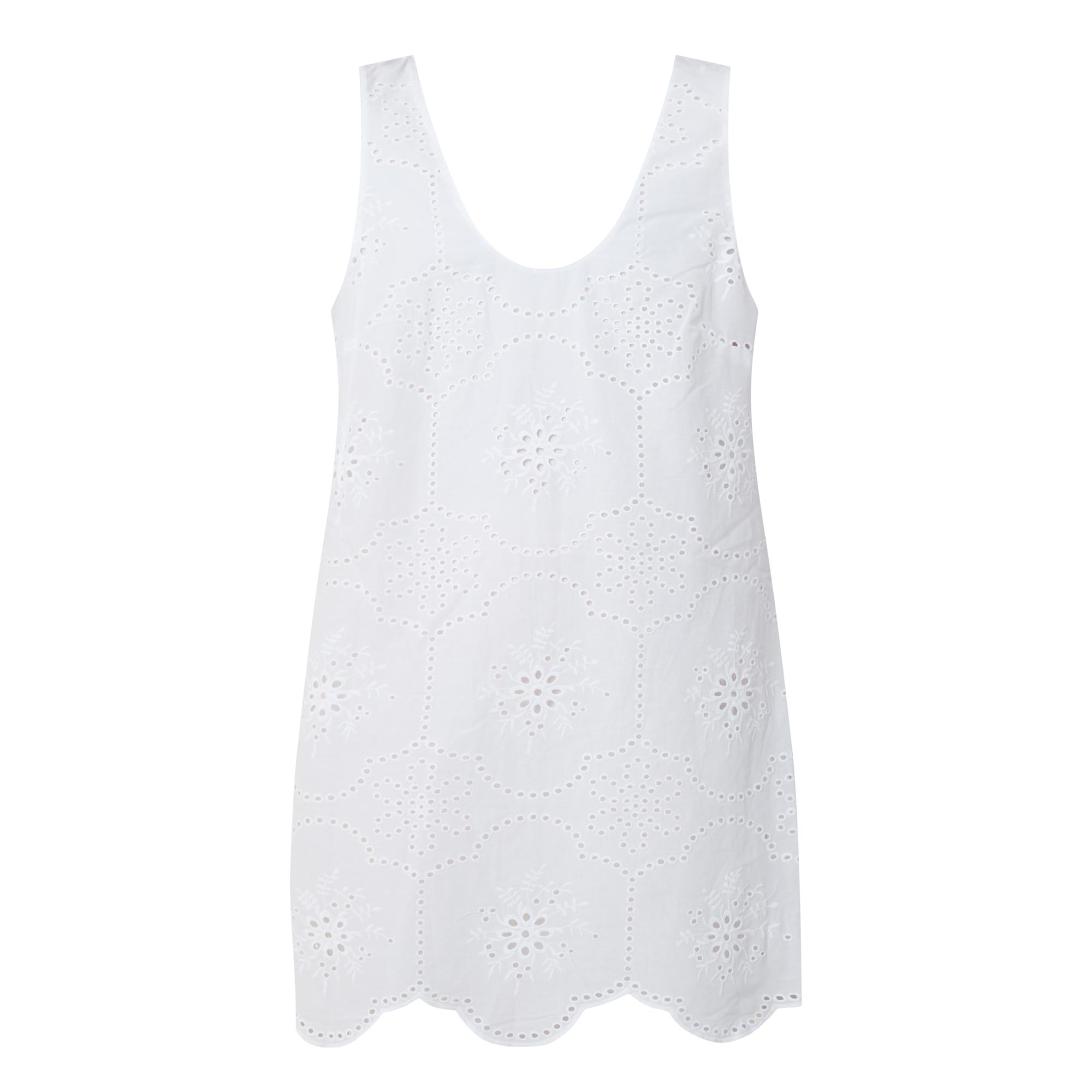 - Sleeveless, scooped neckline, Broderie Anglaise detailing, scalloped hemline, shift silhouette, mini length