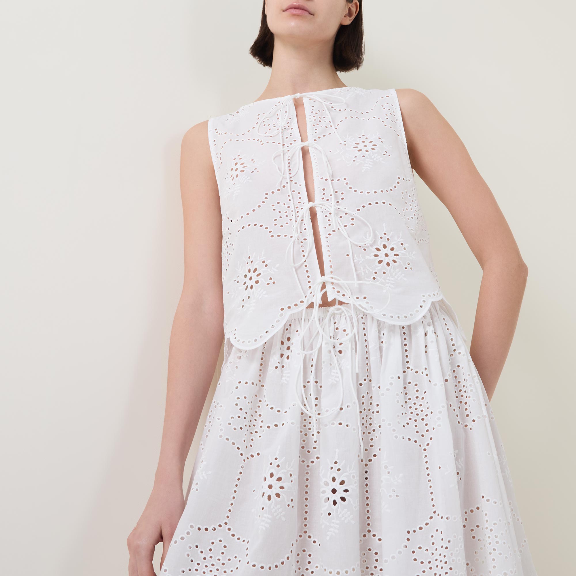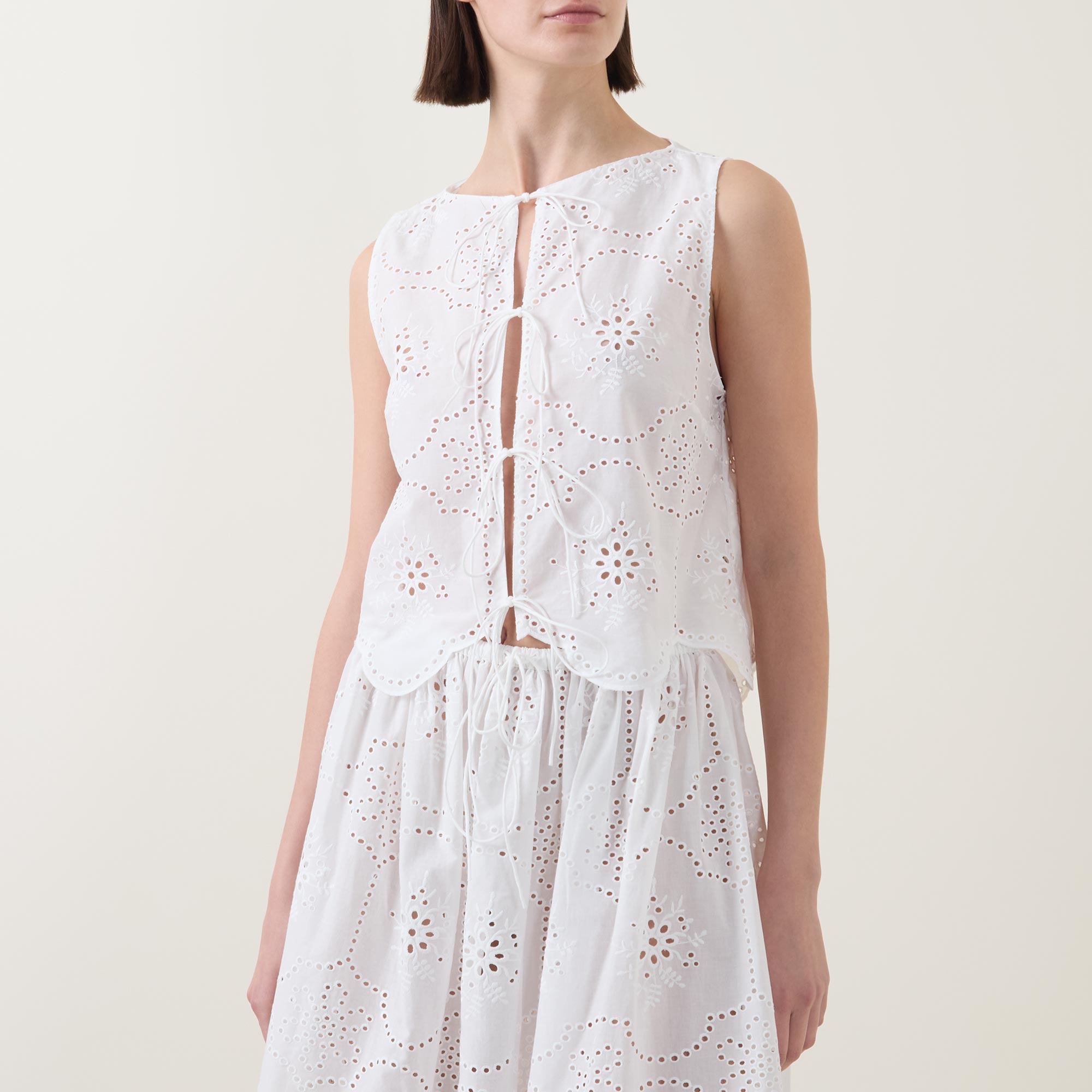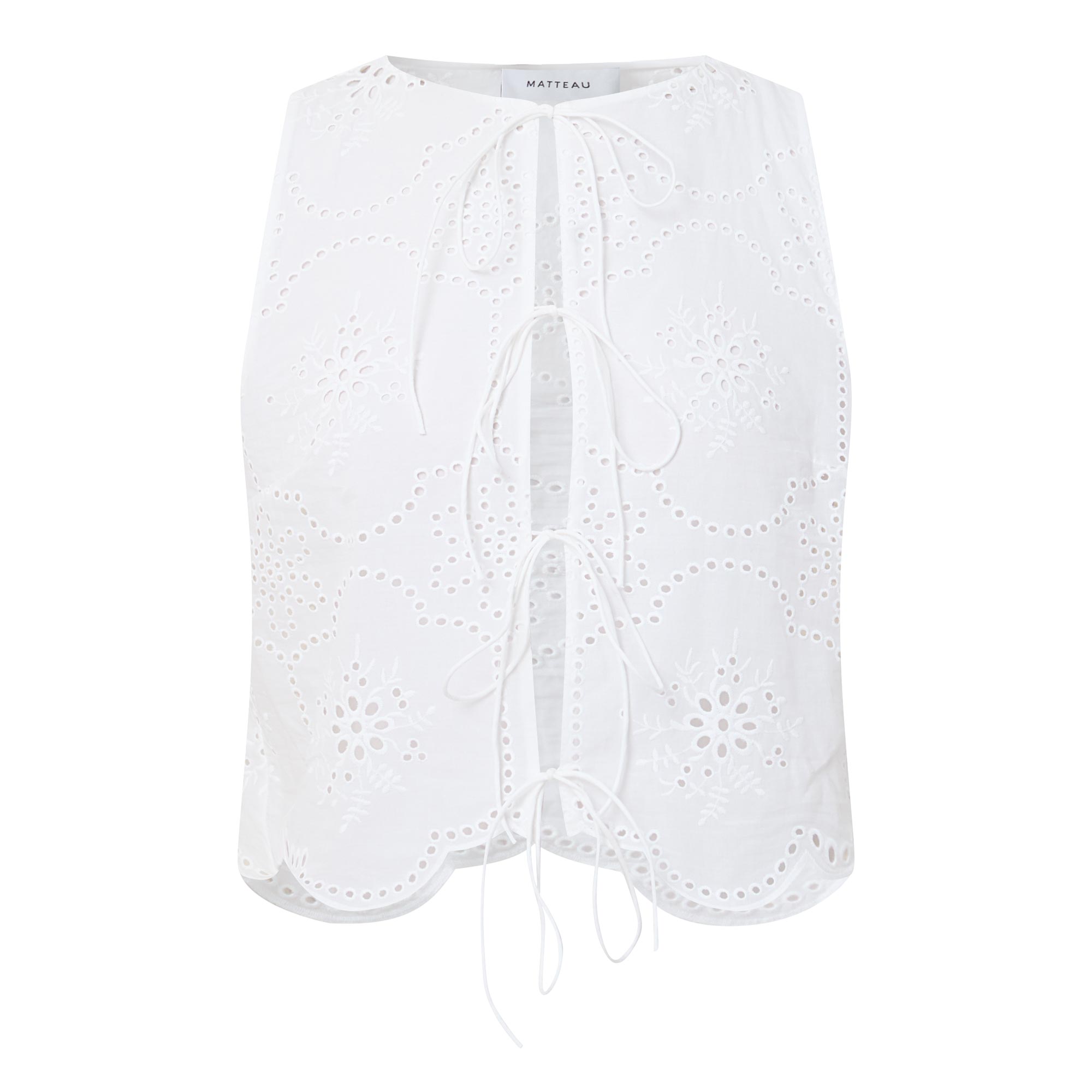 • Round neckline, sleeveless, open front with self-tie fastening, scalloped hem, floral broderie details