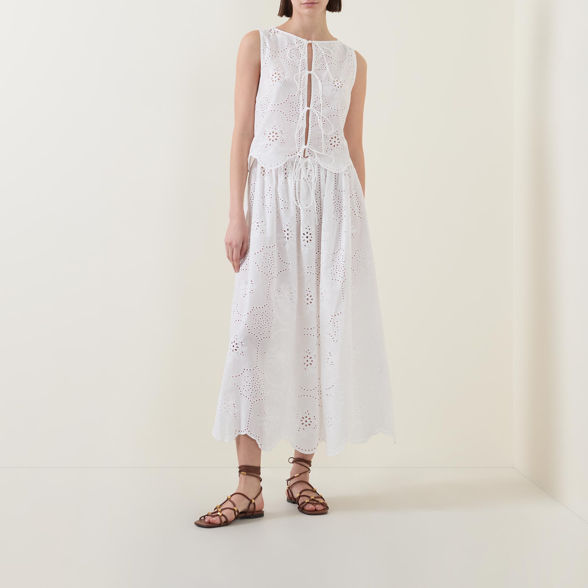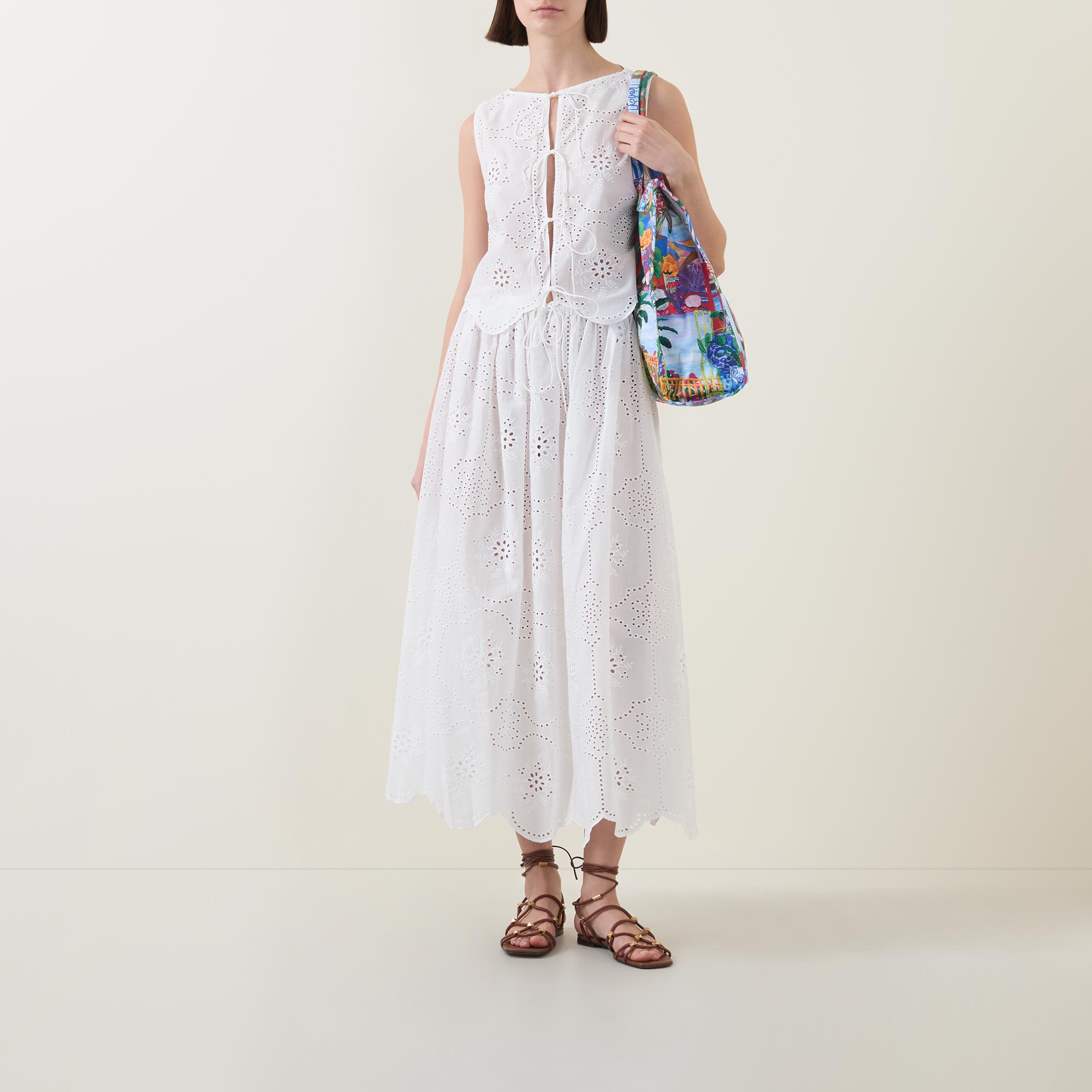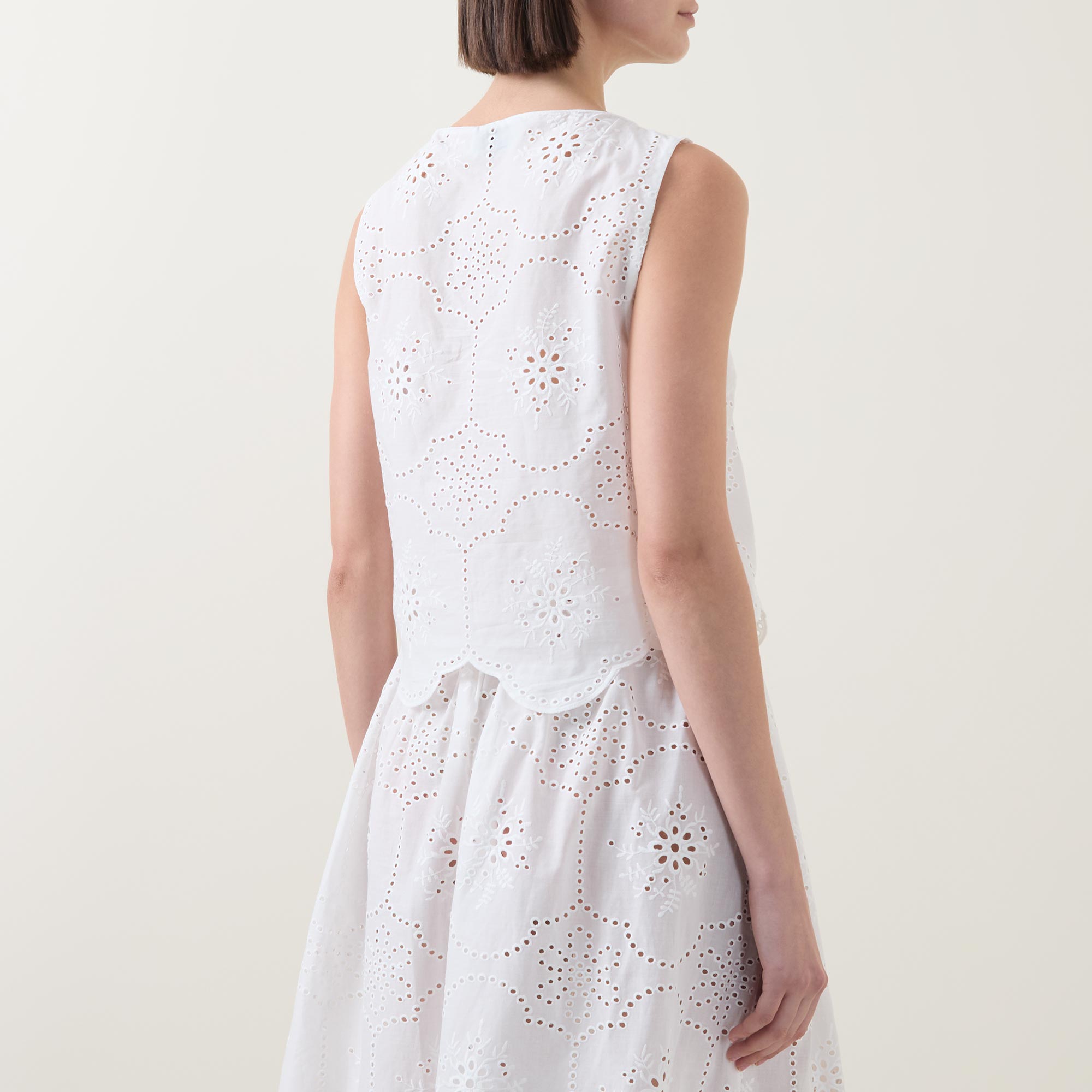 • Round neckline, sleeveless, open front with self-tie fastening, scalloped hem, floral broderie details