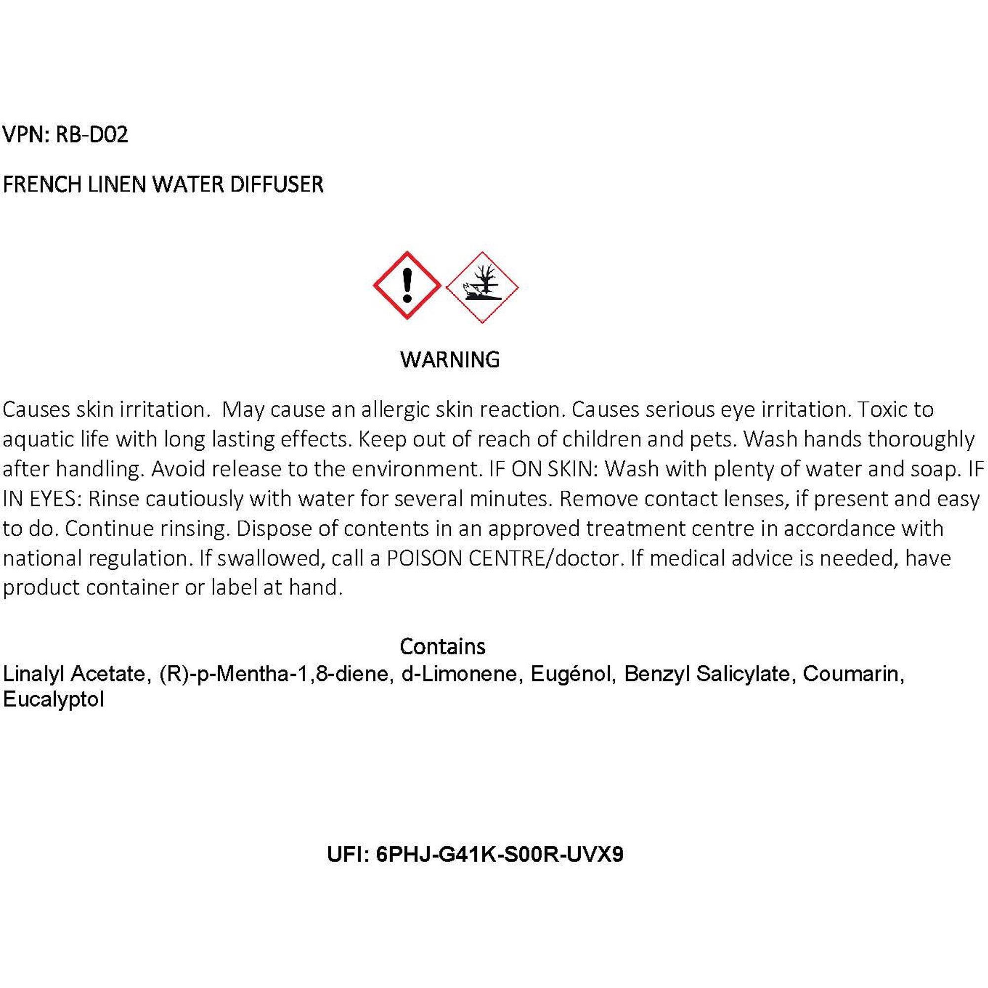- French Linen Water Diffuser Contains: linalyl acetate (CAS No.: 115-95-7) | (R)-p-mentha-1,8-diene, d-limonene (CAS No.: 5989-27-5) |Eugénol (CAS No.: 97-53-0) | Benzyl salicylate (CAS No.: 118-58-1) | Coumarin (CAS No.: 91-64-5) | Eucalyptol (CAS No.: 470-82-6)