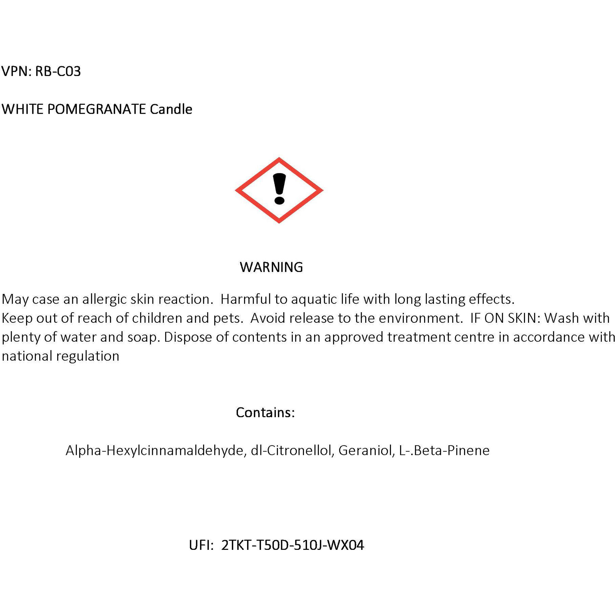 - White Pomegranate Diffuser Contains: Hexyl cinnamal (CAS No.: 101-86-0) | dl-Citronellol (CAS No.: 106-22-9) | α-methyl-1,3-benzodioxole-5-propionaldehyde (CAS No.: 1205-17-0) | beta-pinene (CAS No.: 127-91-3)